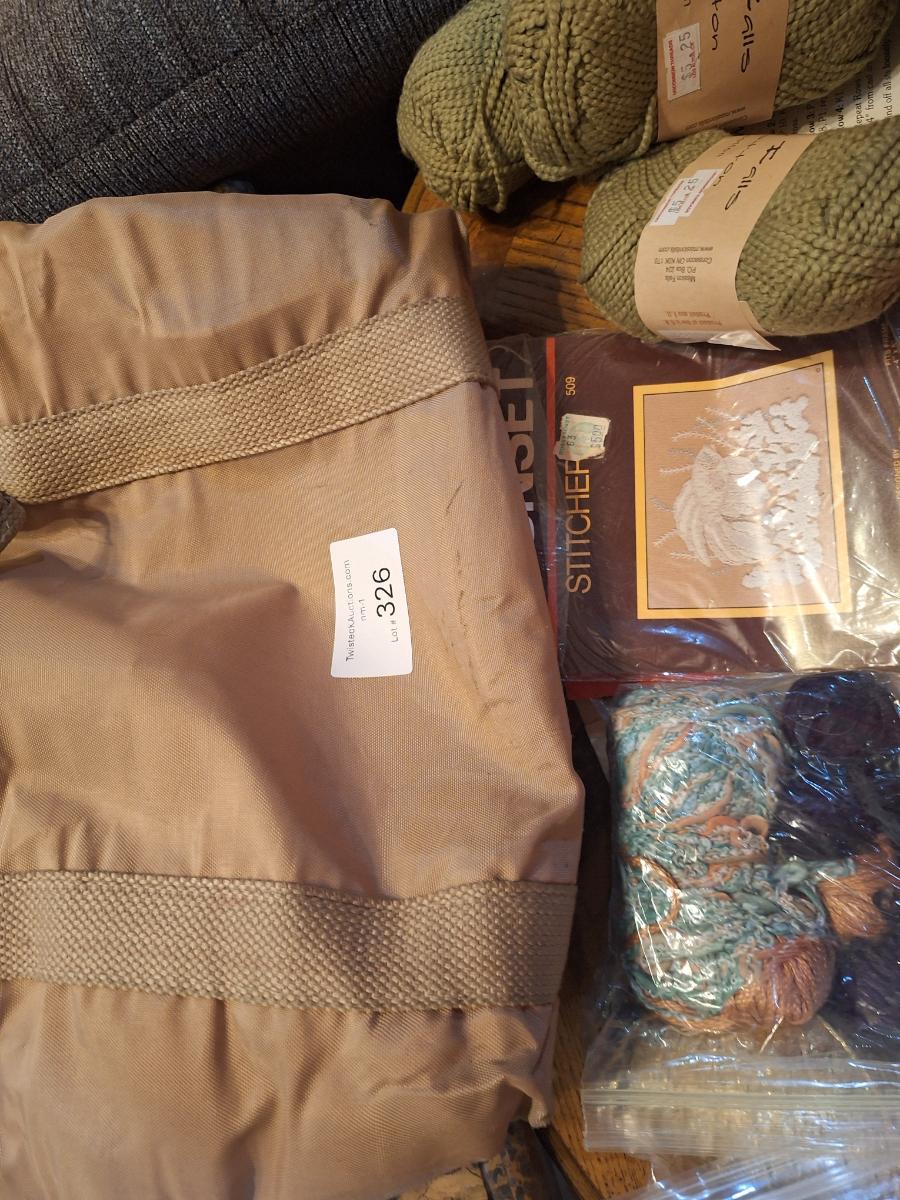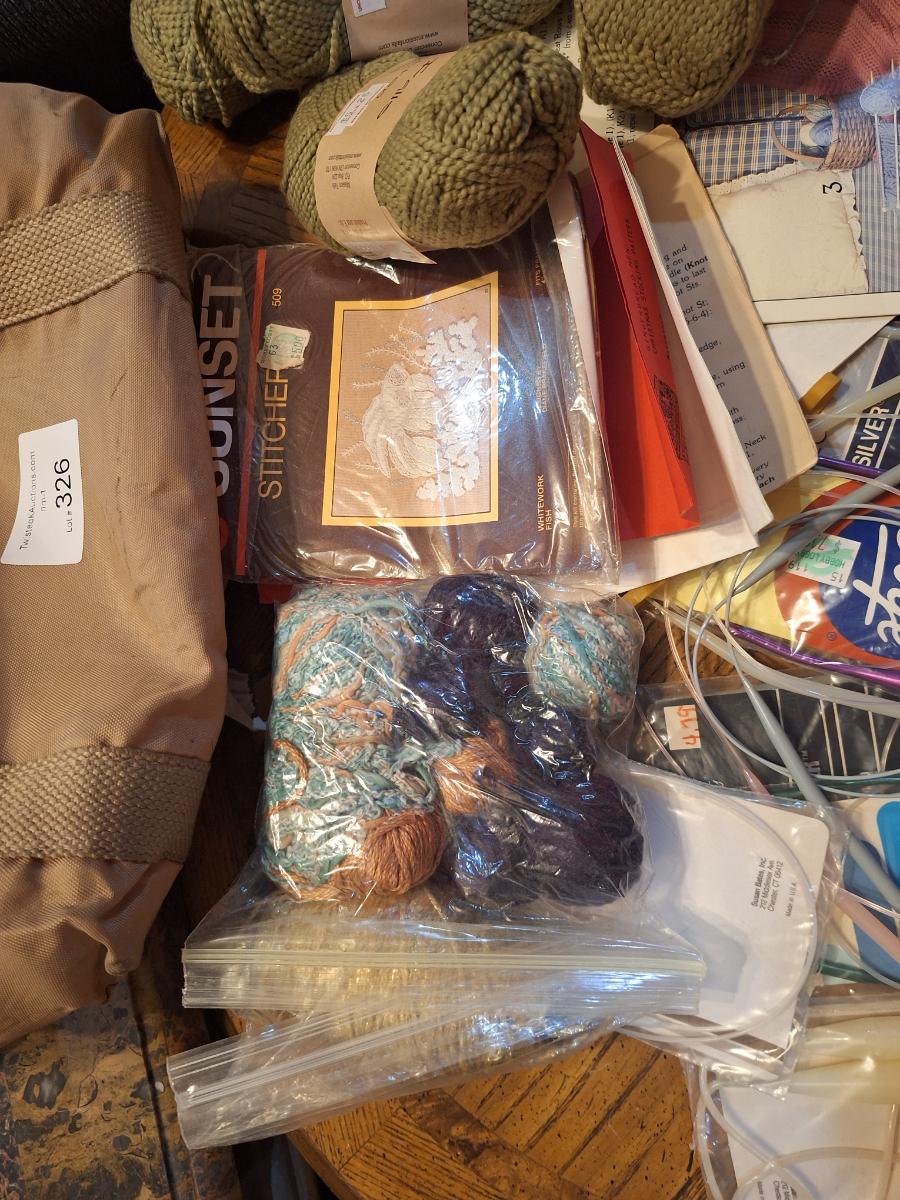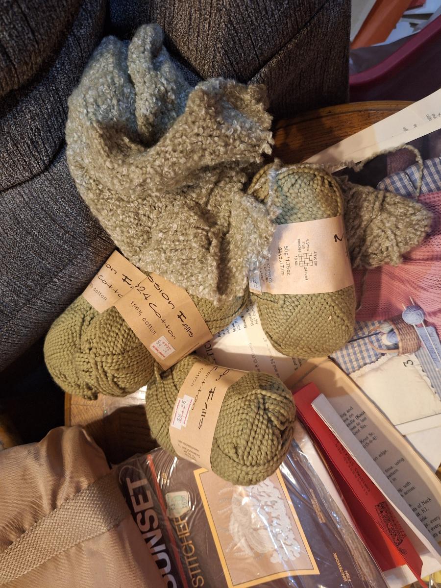 assortment of knitting or crocheting supplies, needles, little bit of yard and a few patterns