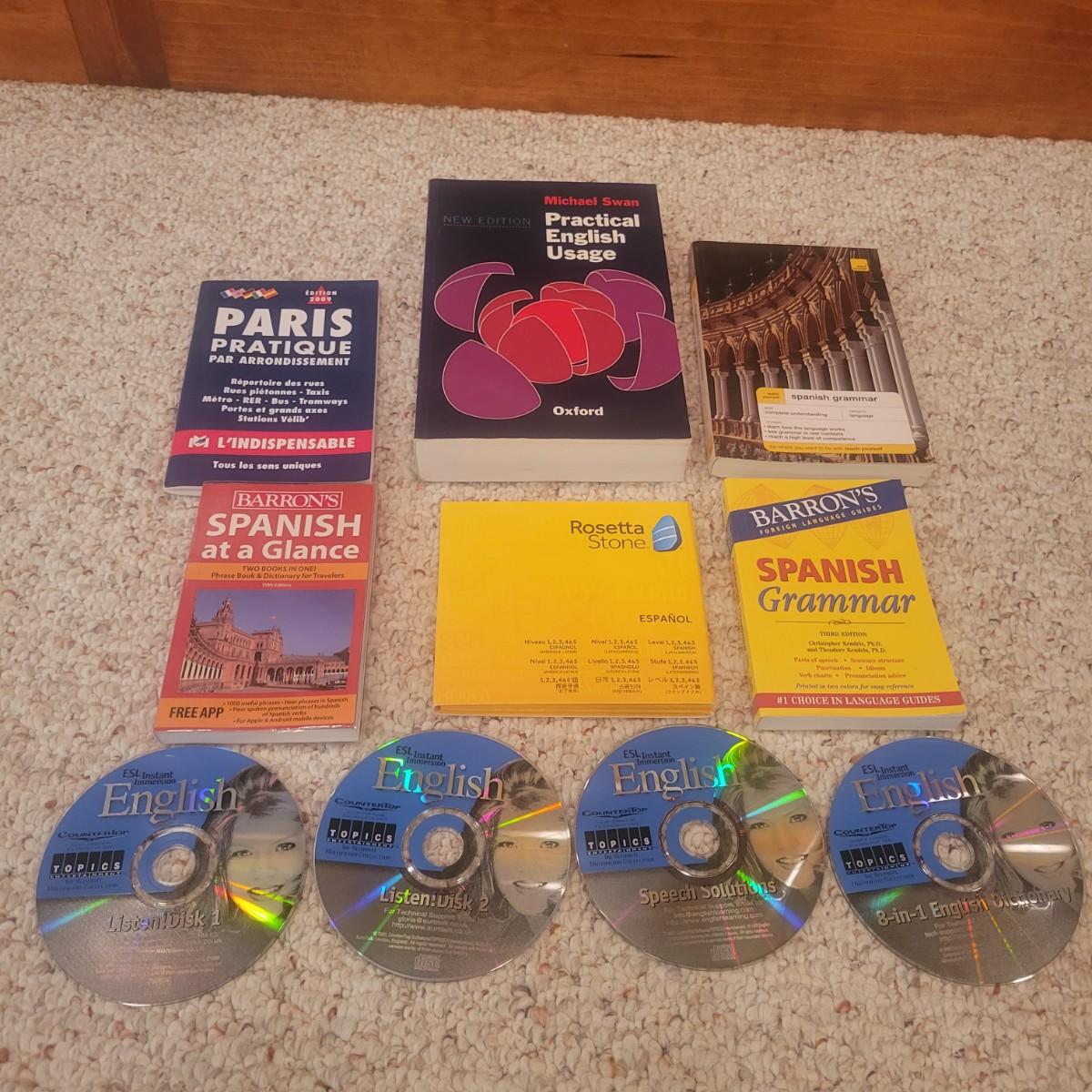 An assortment of books and CDs on learning languages. Includes materials by Rosetta Stone and has books on a variety of languages. Shipping available