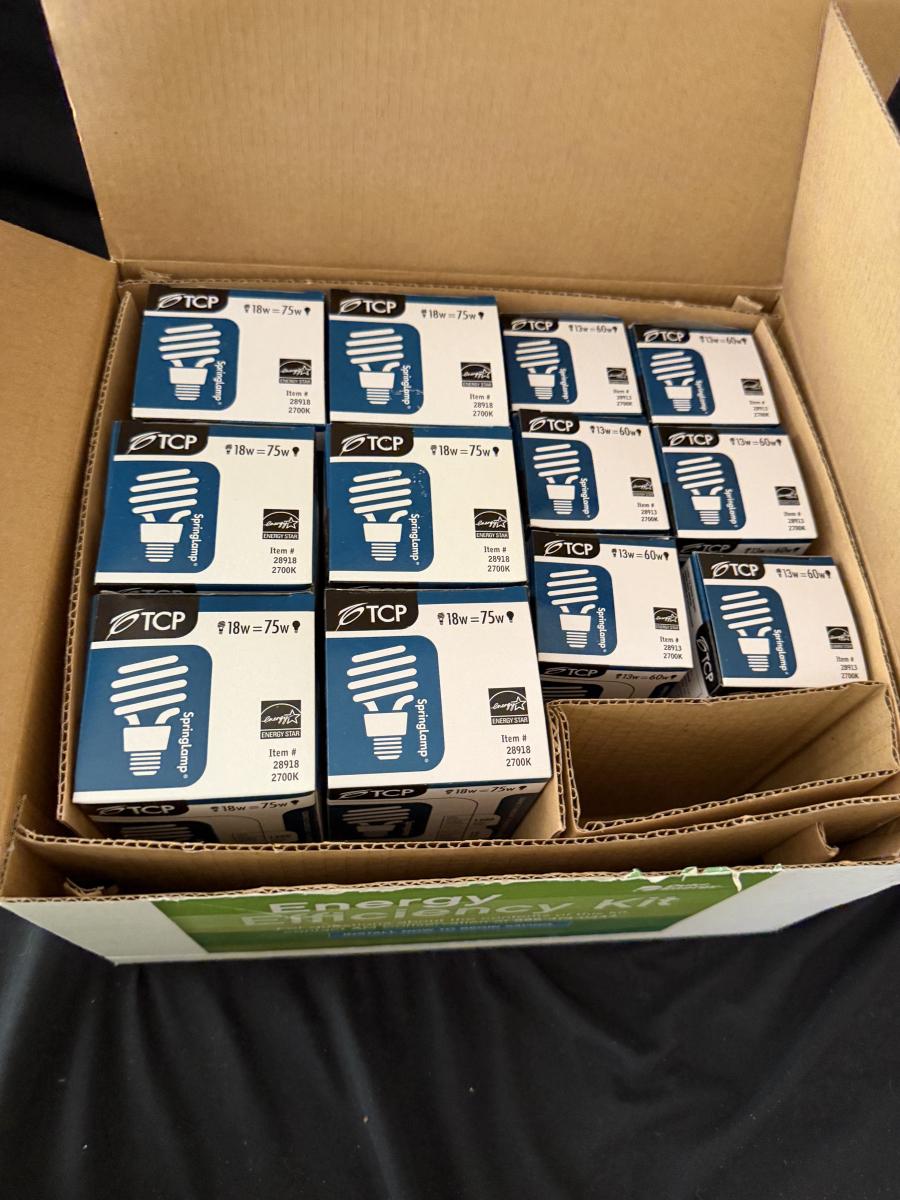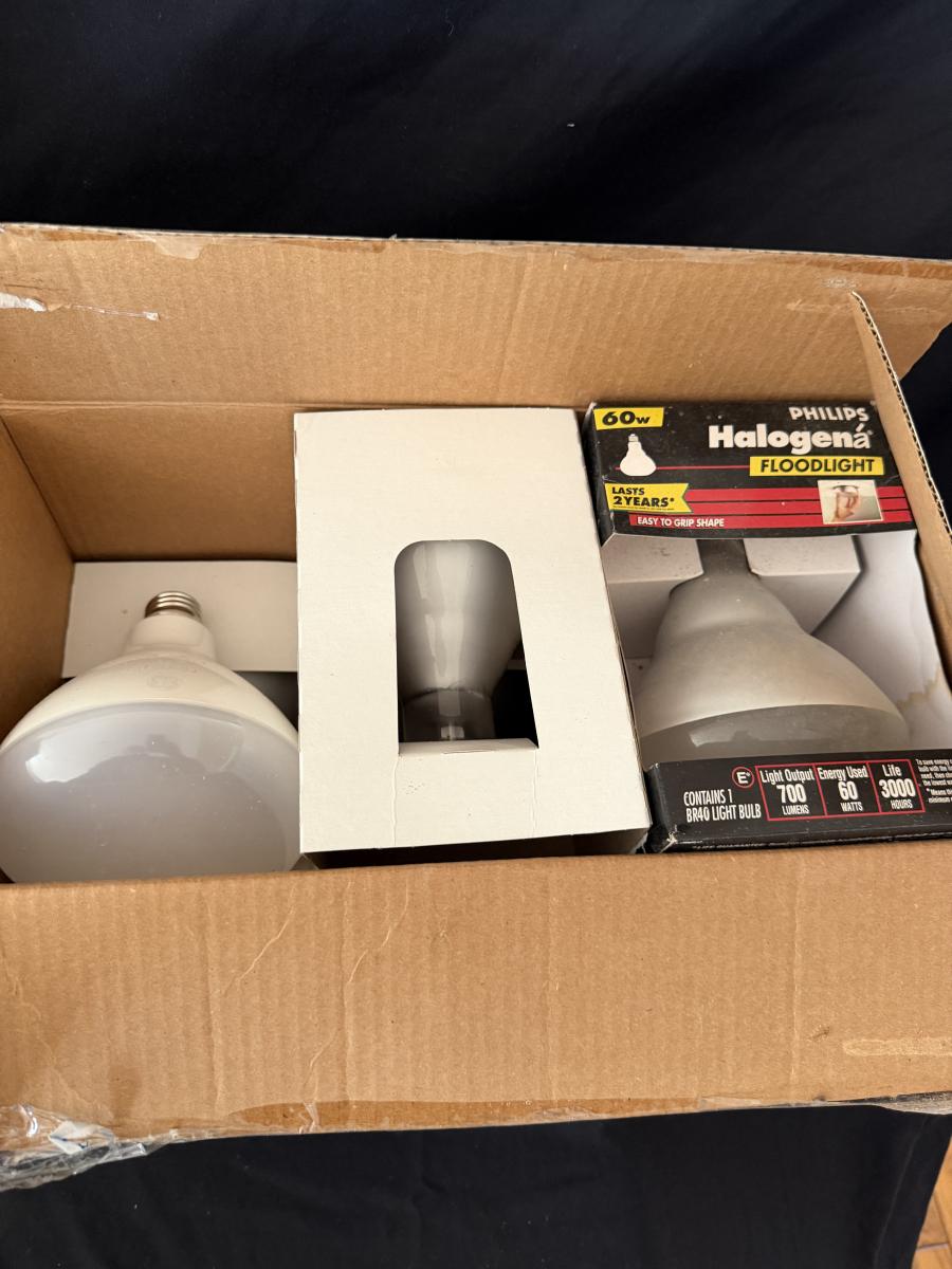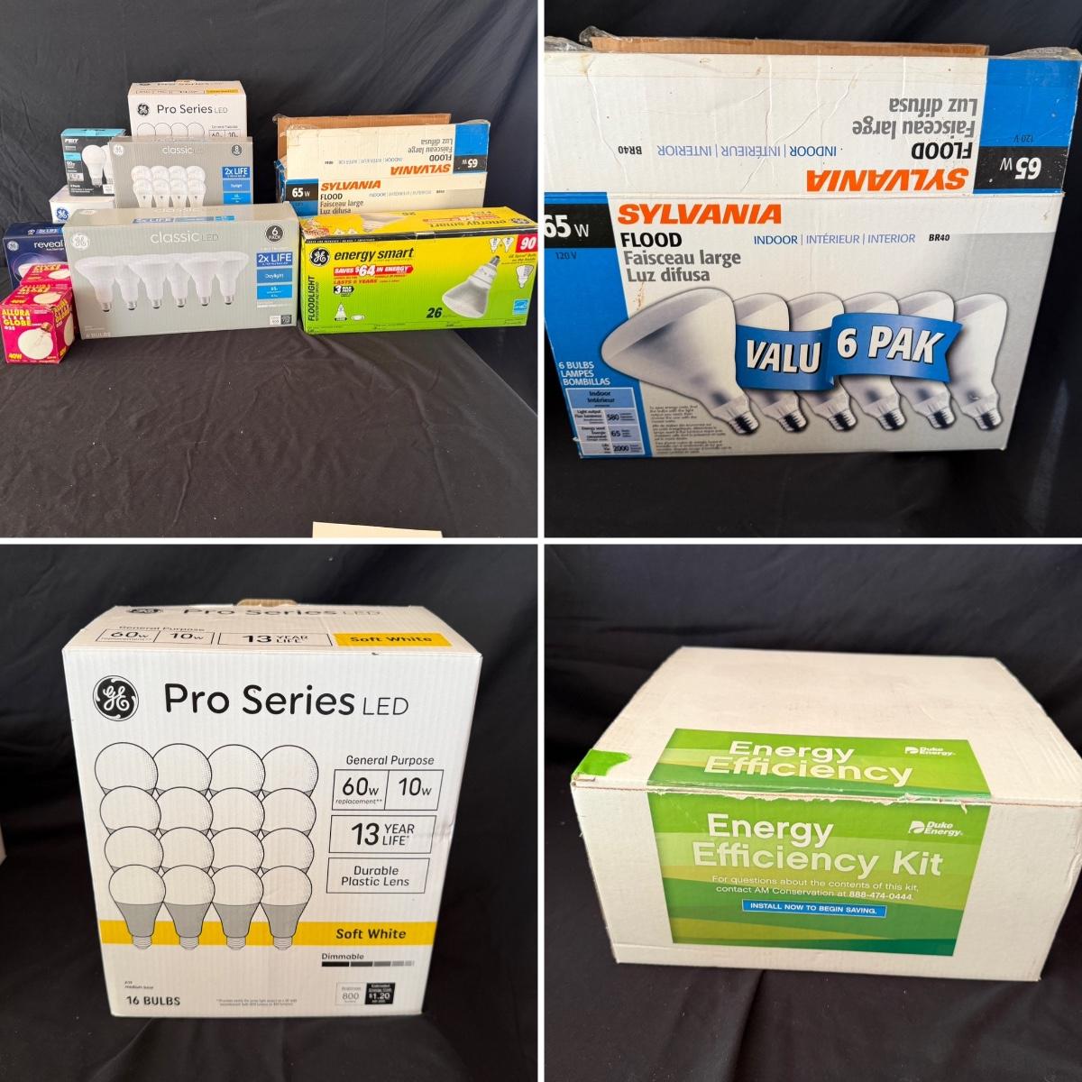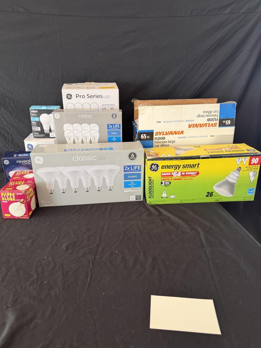 Lot contains an assortment of light bulbs including LED, CFL & Incandescent. Bulbs are floodlights, globe bulbs, heat lamp and more.