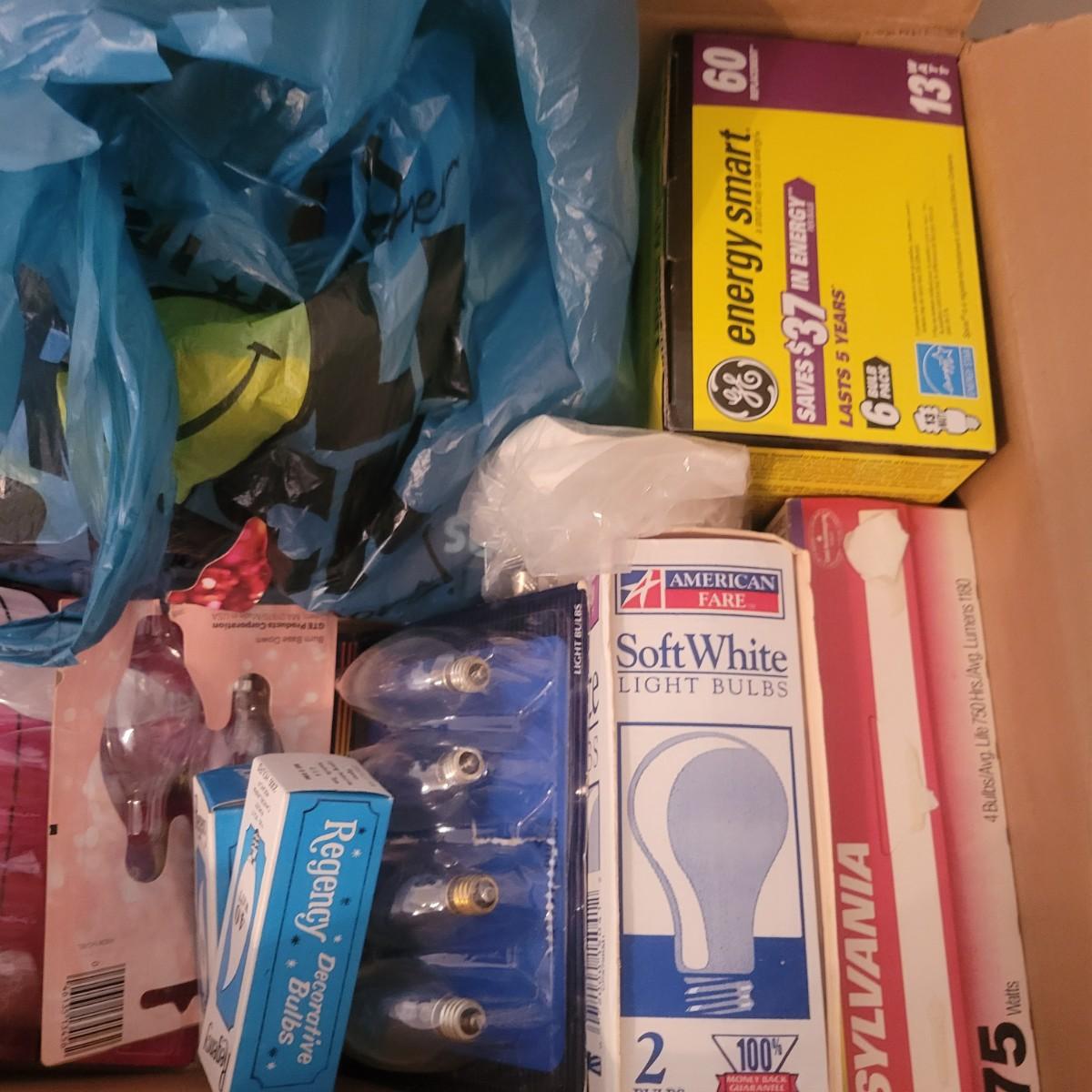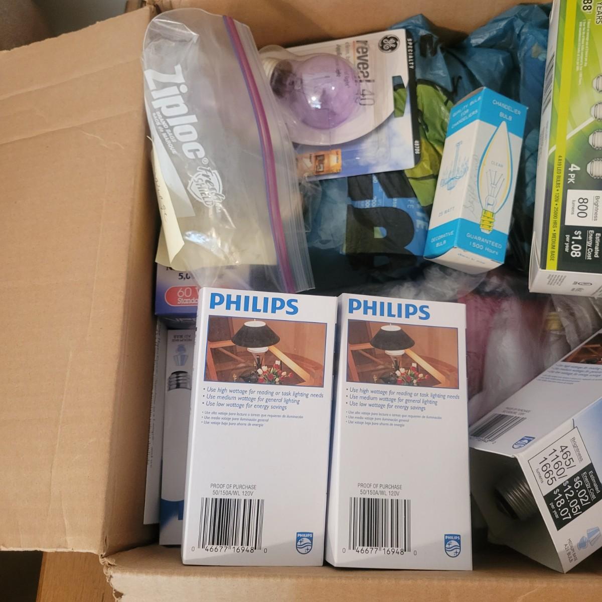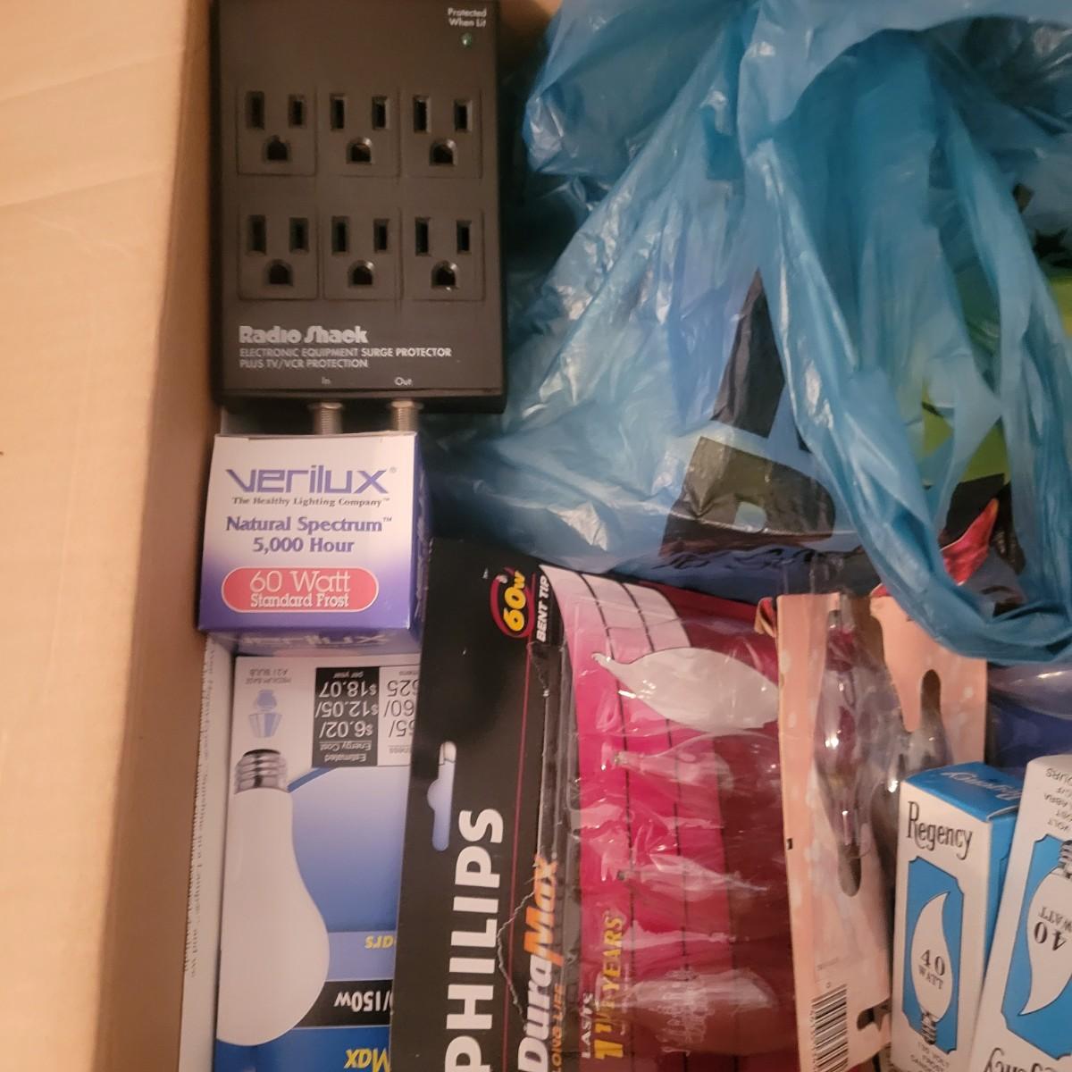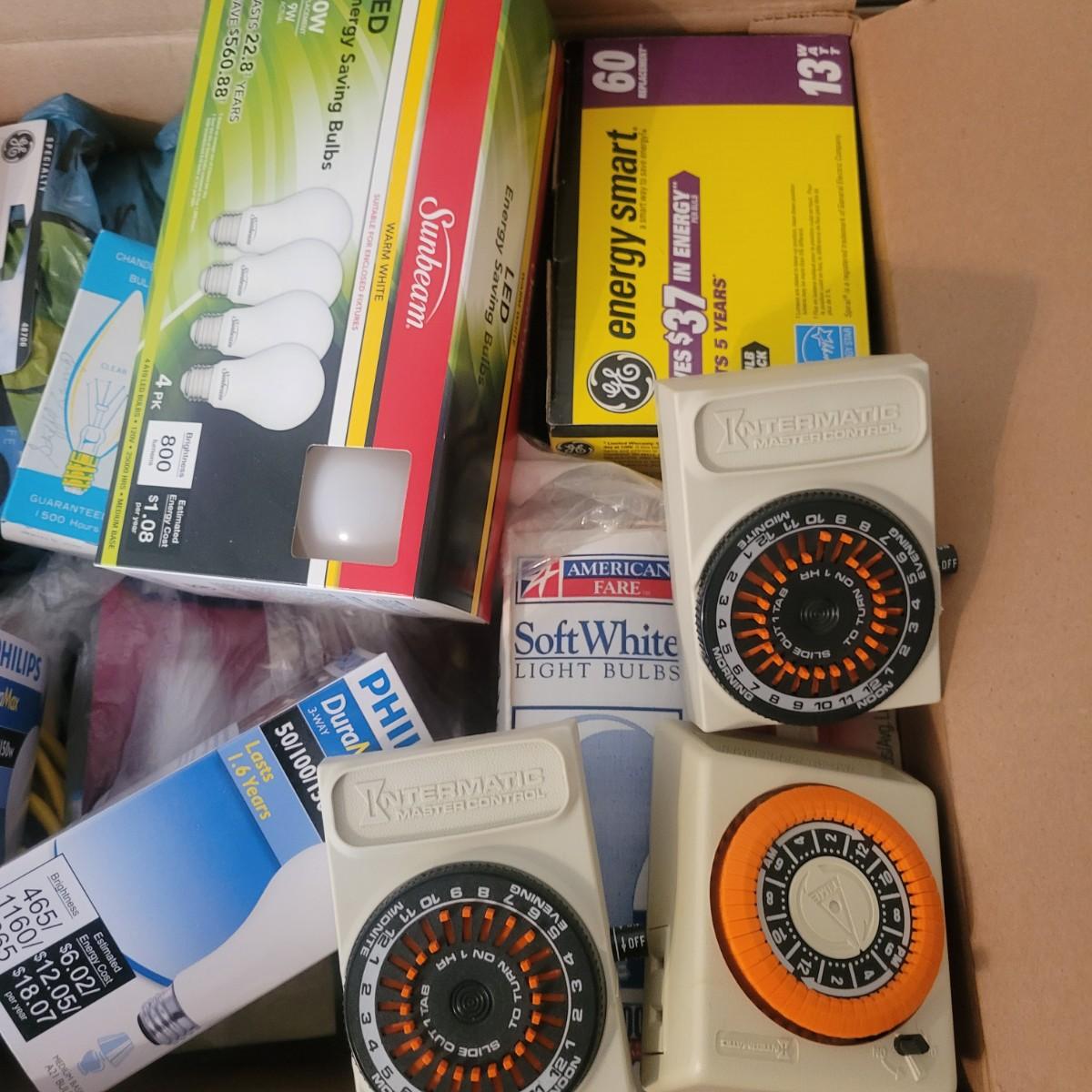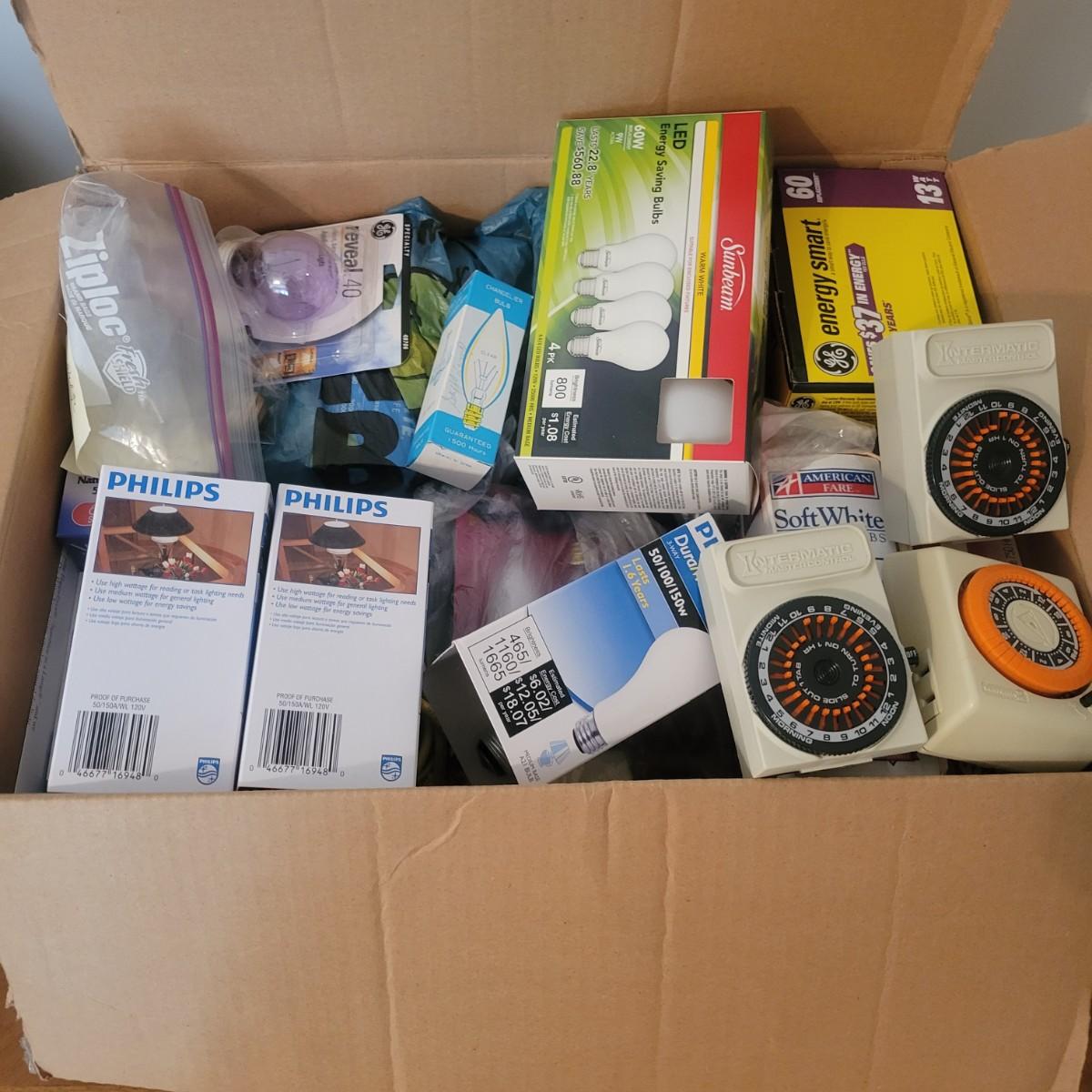 An assortment of lightbulbs and timers. Bulbs range from led 60w standard bulbs to 25w chandelier bulbs and a variety of other types and sizes. Also includes three timers and a surge protector. Local pickup only
