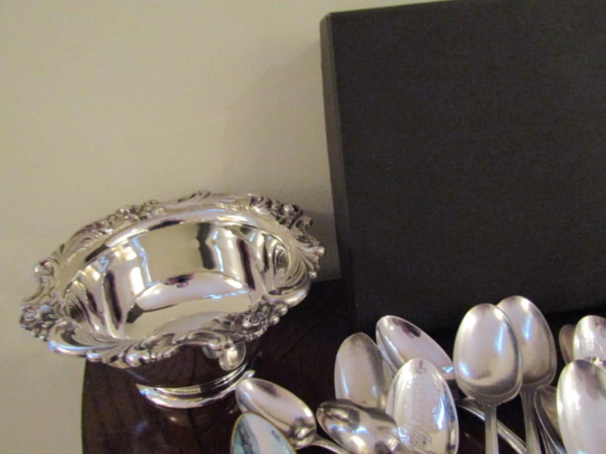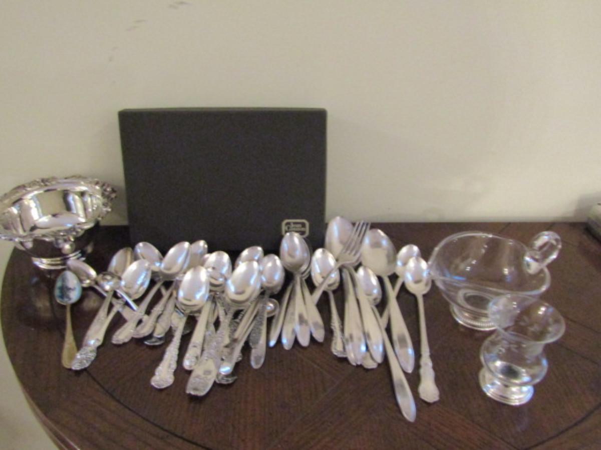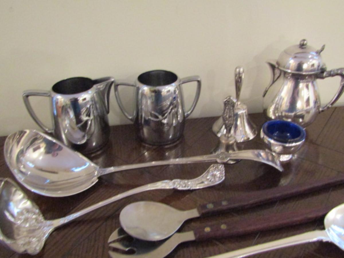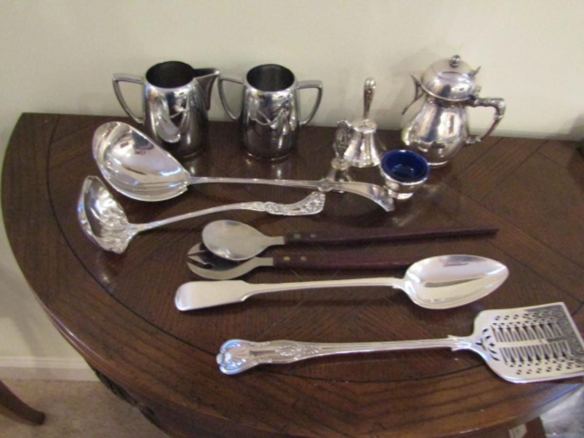 Assortment of Metal and Silver Plated Serve Ware. Please see all pictures for selection- spoons (both serving and souvenir), condiment dishes, tongs, spatulas, ladles, bowls, etc.