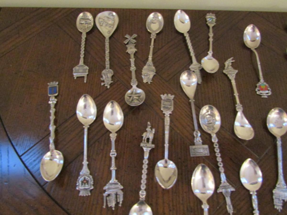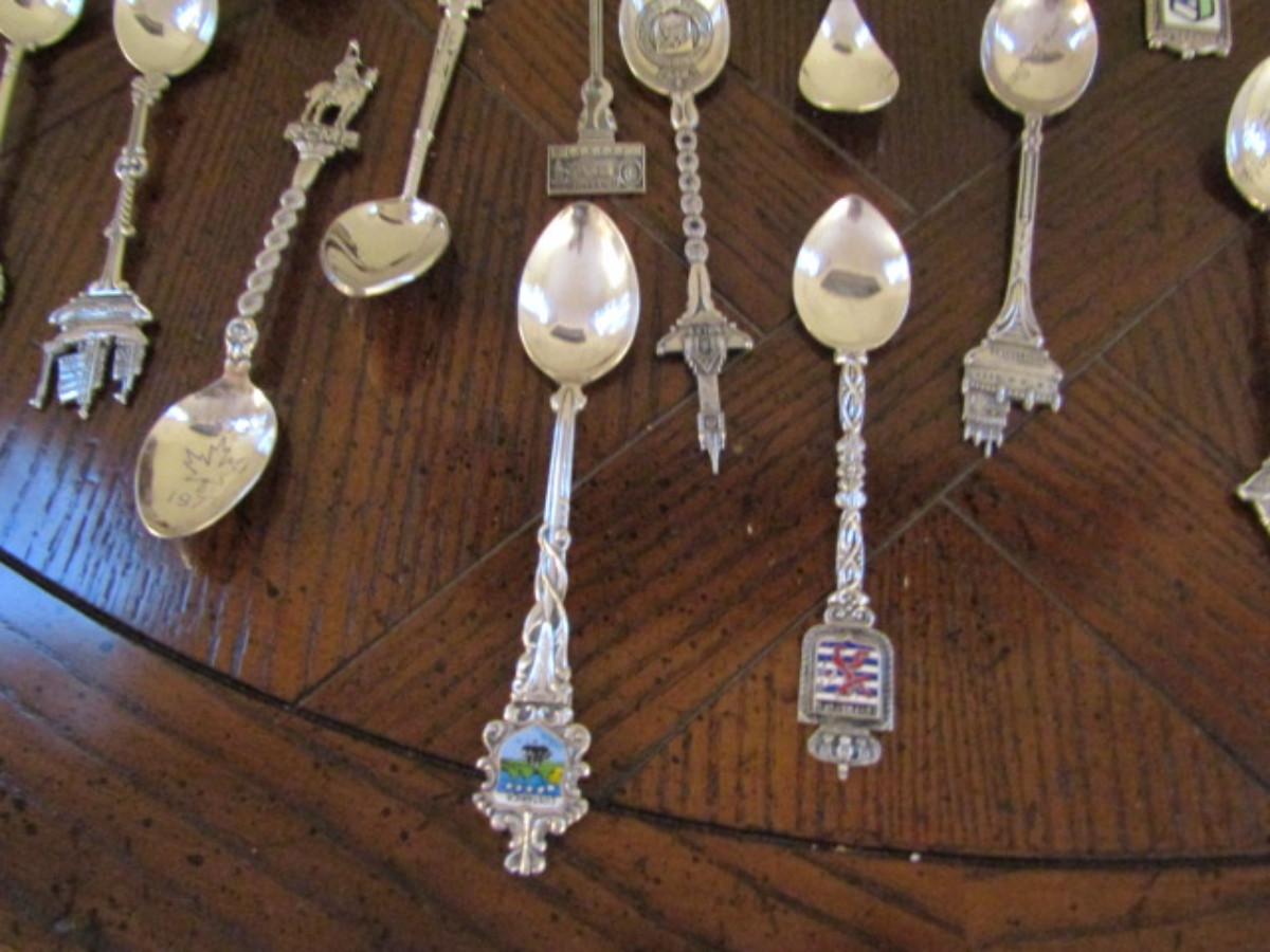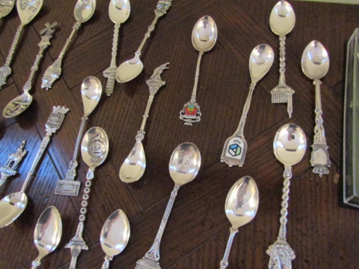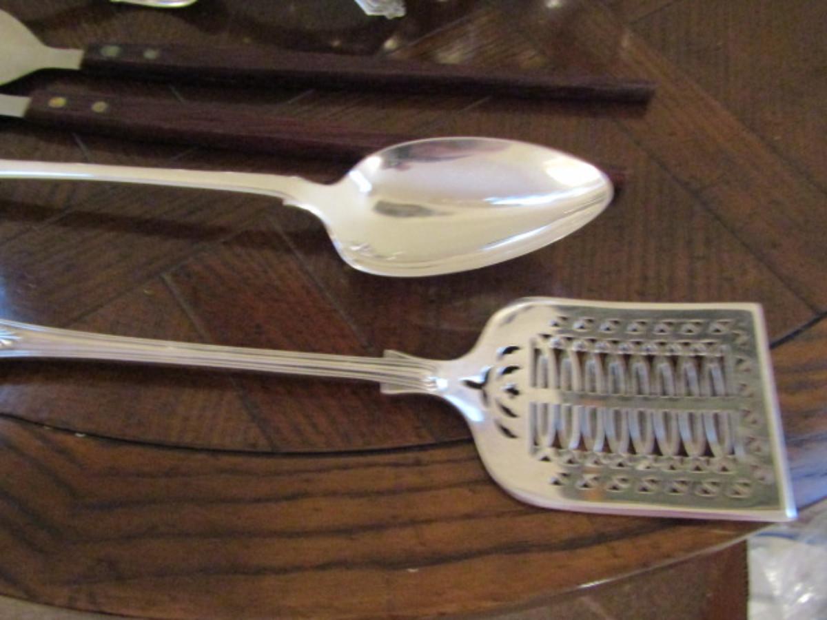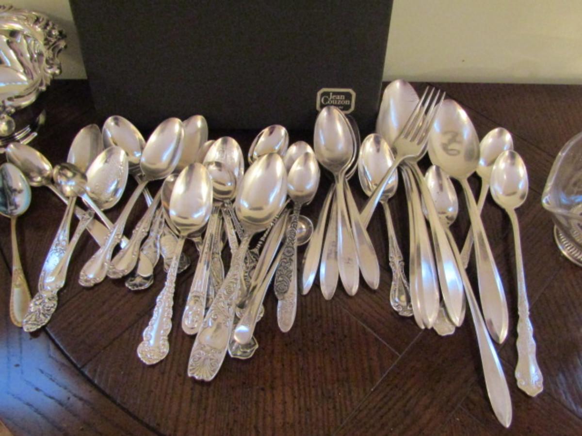 Assortment of Metal and Silver Plated Serve Ware. Please see all pictures for selection- spoons (both serving and souvenir), condiment dishes, tongs, spatulas, ladles, bowls, etc.