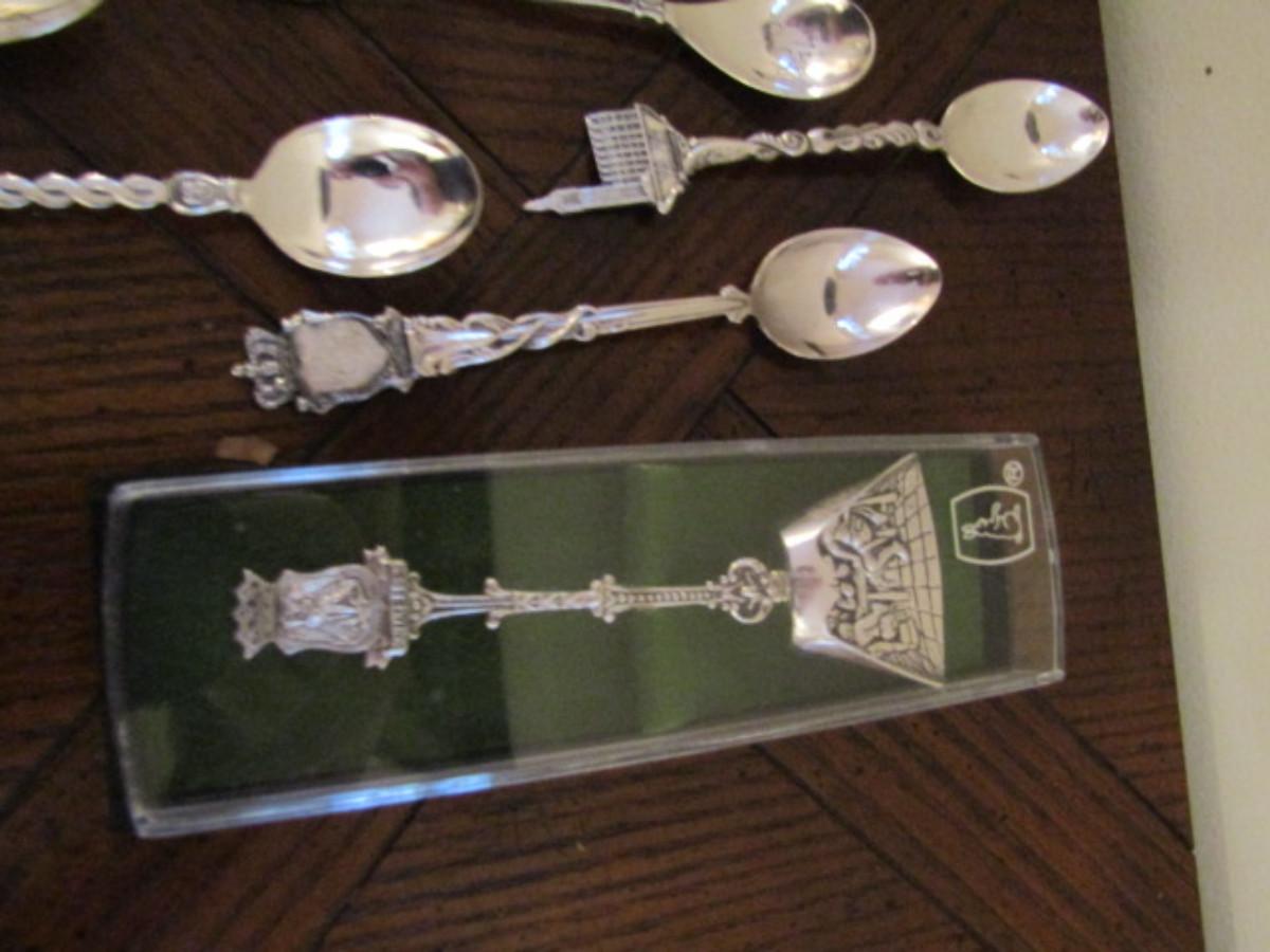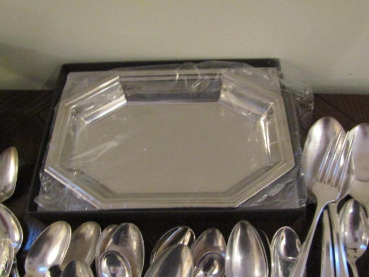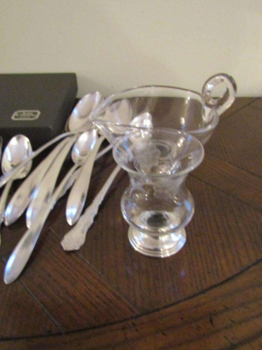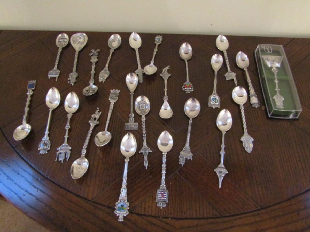 Assortment of Metal and Silver Plated Serve Ware. Please see all pictures for selection- spoons (both serving and souvenir), condiment dishes, tongs, spatulas, ladles, bowls, etc.
