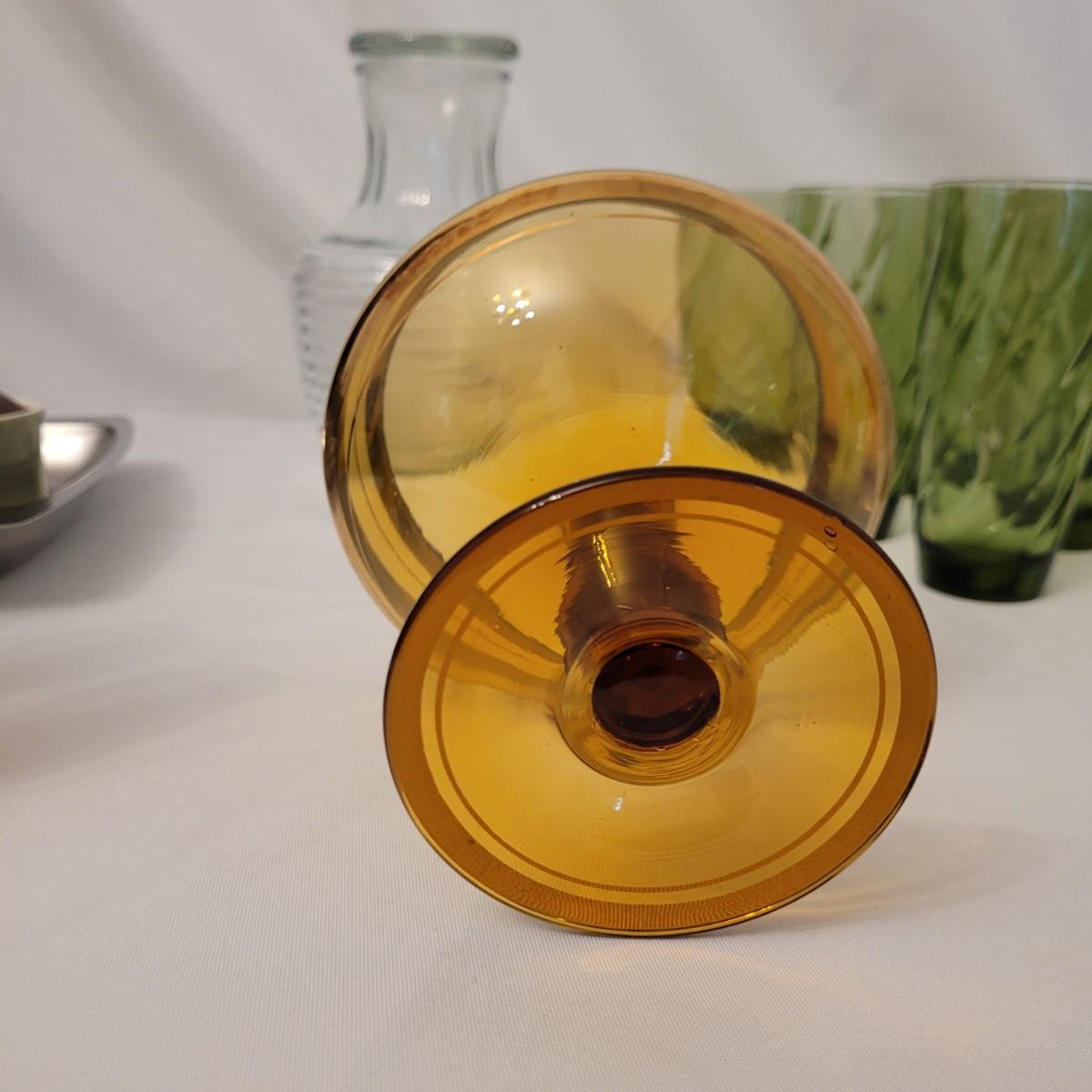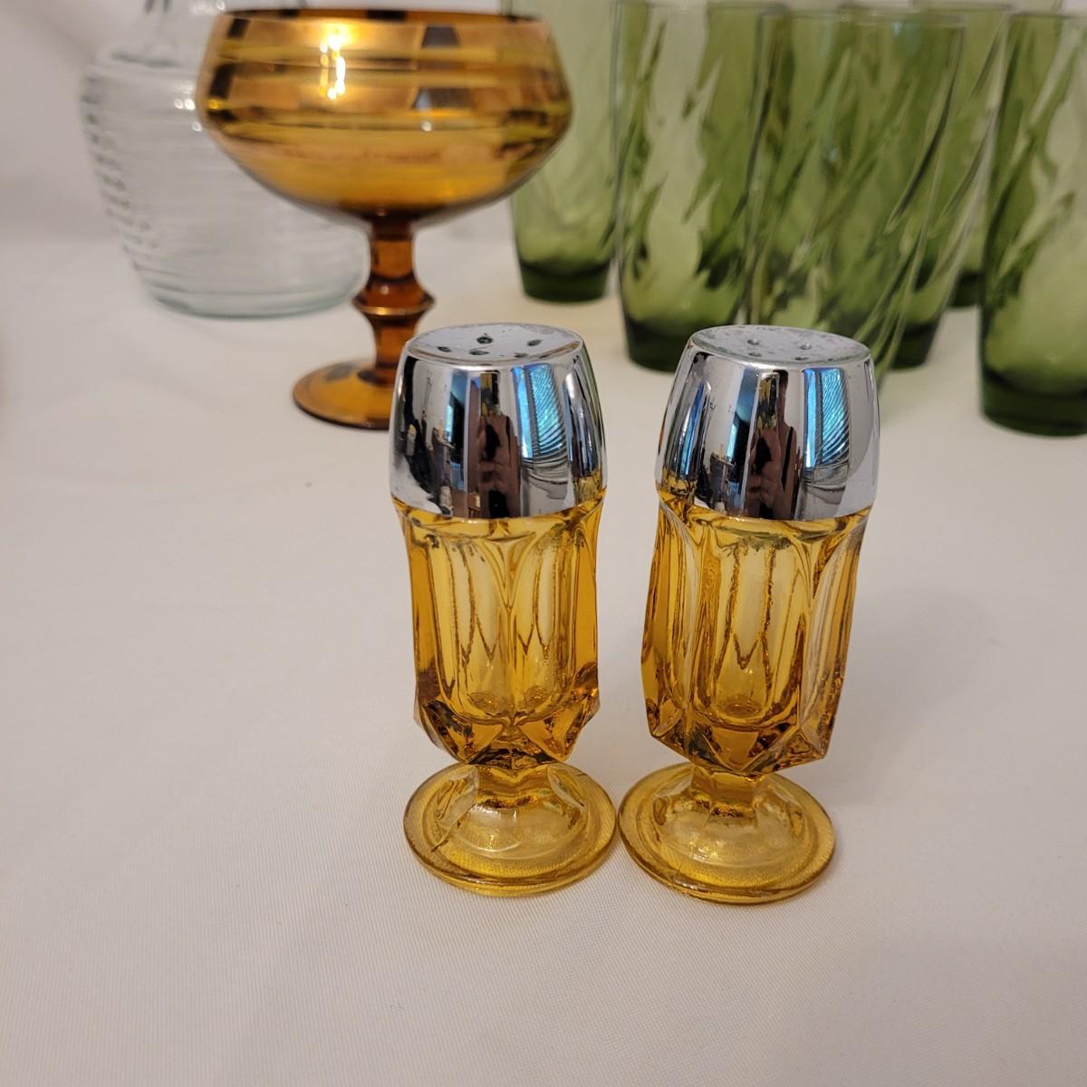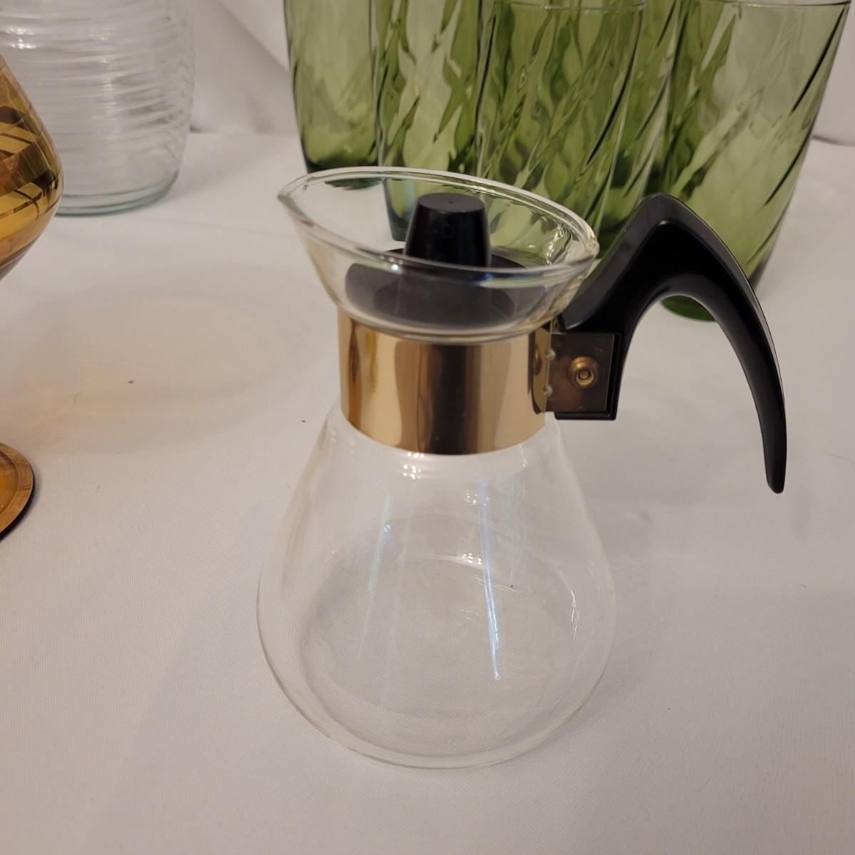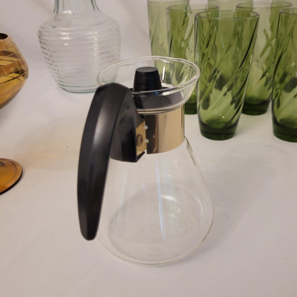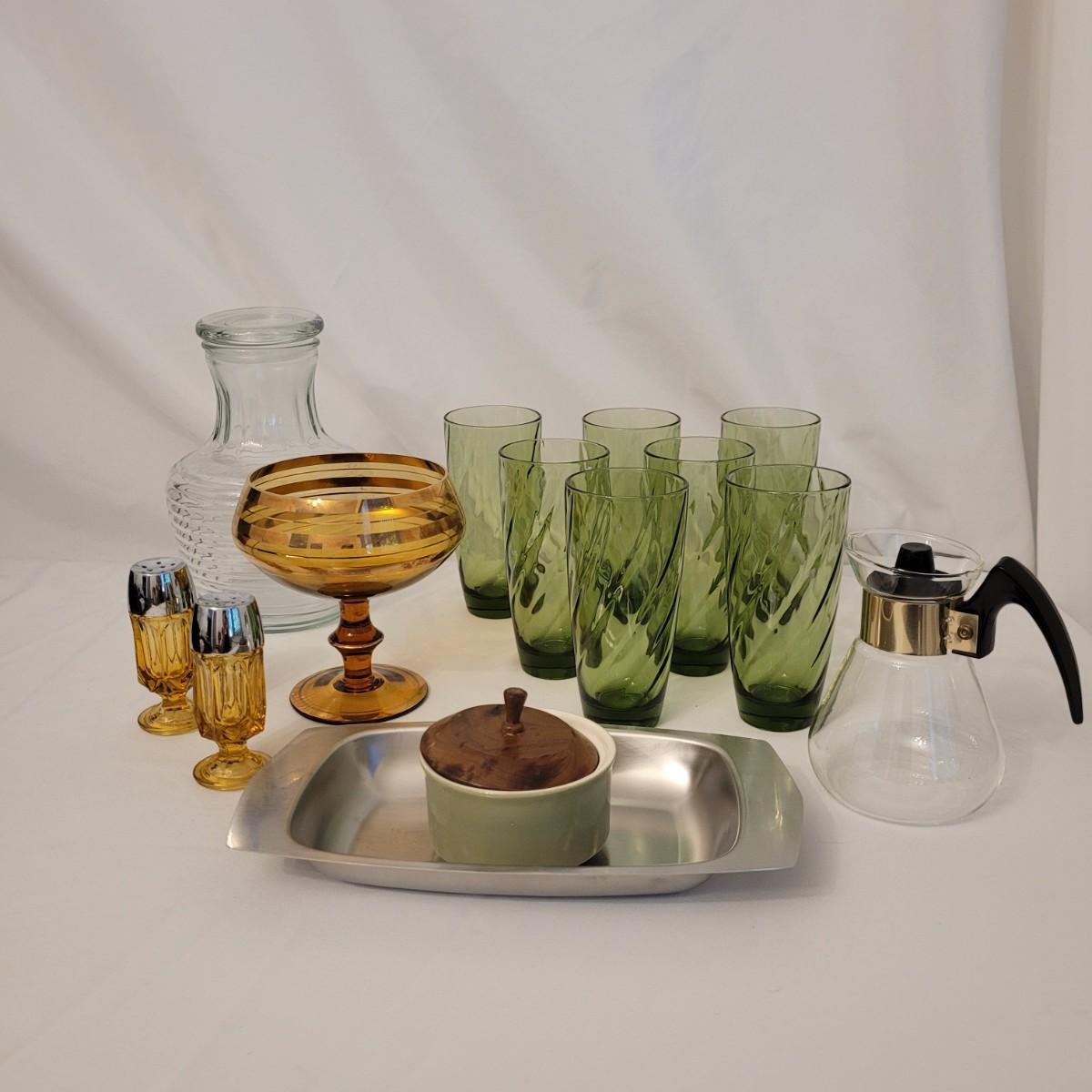Assortment of cute MCM serving ware, including seven green glasses, amber glass goblet style cup with gold bands, salt and pepper shaker set, ceramic container with wooden lid, small metal tray, small karaff and large glass pitcher with stopper lid. Pitcher measures approximately 6.5"DIA at widest point x 9"H. Shipping available.