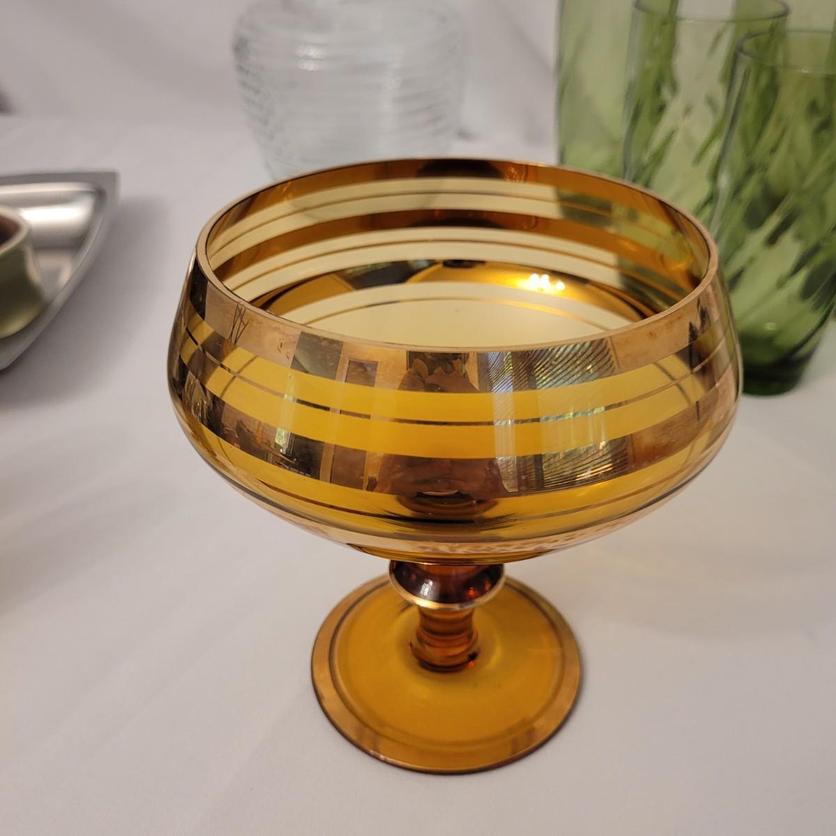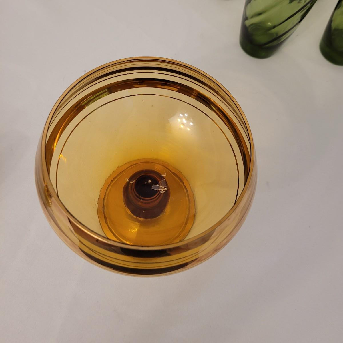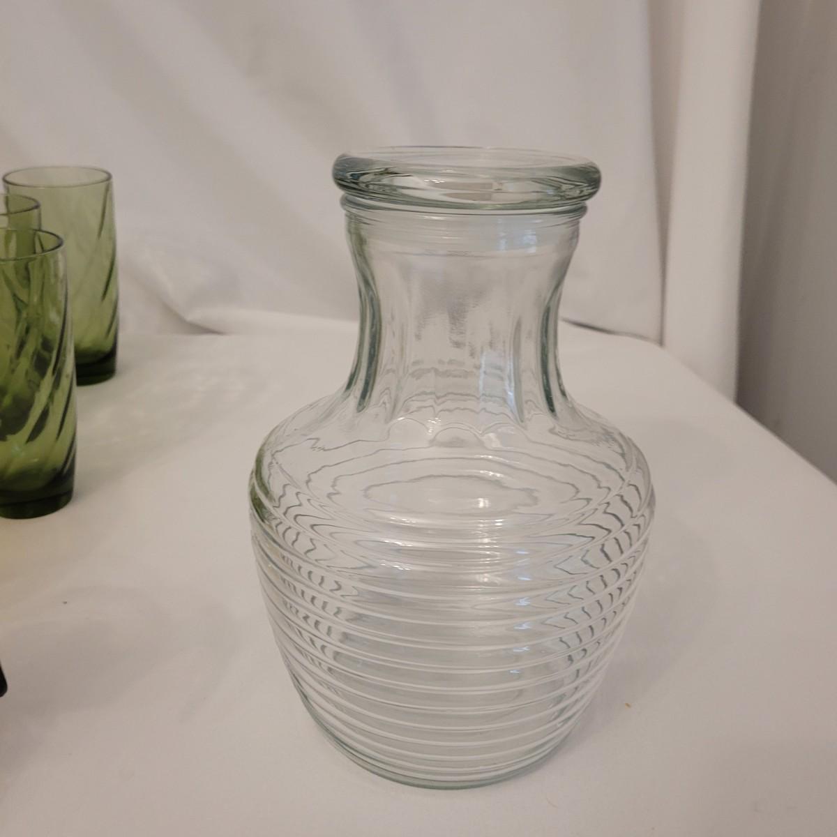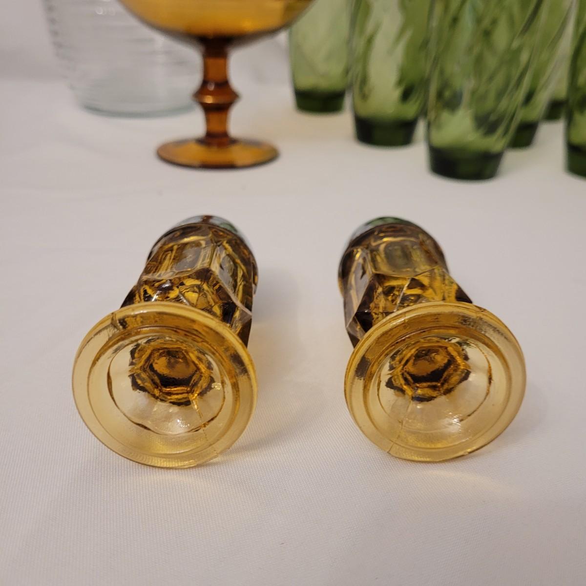 Assortment of cute MCM serving ware, including seven green glasses, amber glass goblet style cup with gold bands, salt and pepper shaker set, ceramic container with wooden lid, small metal tray, small karaff and large glass pitcher with stopper lid. Pitcher measures approximately 6.5"DIA at widest point x 9"H. Shipping available.