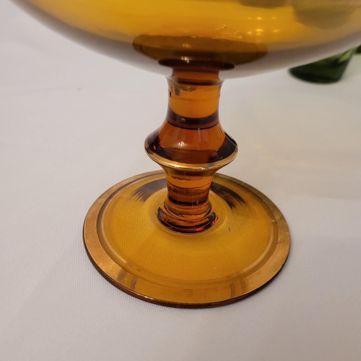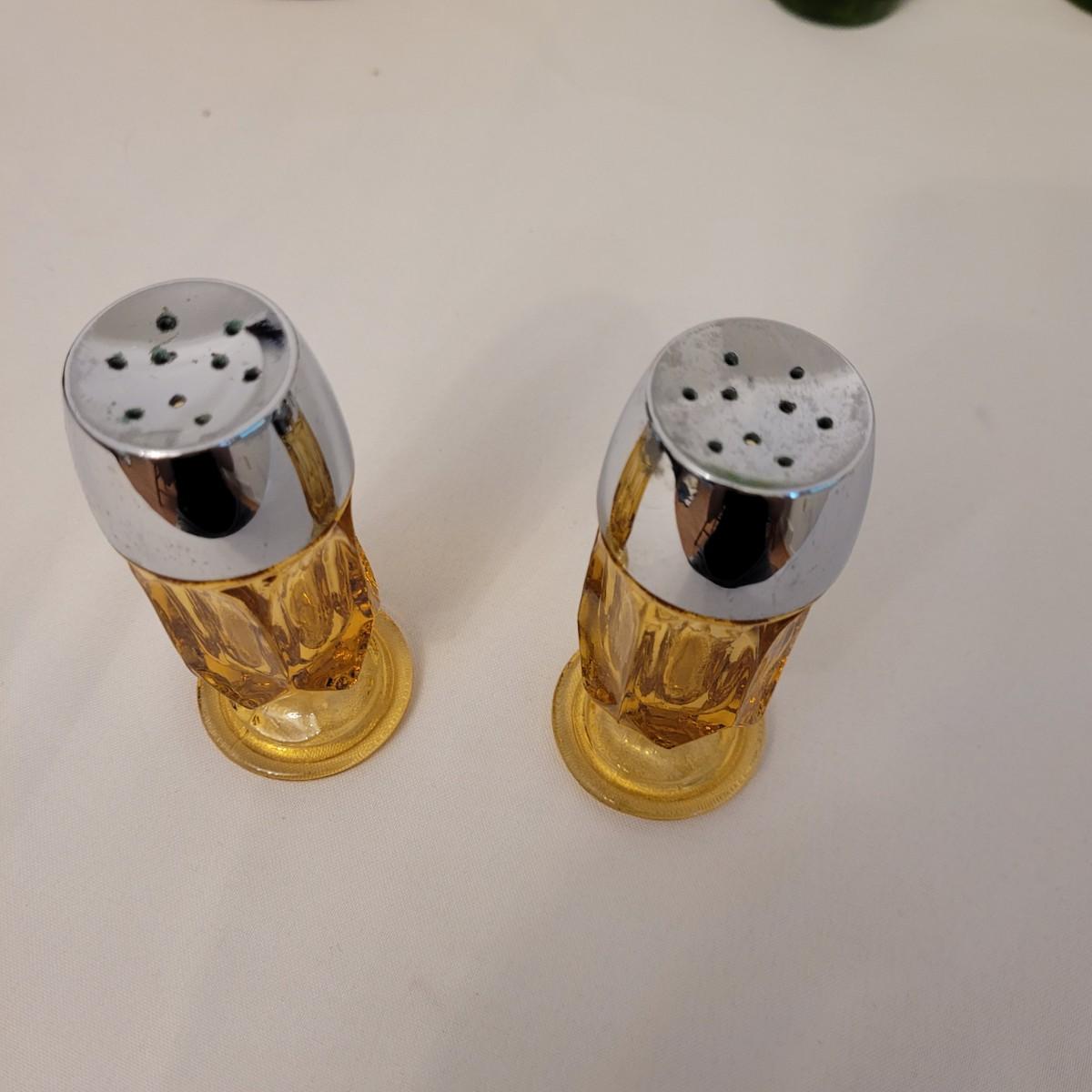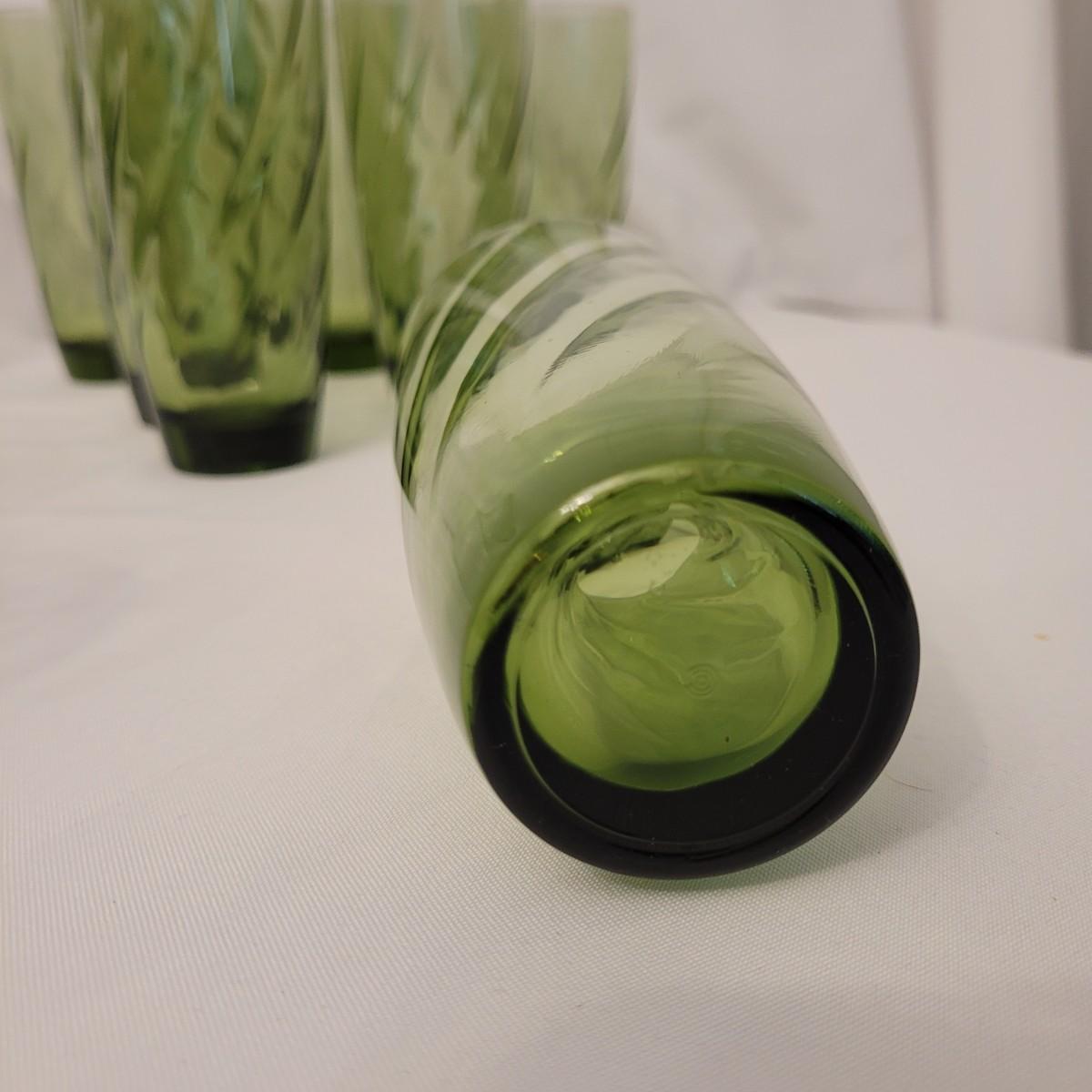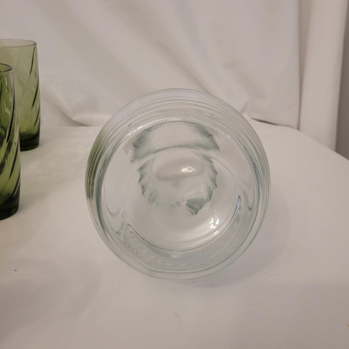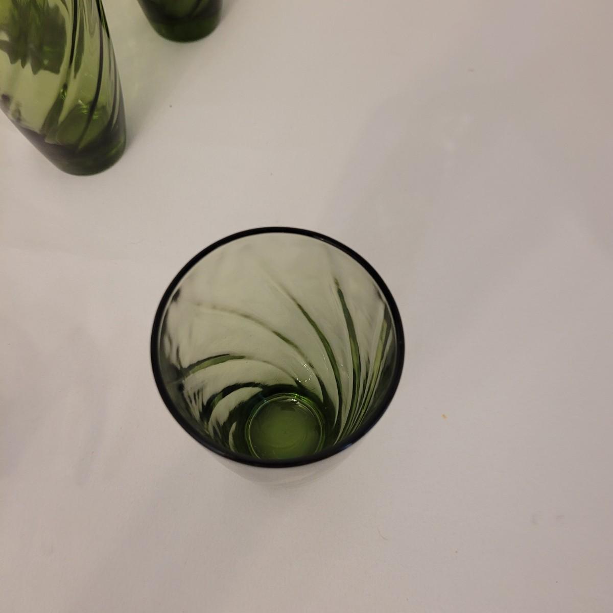 Assortment of cute MCM serving ware, including seven green glasses, amber glass goblet style cup with gold bands, salt and pepper shaker set, ceramic container with wooden lid, small metal tray, small karaff and large glass pitcher with stopper lid. Pitcher measures approximately 6.5"DIA at widest point x 9"H. Shipping available.