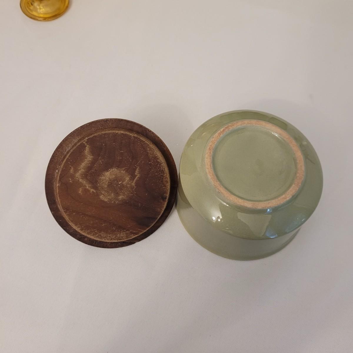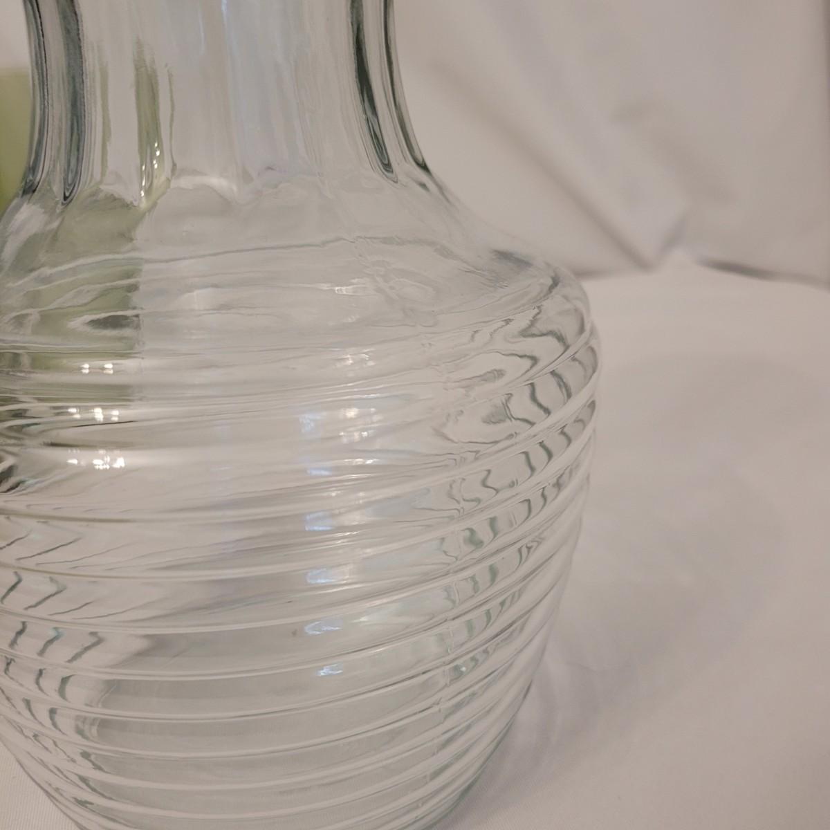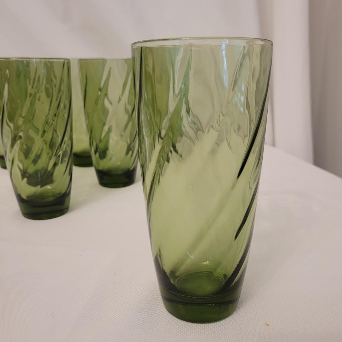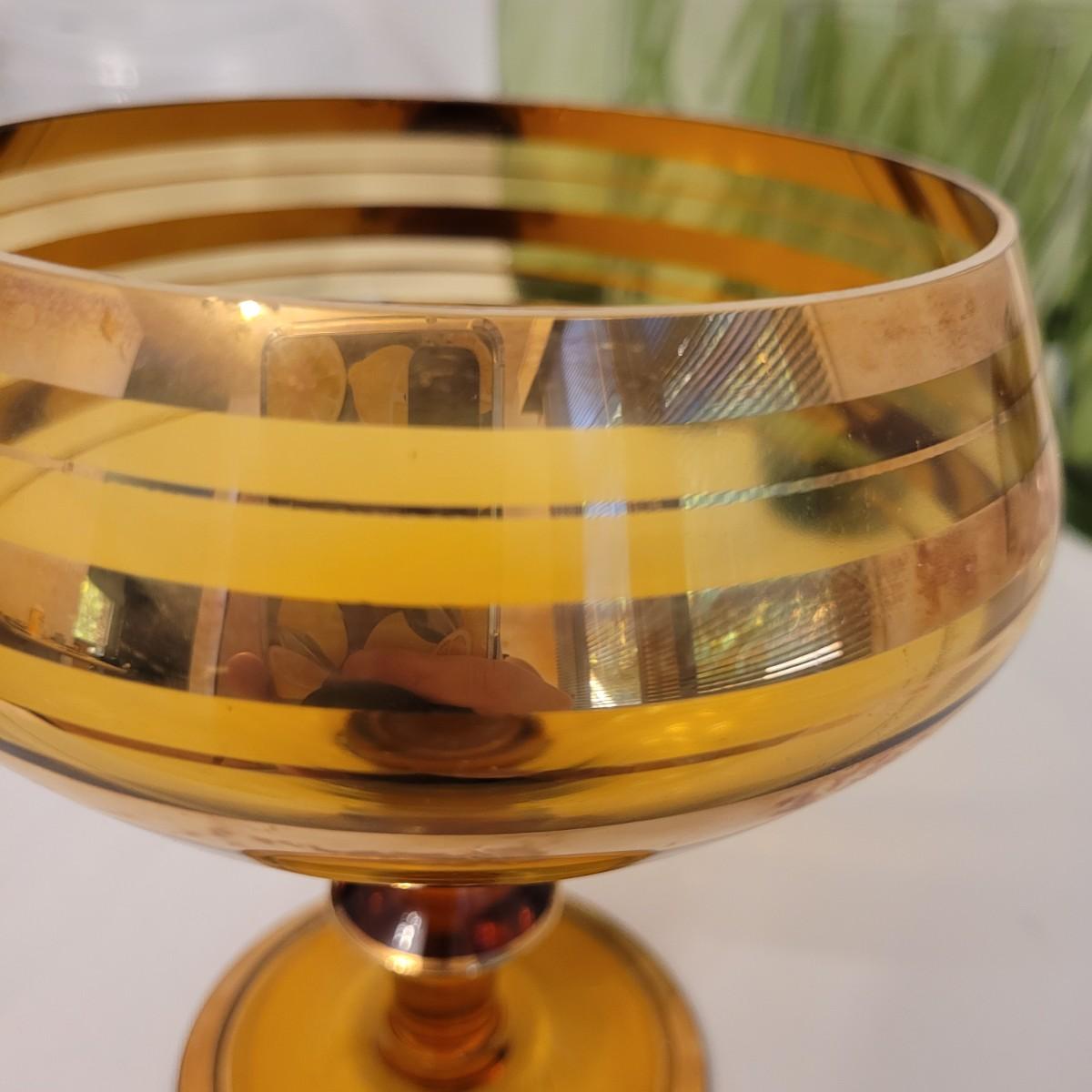 Assortment of cute MCM serving ware, including seven green glasses, amber glass goblet style cup with gold bands, salt and pepper shaker set, ceramic container with wooden lid, small metal tray, small karaff and large glass pitcher with stopper lid. Pitcher measures approximately 6.5"DIA at widest point x 9"H. Shipping available.