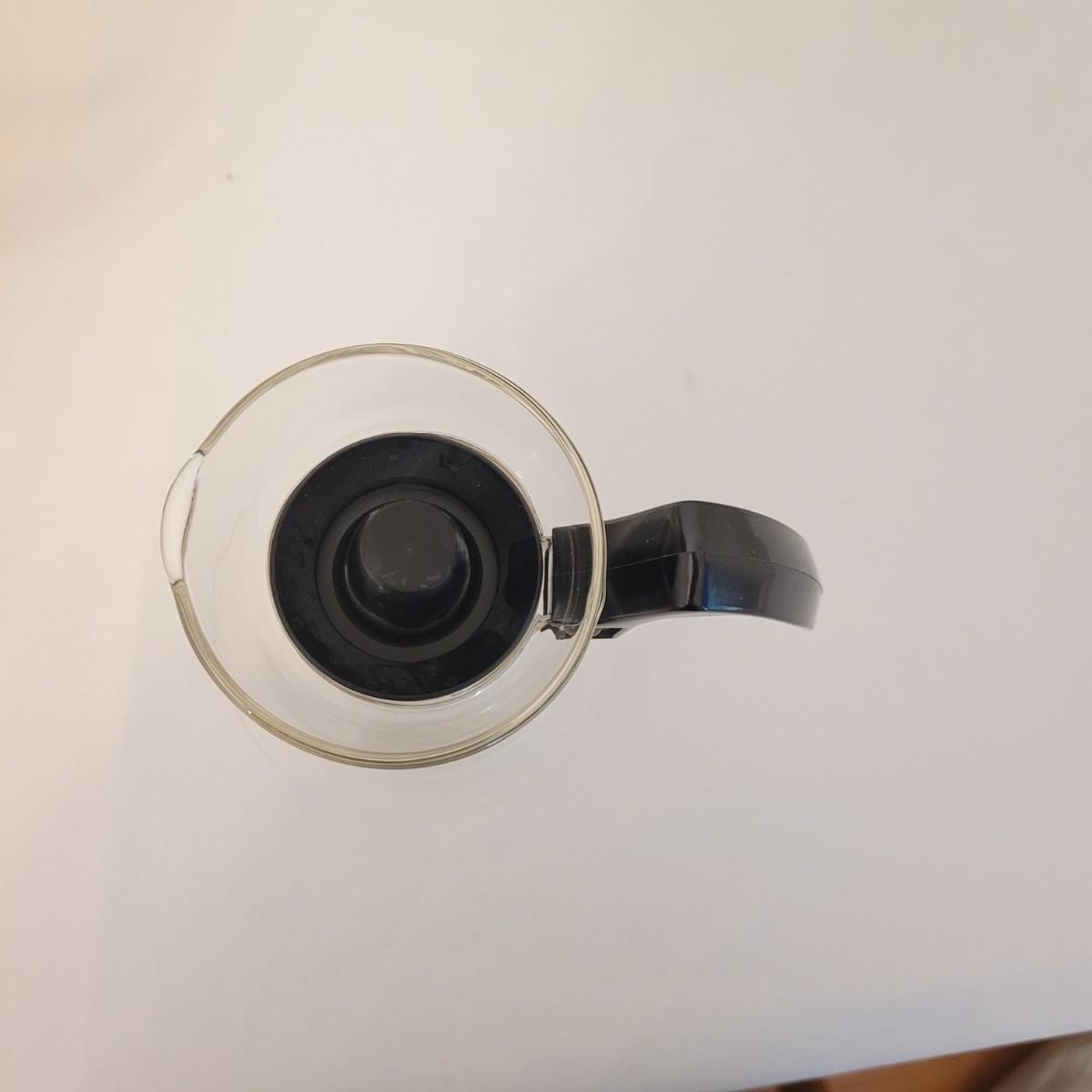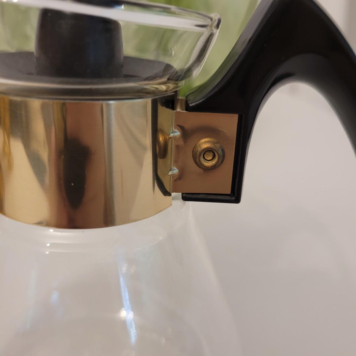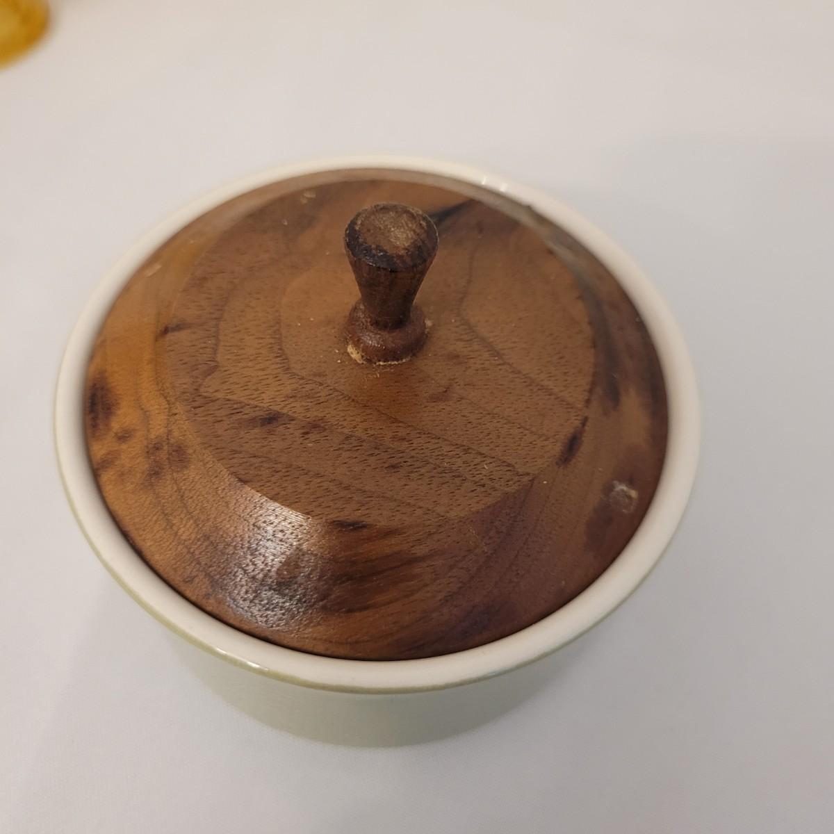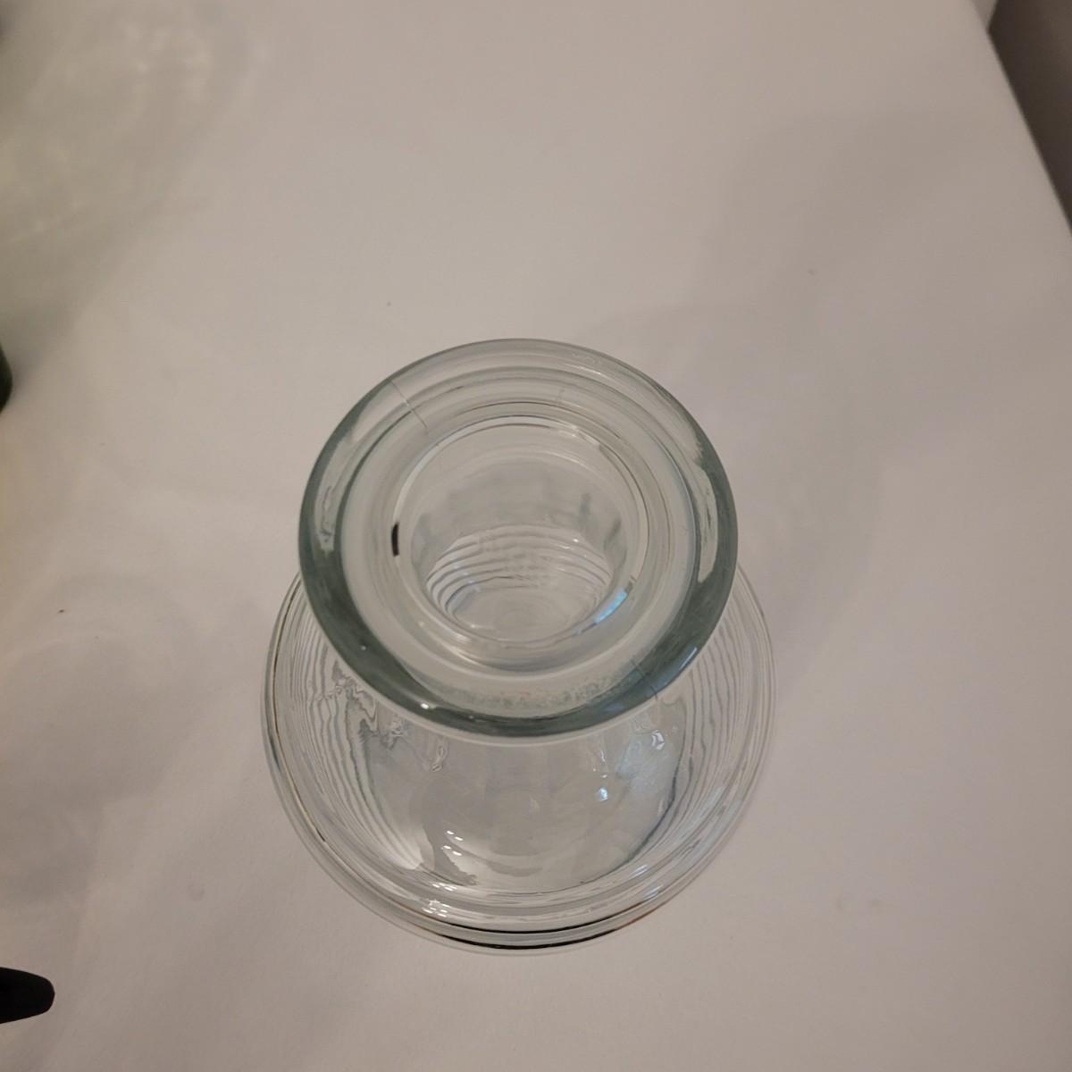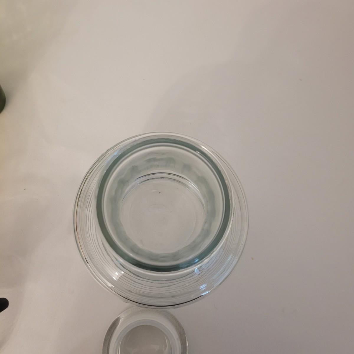 Assortment of cute MCM serving ware, including seven green glasses, amber glass goblet style cup with gold bands, salt and pepper shaker set, ceramic container with wooden lid, small metal tray, small karaff and large glass pitcher with stopper lid. Pitcher measures approximately 6.5"DIA at widest point x 9"H. Shipping available.