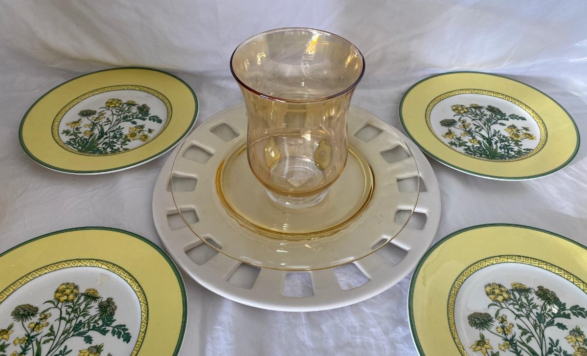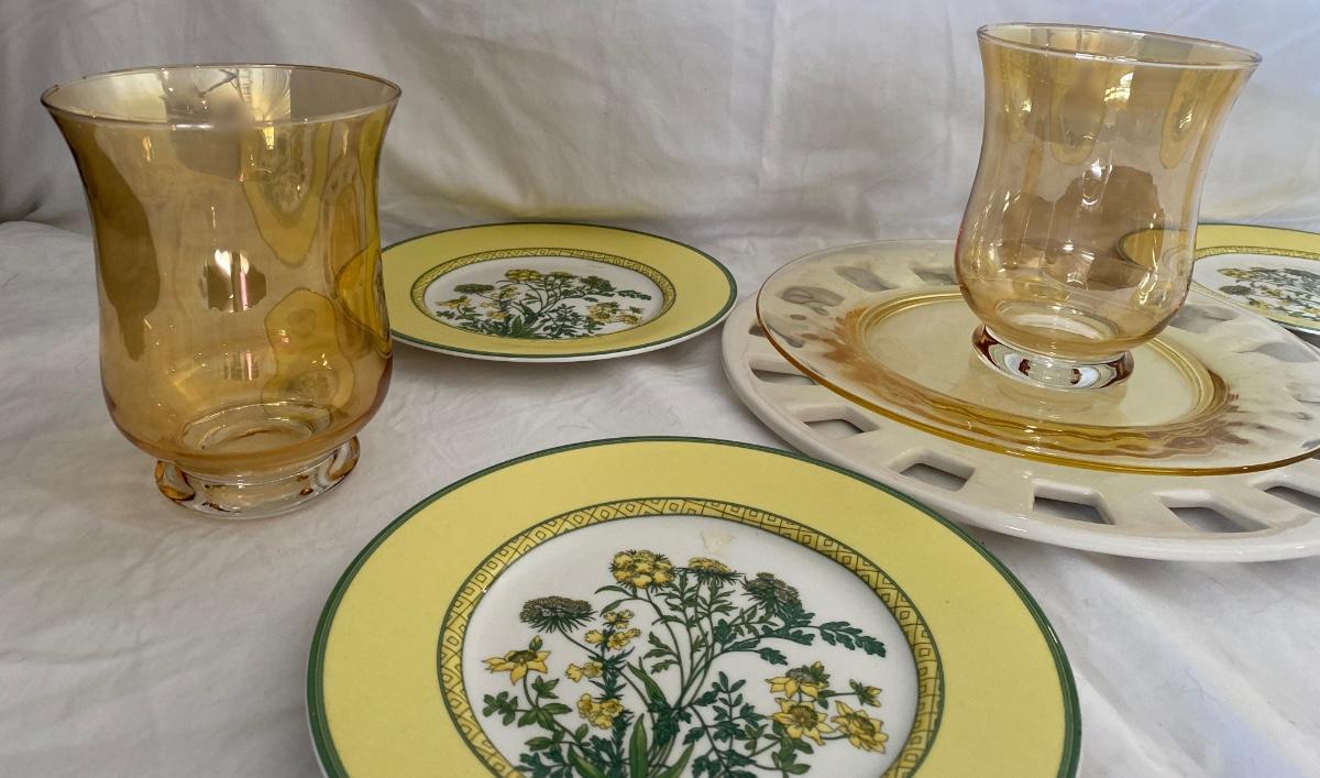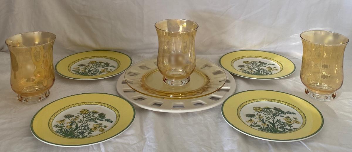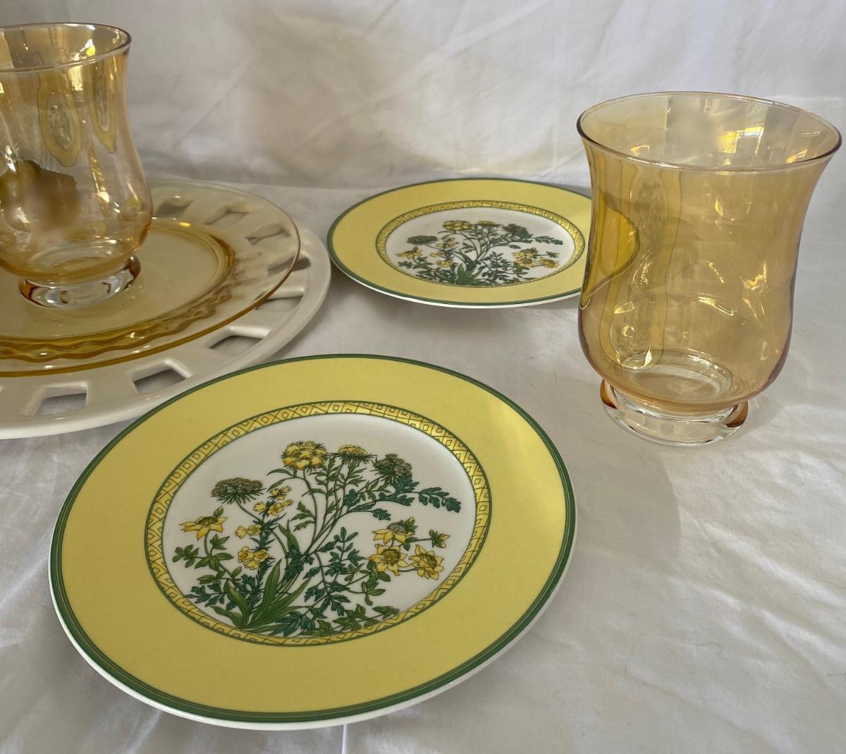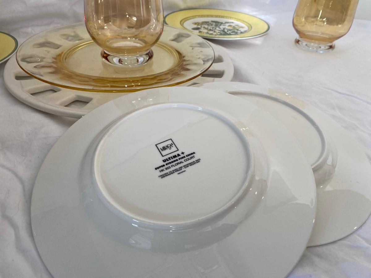 Assortment of Mikasa plates and home decor. Mikasa plates style HK 303 Floral Court. Amber/Yellow tone home decor vases, yellow glass plate, and white serving dish. All preowned and as is.