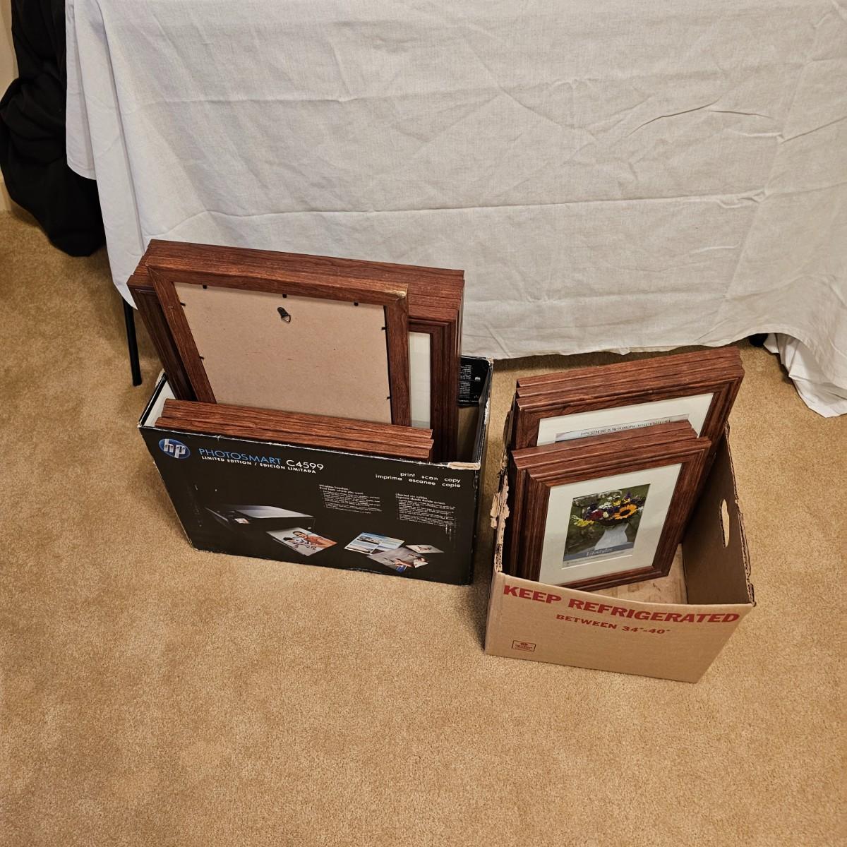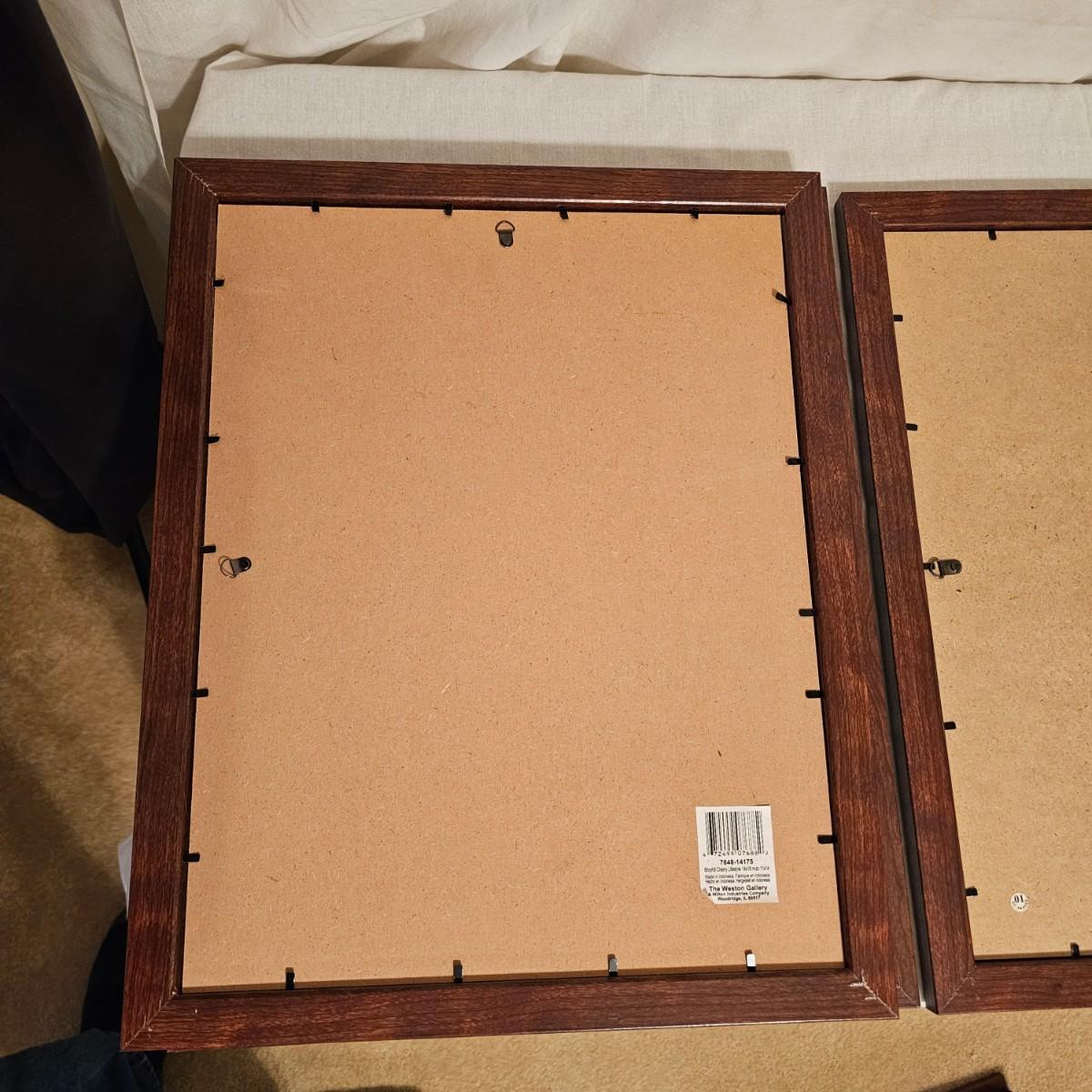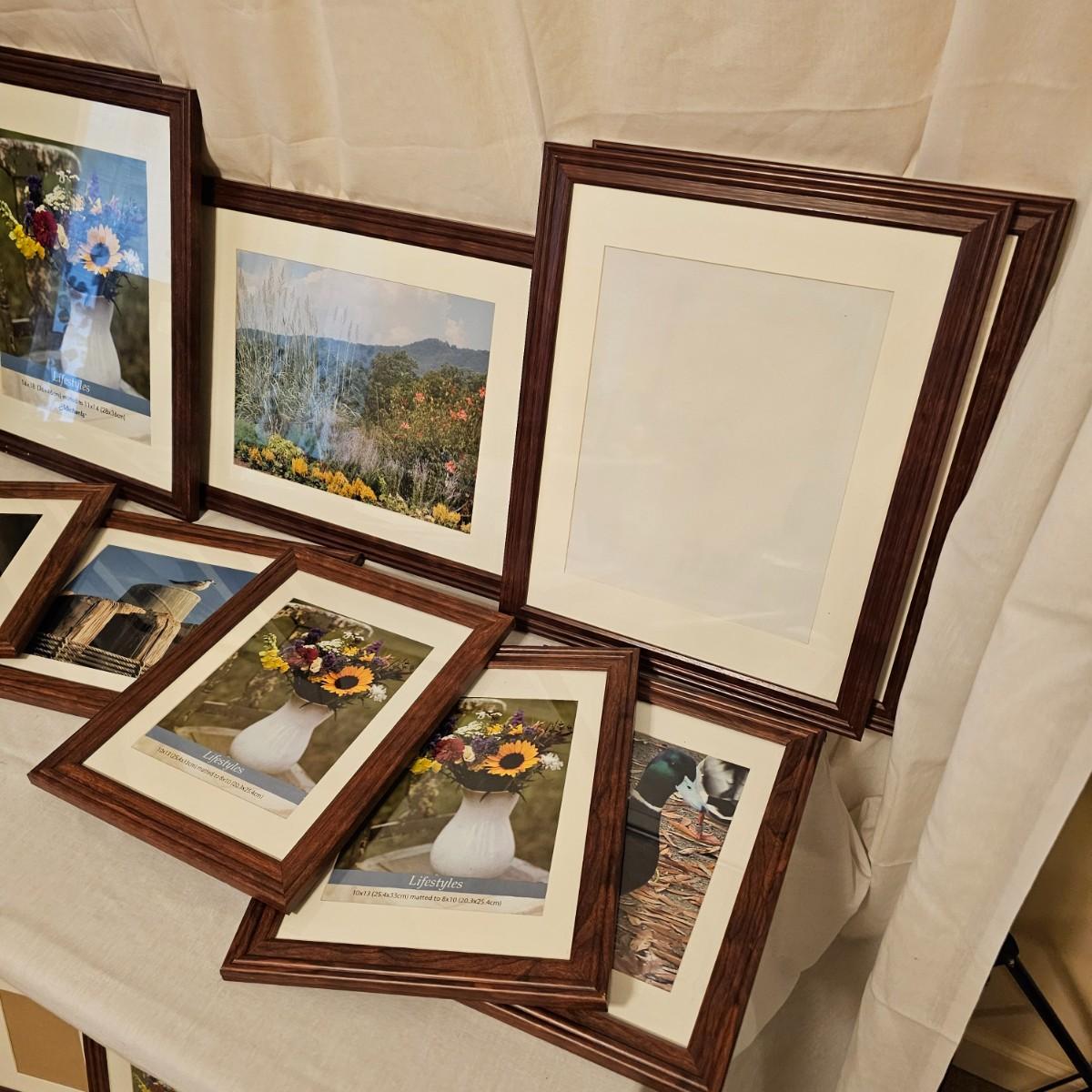 Fifteen total frames in four different sizes. Frames are all commercial made with glass and matting. Large size, 16" x 20", next 12" x 15", one 12" x 22" and 10" x 12". Some edges a bit nicked. See photos for details. Local pickup only.