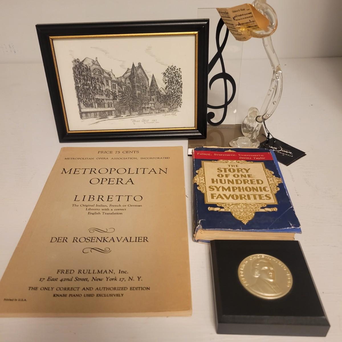 An assortment of vintage and newer music decor and publications in good condition. This lot includes a print of Music Hall in Cincinnati, Ohio, a medallion of Chopin inset on a wood block, a book on symphonic favorites published in 1940, a Metropolitan Opera playbill published in 1943 and a plastic musical statue. Statue measures approximately 8" tall. Shipping available