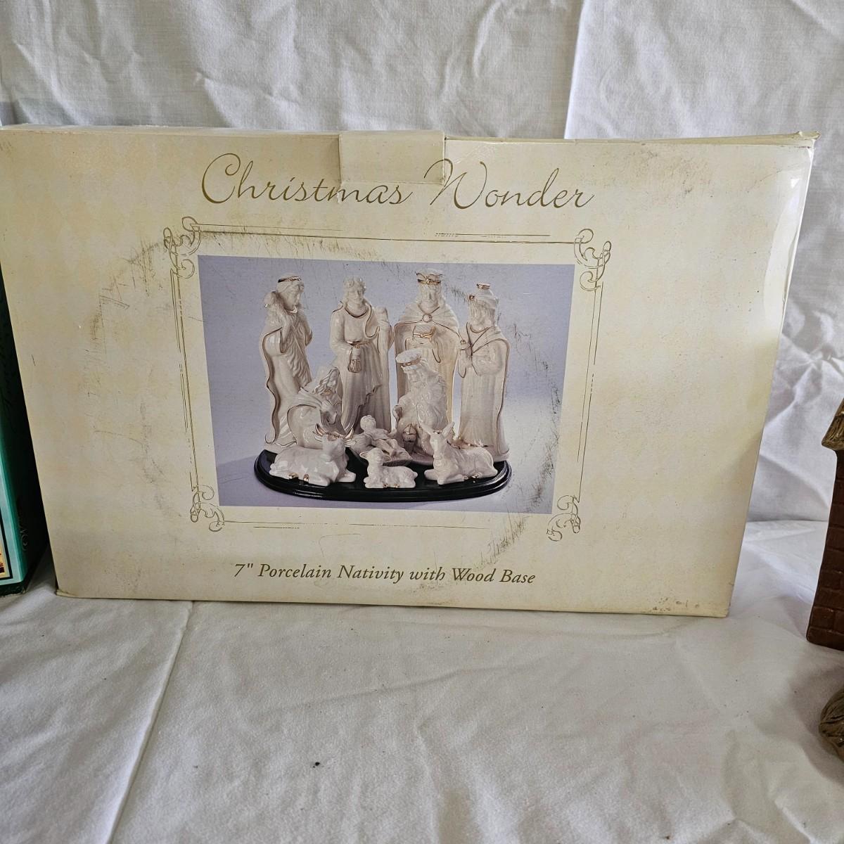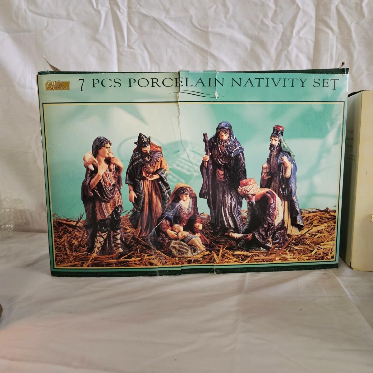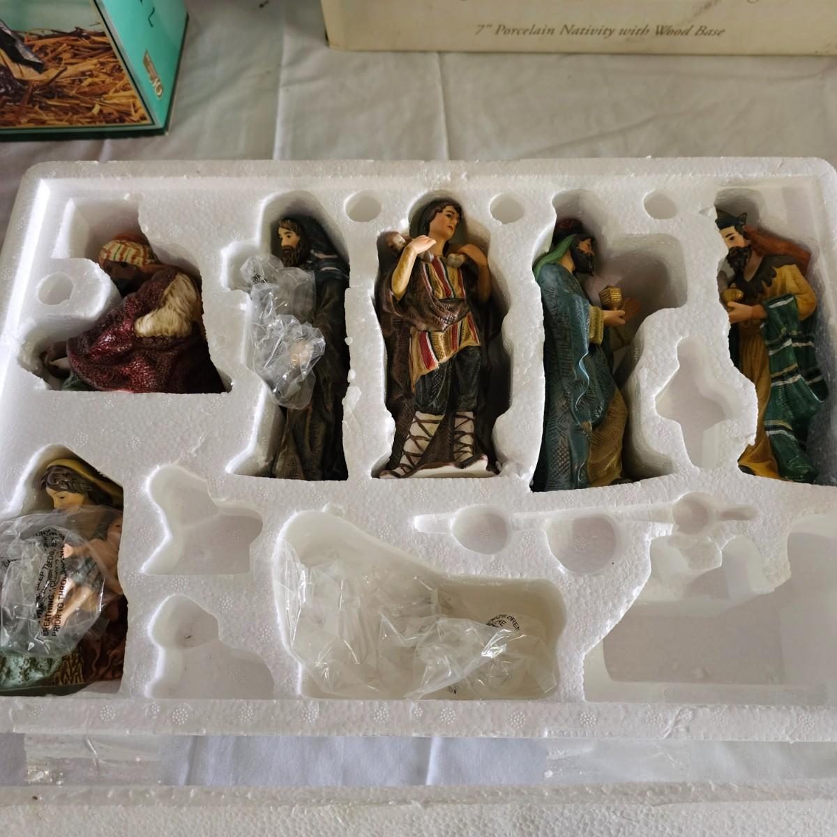 Four Nativity sets, two 7" porcelain in boxes, one small ceramic set and two ceramic barnyard scenes, one lighted, which powered on. See photos for details. Shipping available.