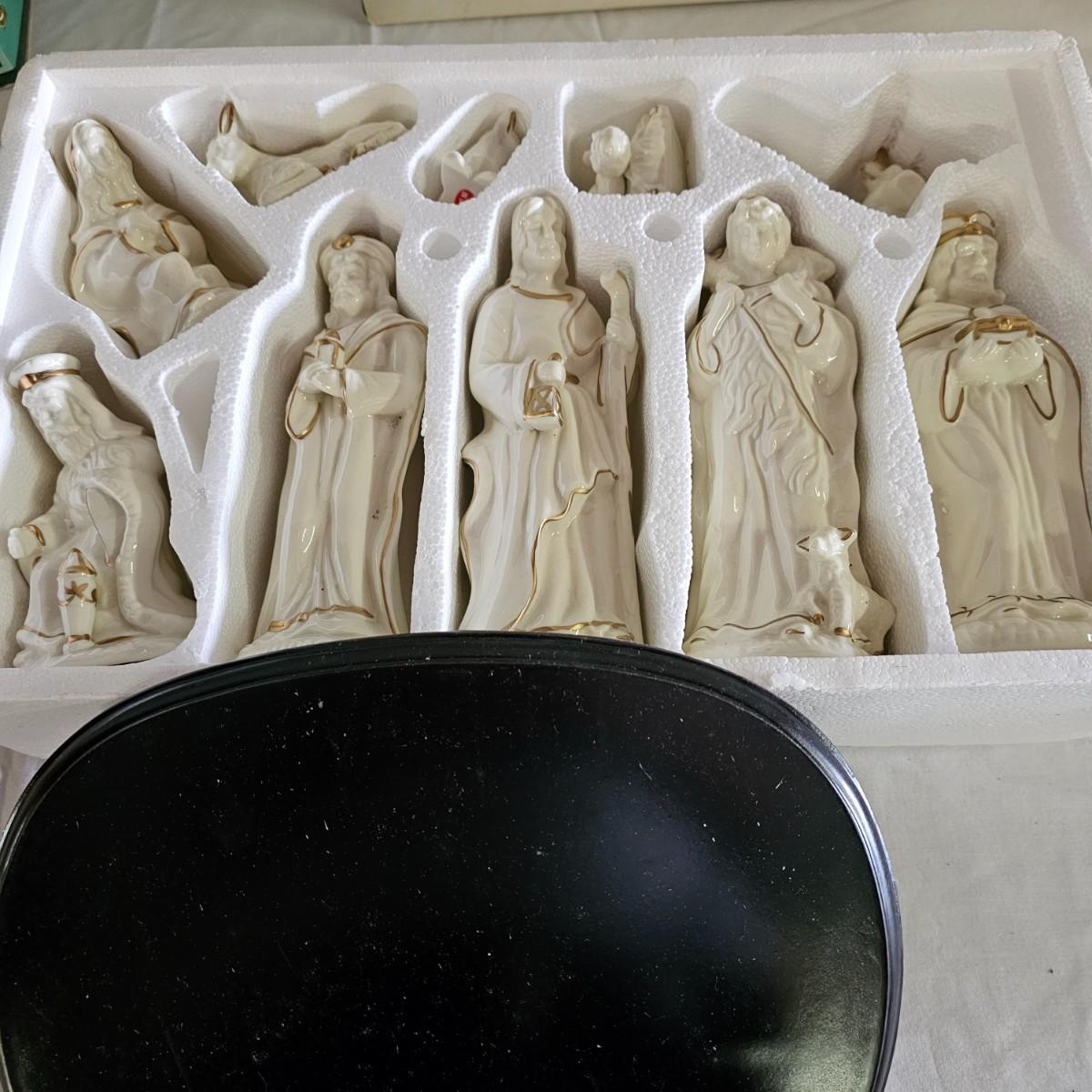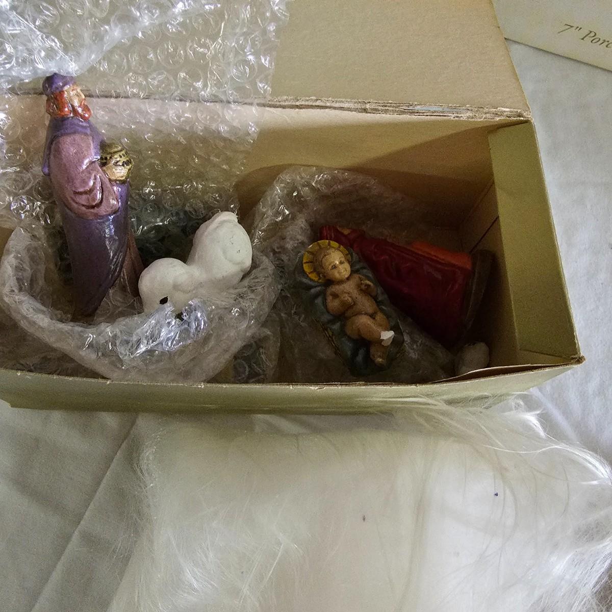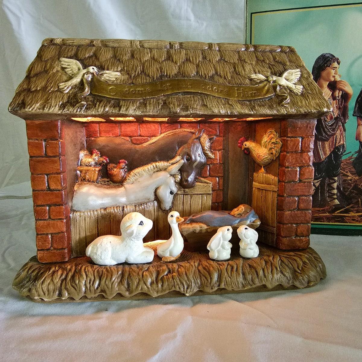 Four Nativity sets, two 7" porcelain in boxes, one small ceramic set and two ceramic barnyard scenes, one lighted, which powered on. See photos for details. Shipping available.