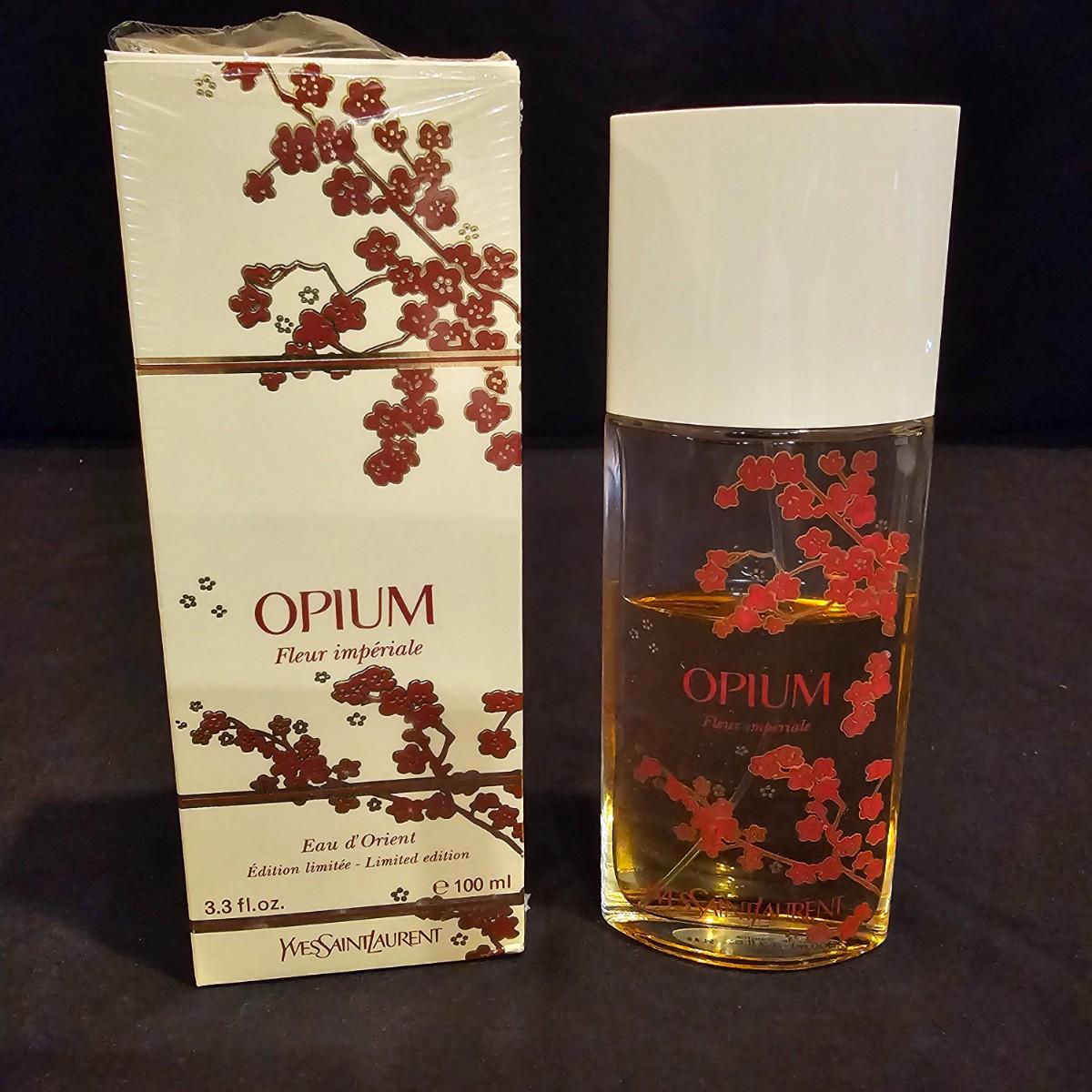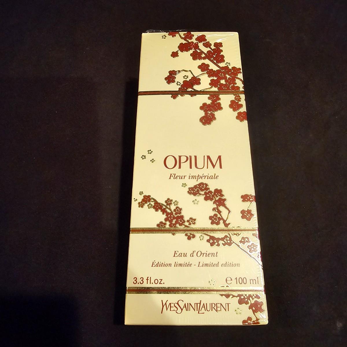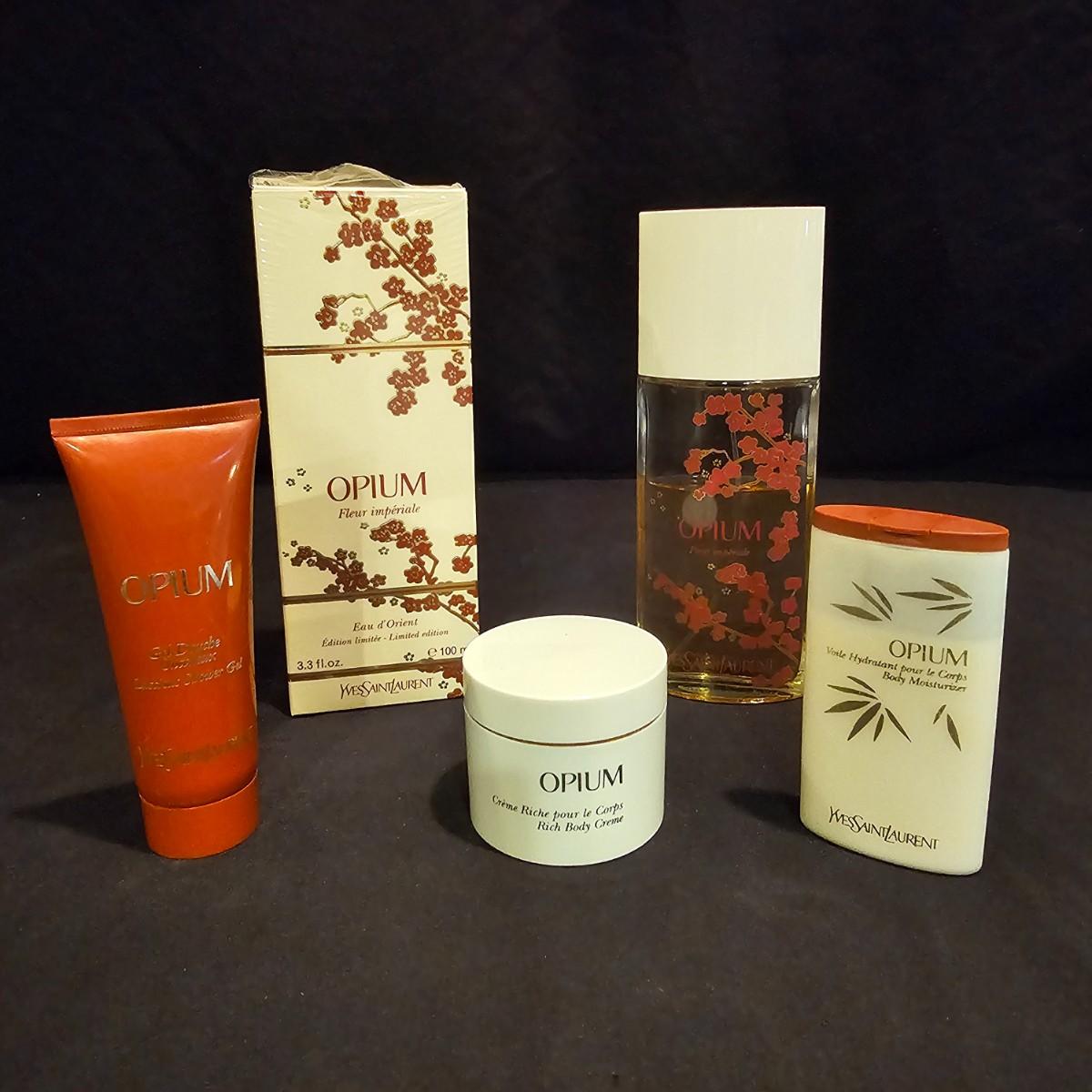This lot includes an unopened box with a 3.3 fl. oz. bottle of Yves St. Laurent Opium perfume.