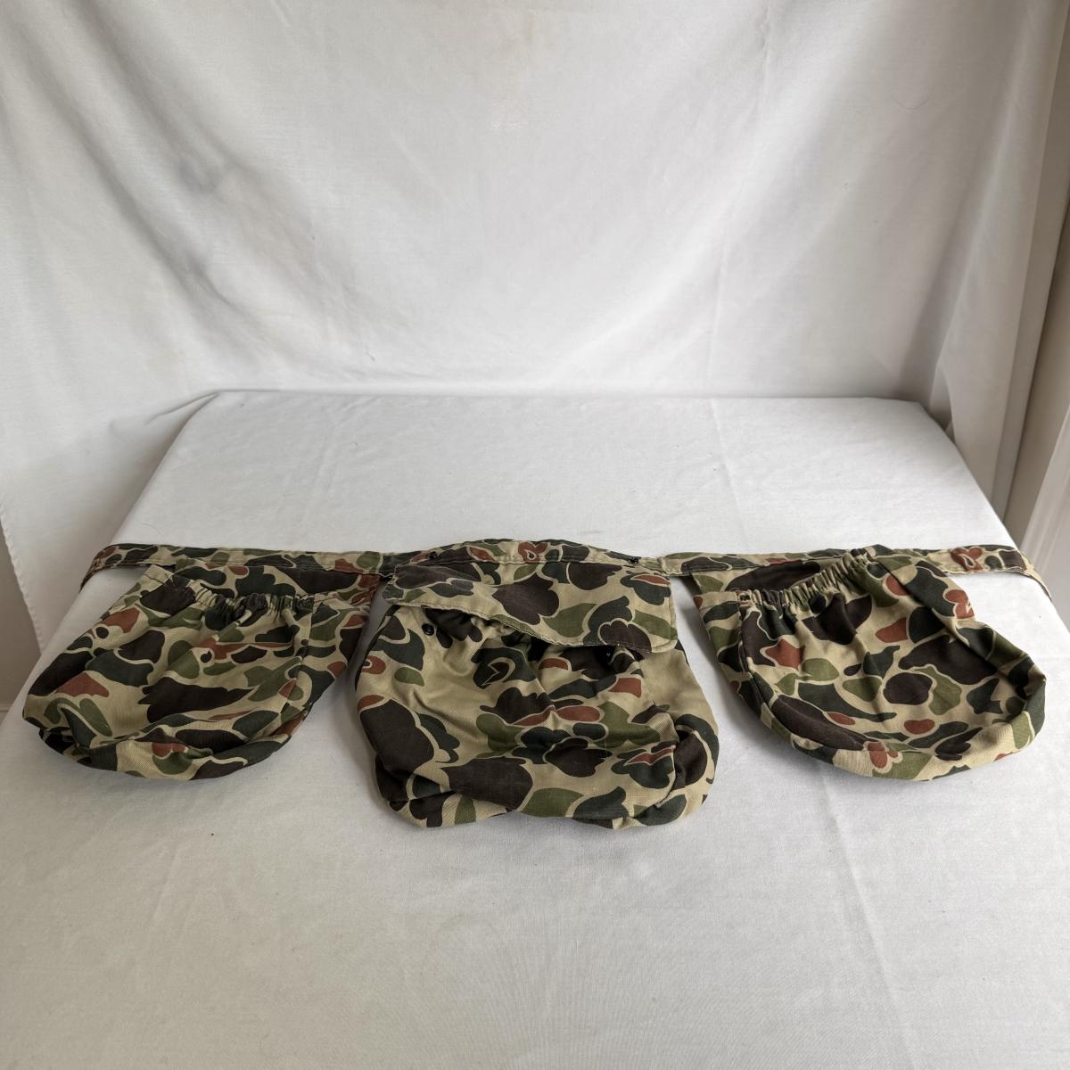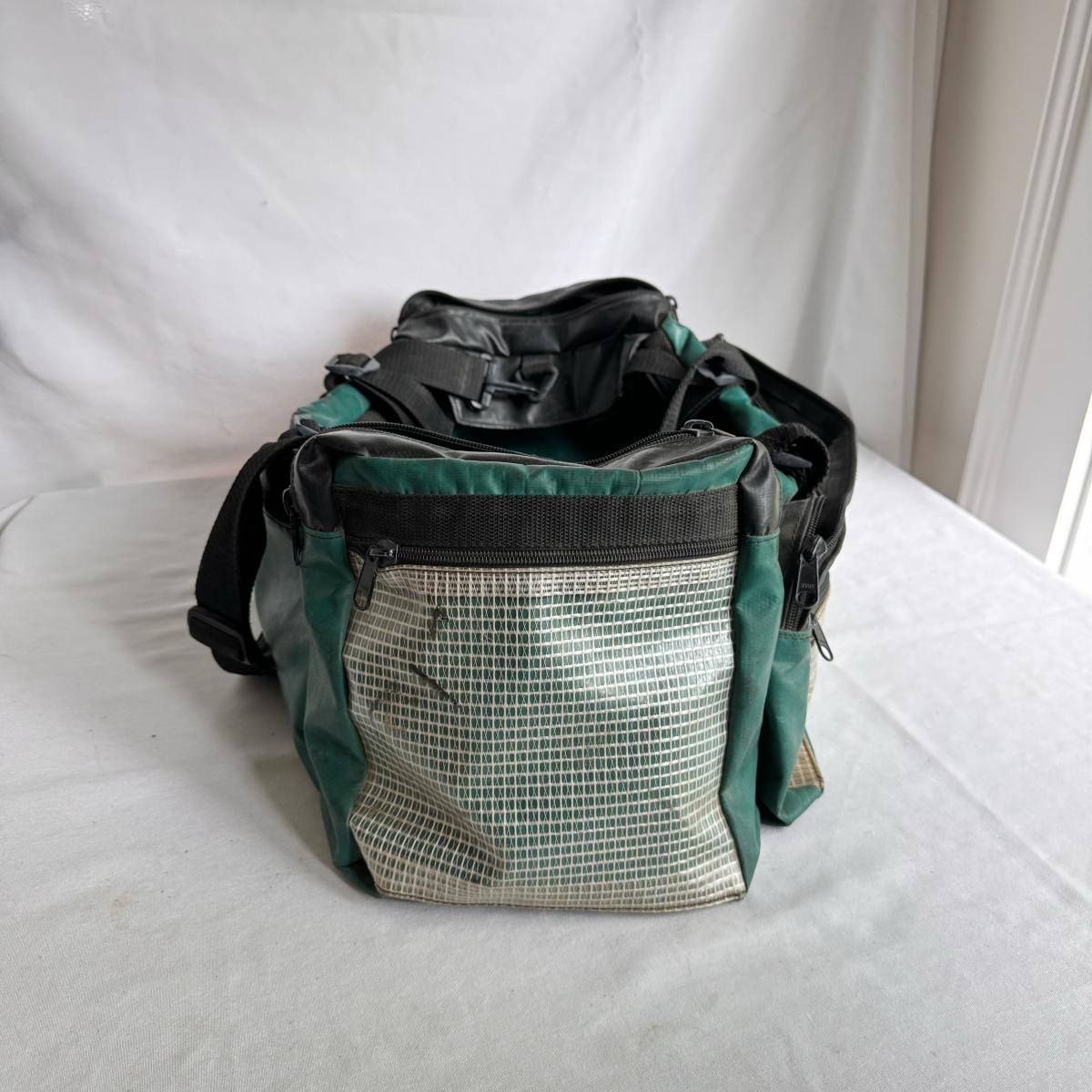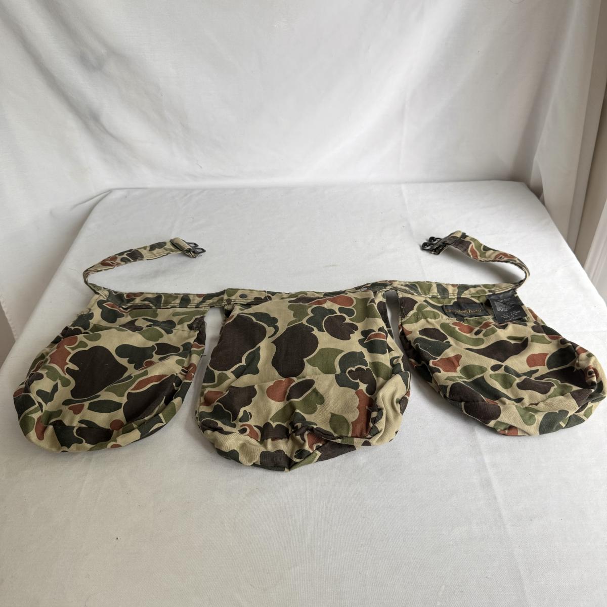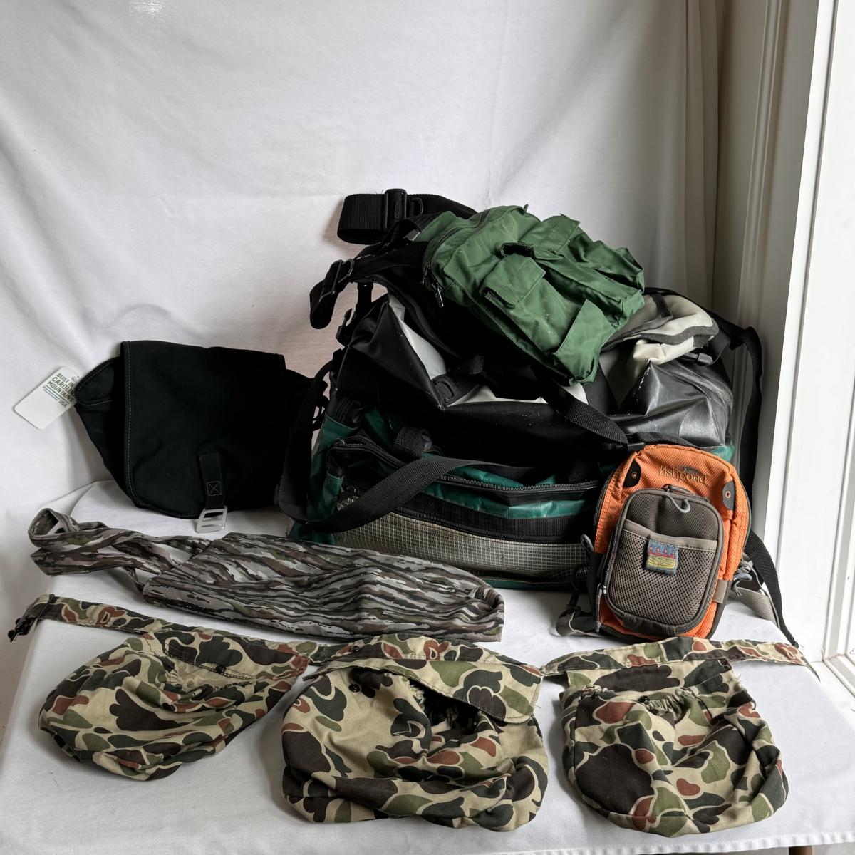 This lot includes one green bag from Bucks Bags, one grey bag from Dan Boiley’s, one small orange backpack from Fishpond, one black bag from Diamond Brand, one tote bag from Spartan Realtree, one waist bag with three pouches from the Charles Daly collection, and one green bag that goes over the shoulders. The largest bag is the first one pictured that measures 20” x 15” x 8”H. Some bags need cleaning.