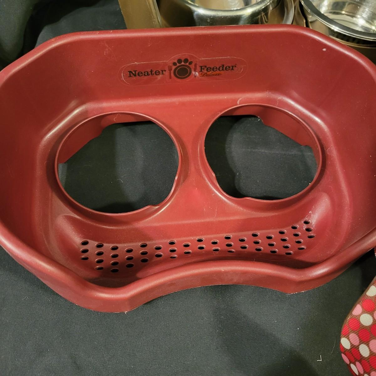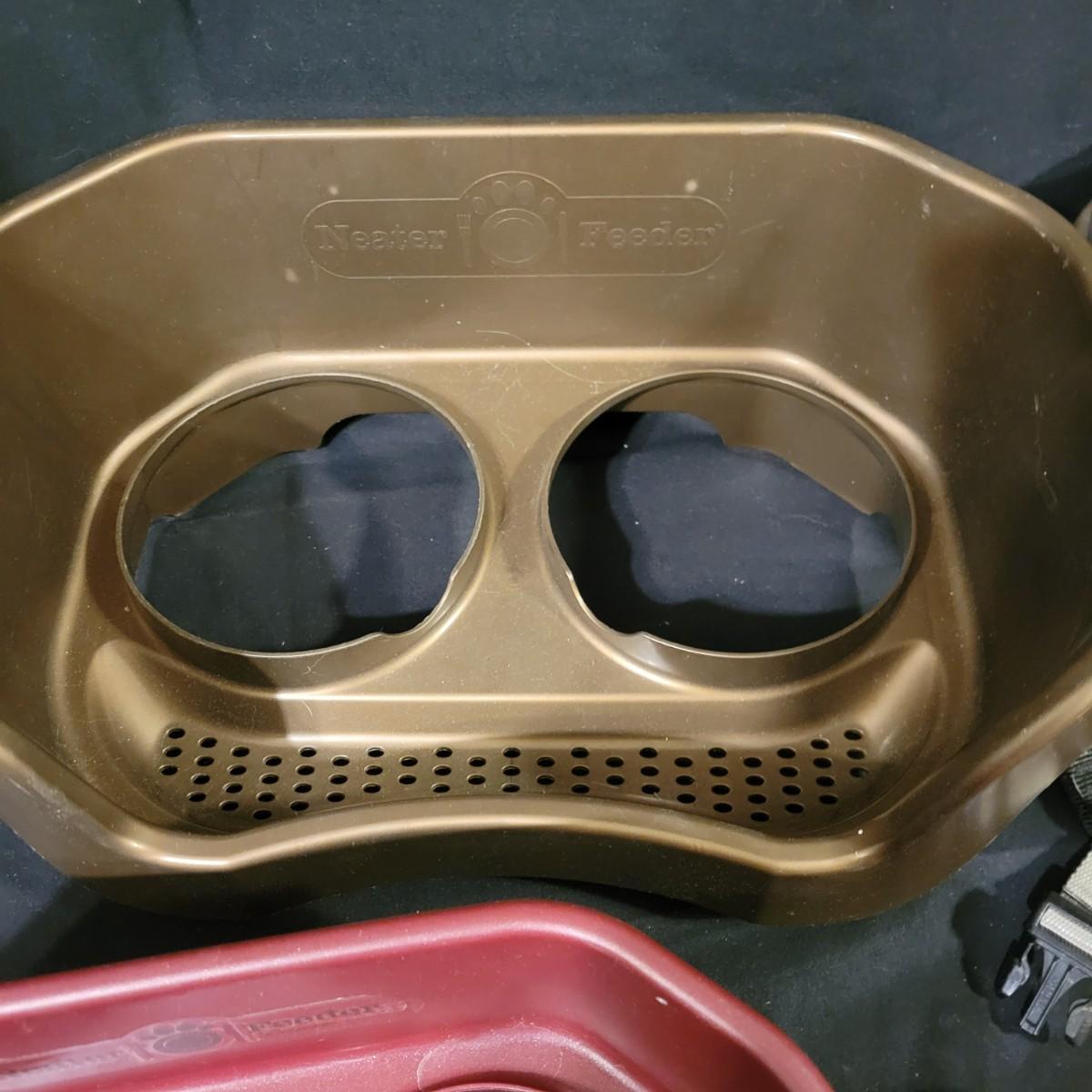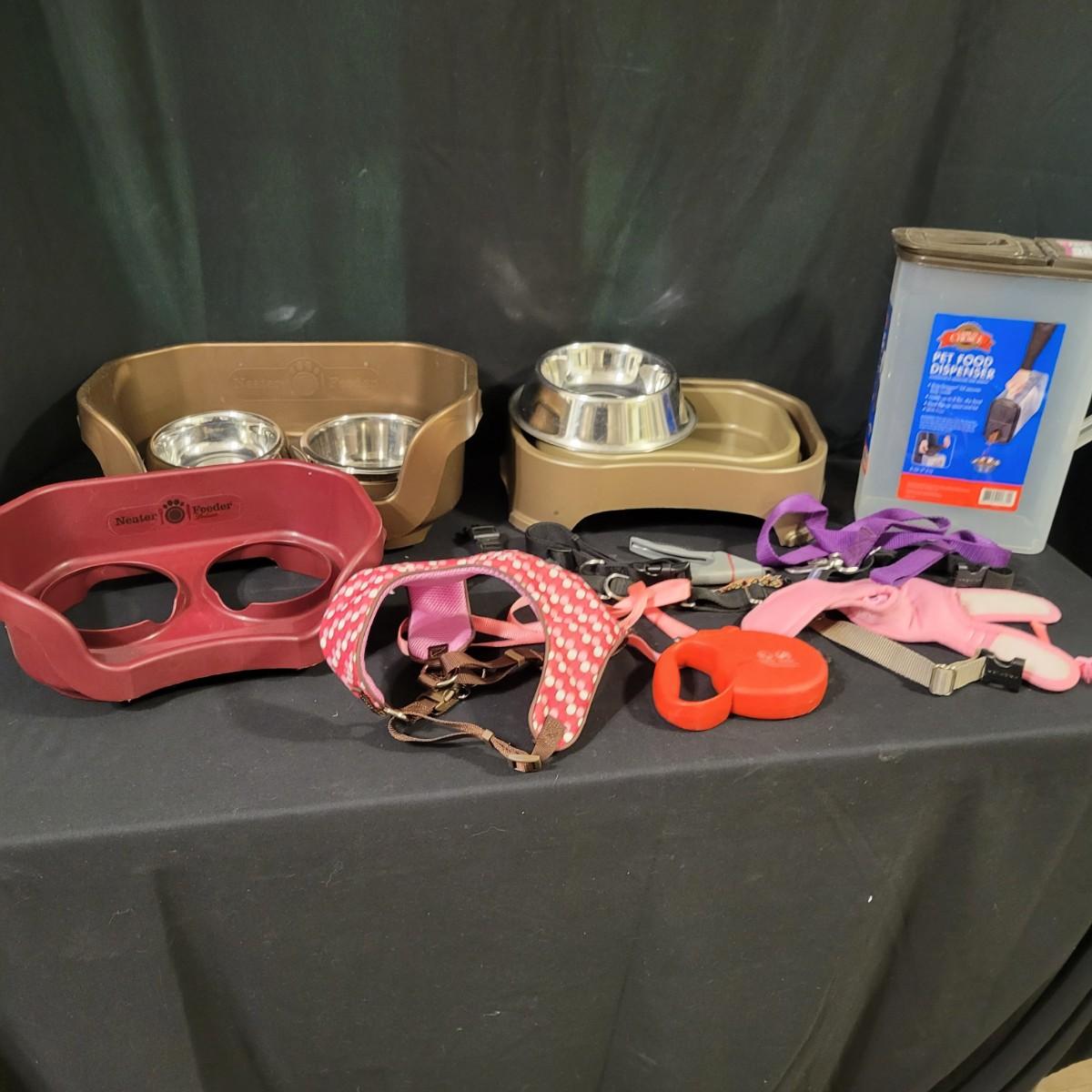 An assortment of pet accessories. Items range from harnesses, leashes, bowls, Neater Feeder raised feeders and more. The largest Neater Feeder measures approximately 17" x 11" x 6.5"H. Local pickup only