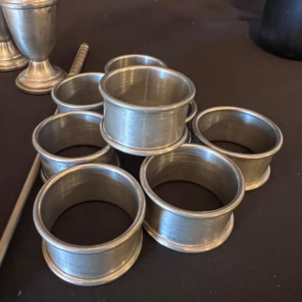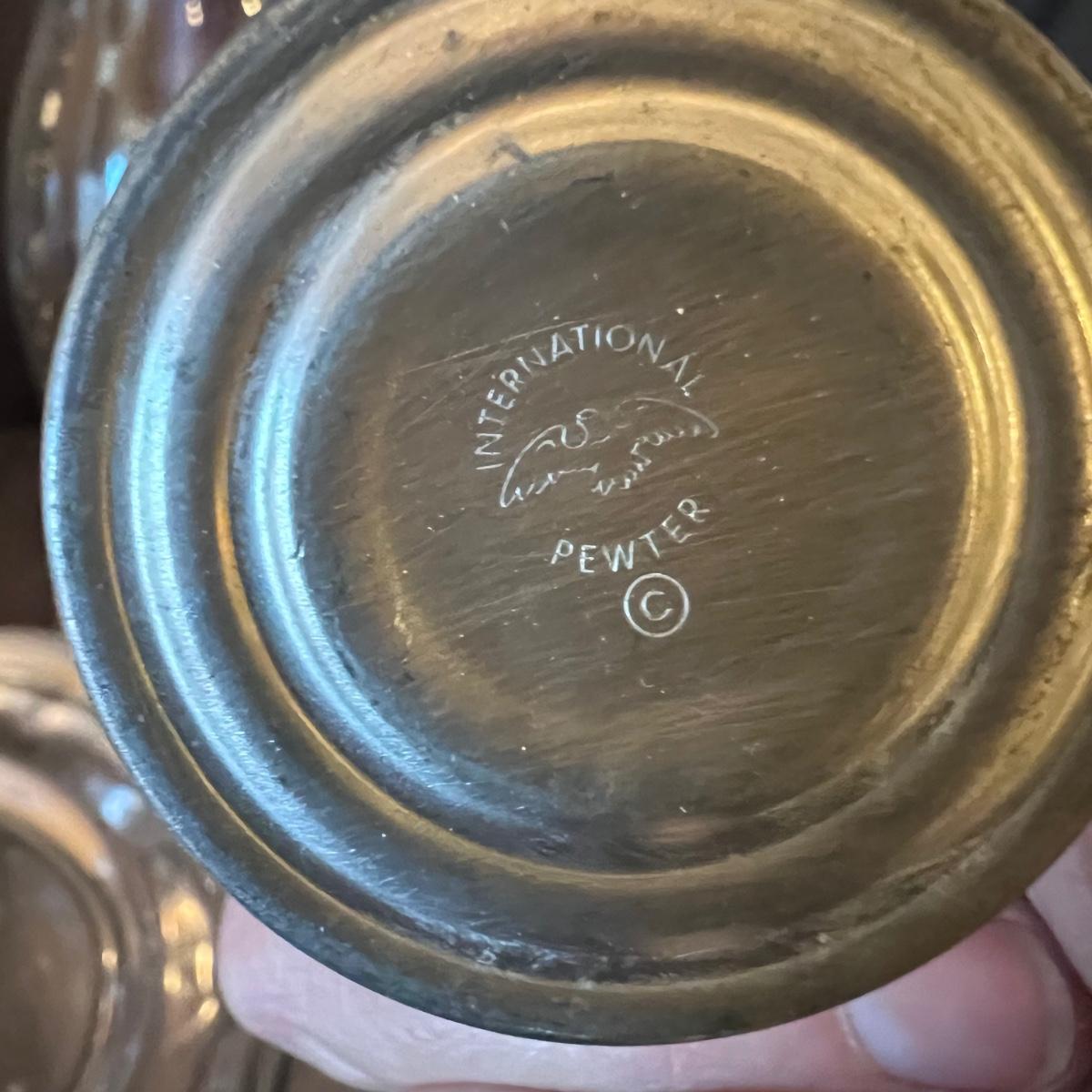 Most of these items appear to be pewter. Brands included are International Pewter, Nantucket Pewter, Stede, Royal Wilton Pewter (RWP), and TBM Co. Some items show signs of wear with scratches. The butter dish is International stainless steel. See pics for more information.