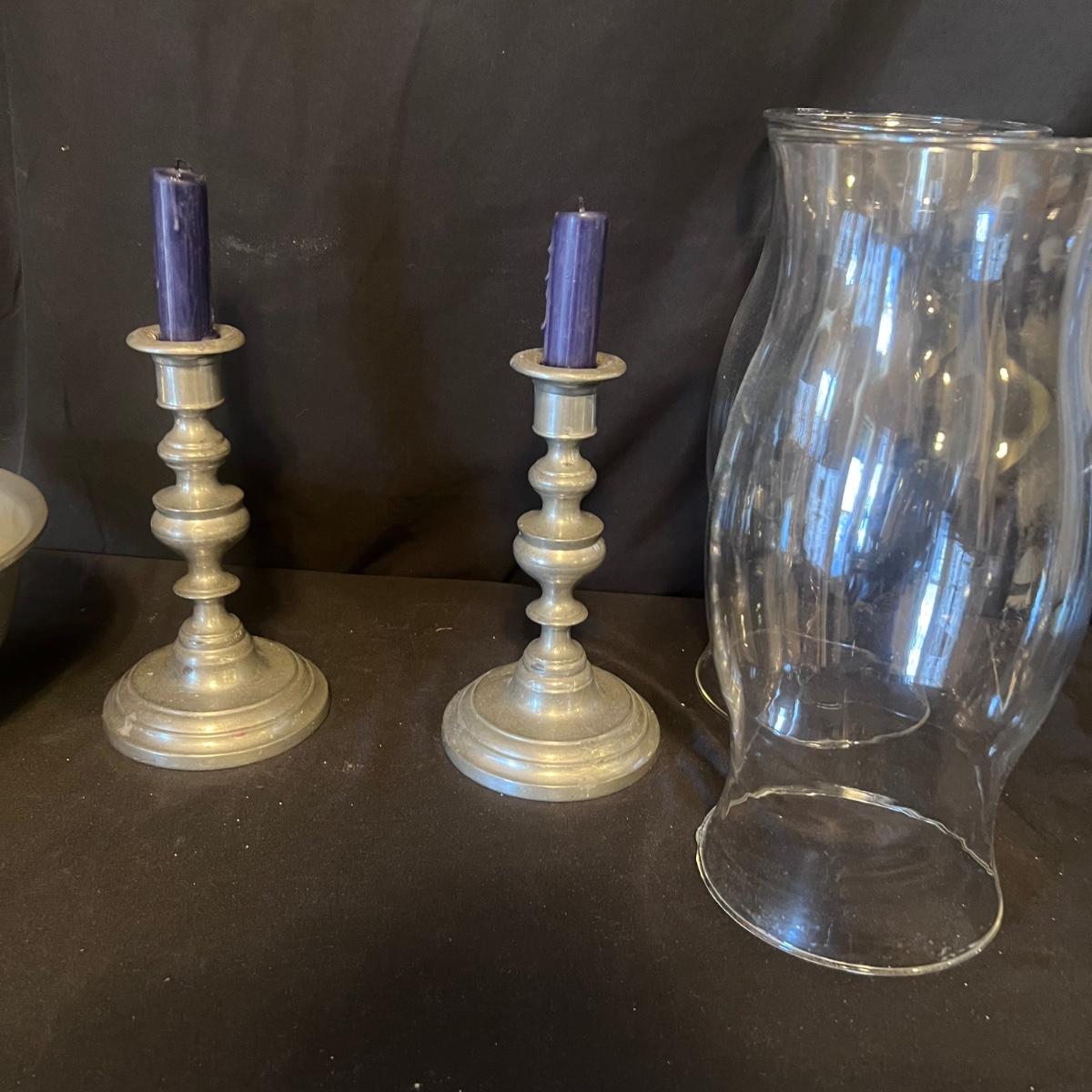 Pair of candlesticks with glass covers measure 5”D x 11”H.