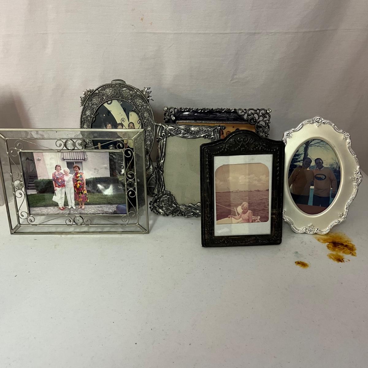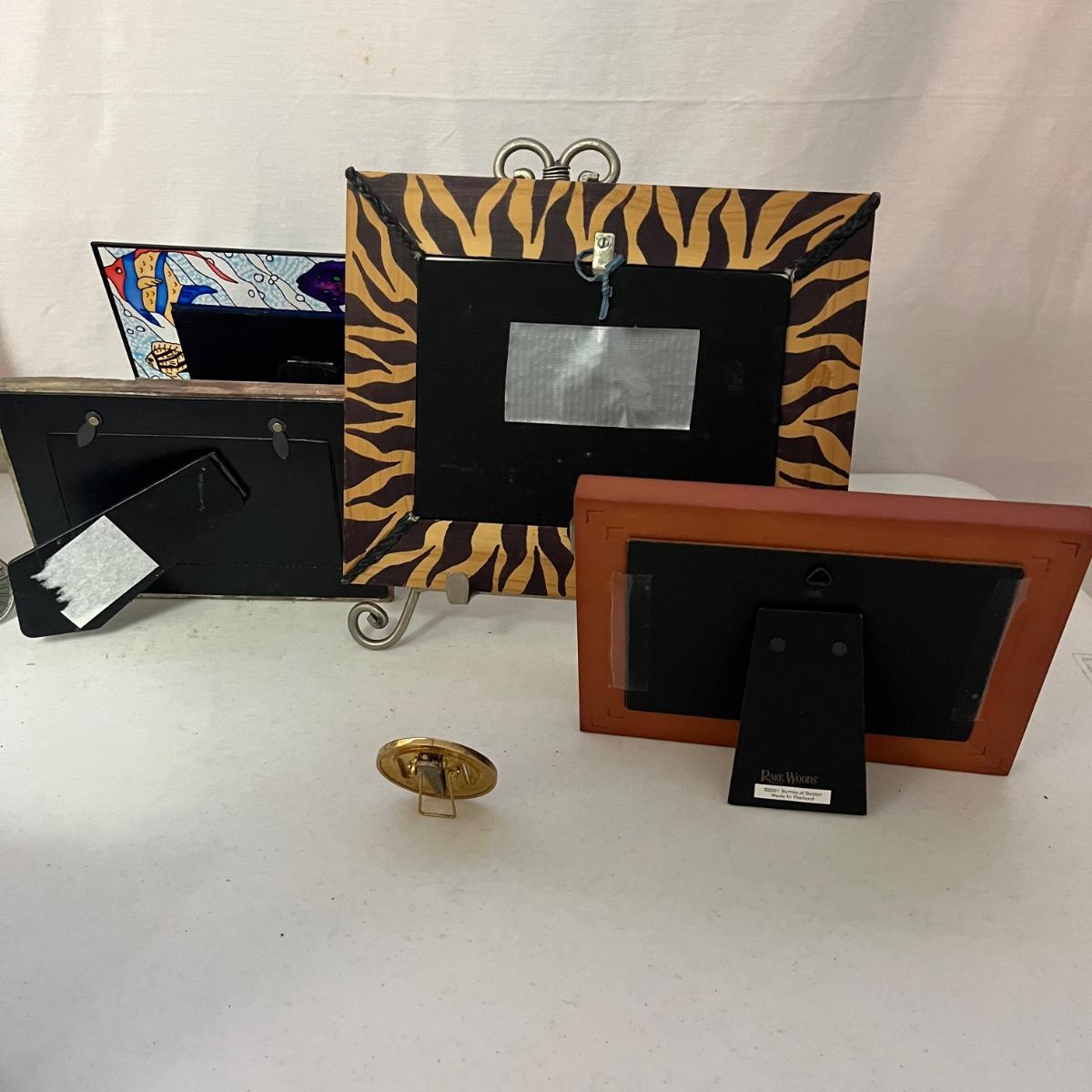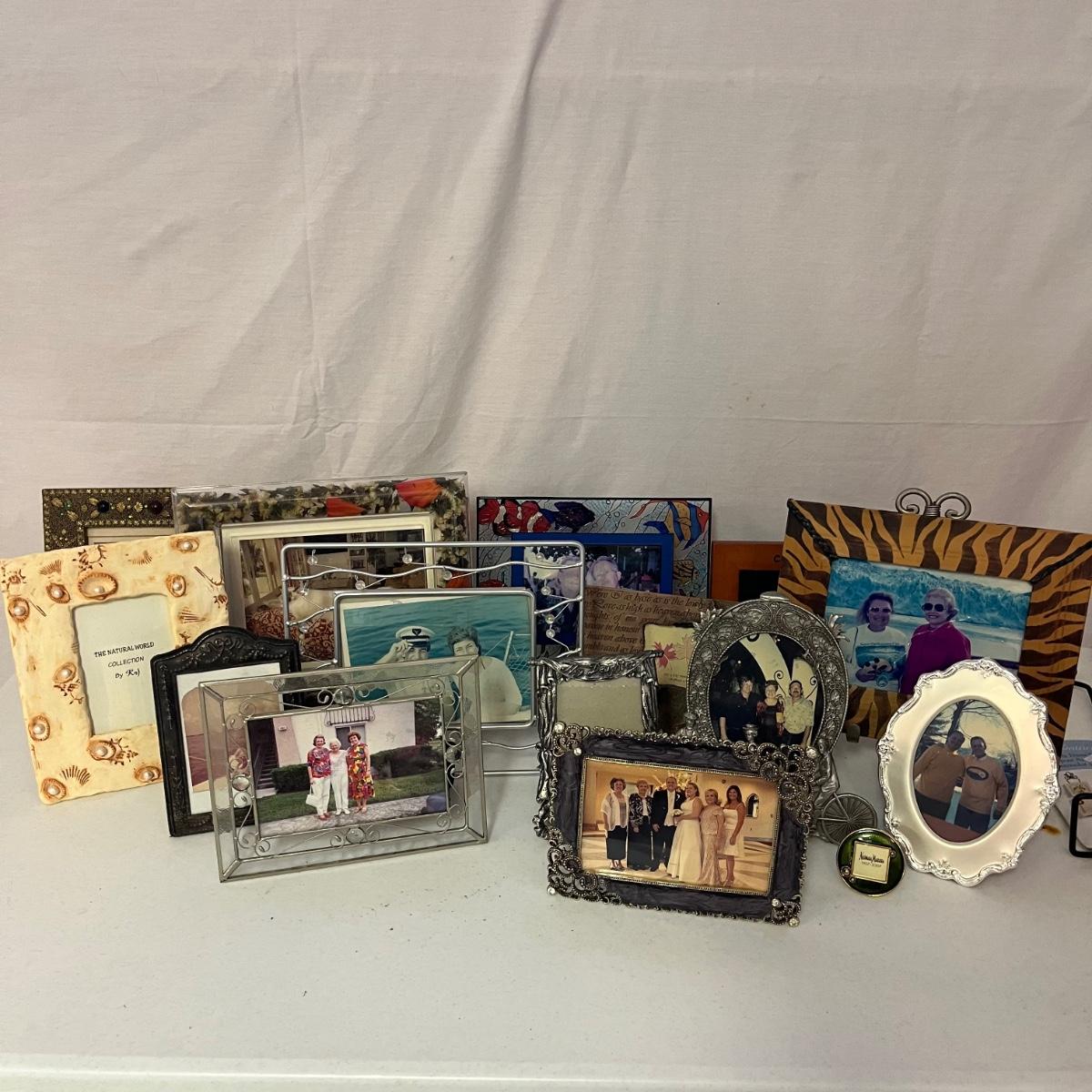 Lot includes over 20 pictures games in a variety of shapes sizes and materials. Frames are made from wood, plastic, metal and ceramic. Largest frame measures 9.5” x 11”H.