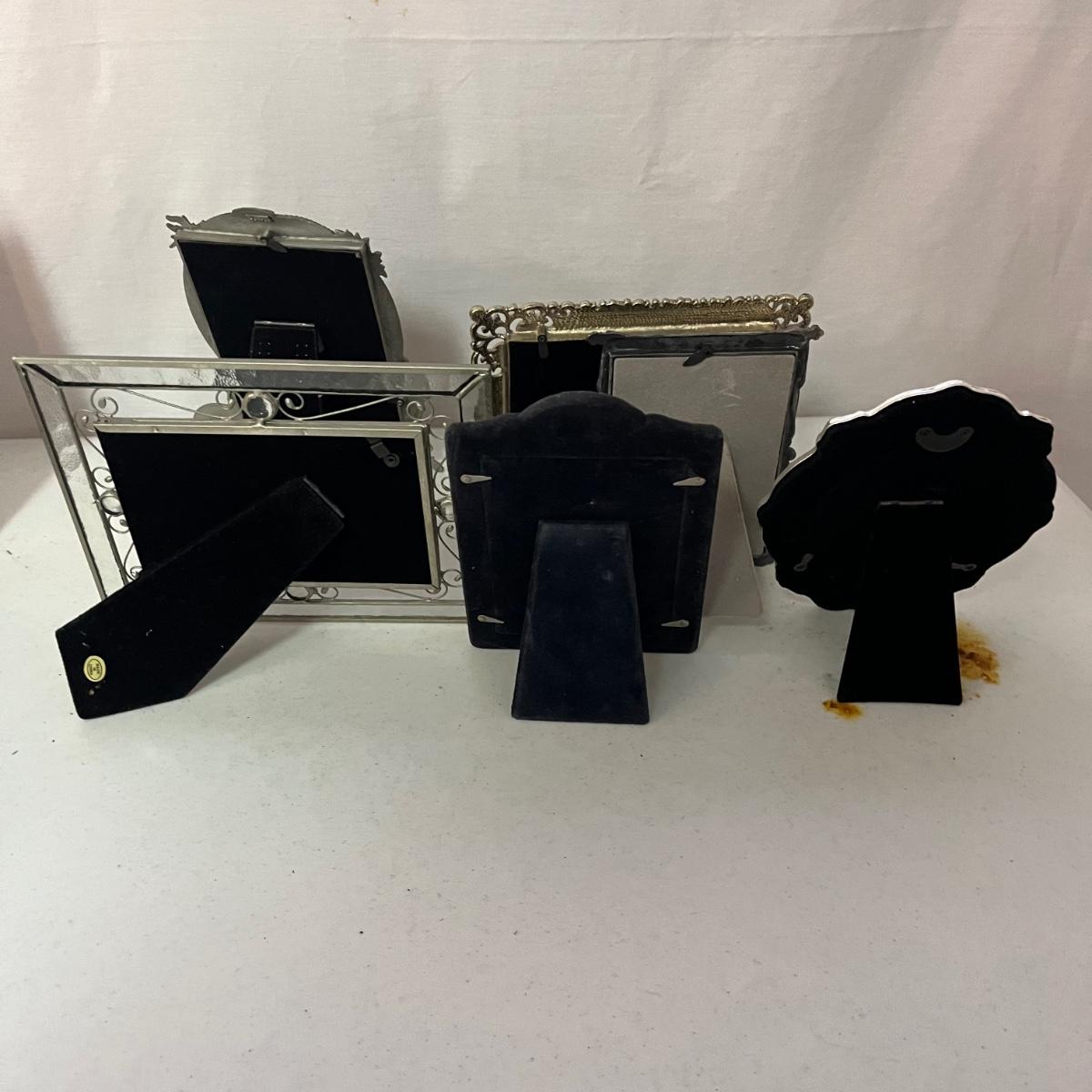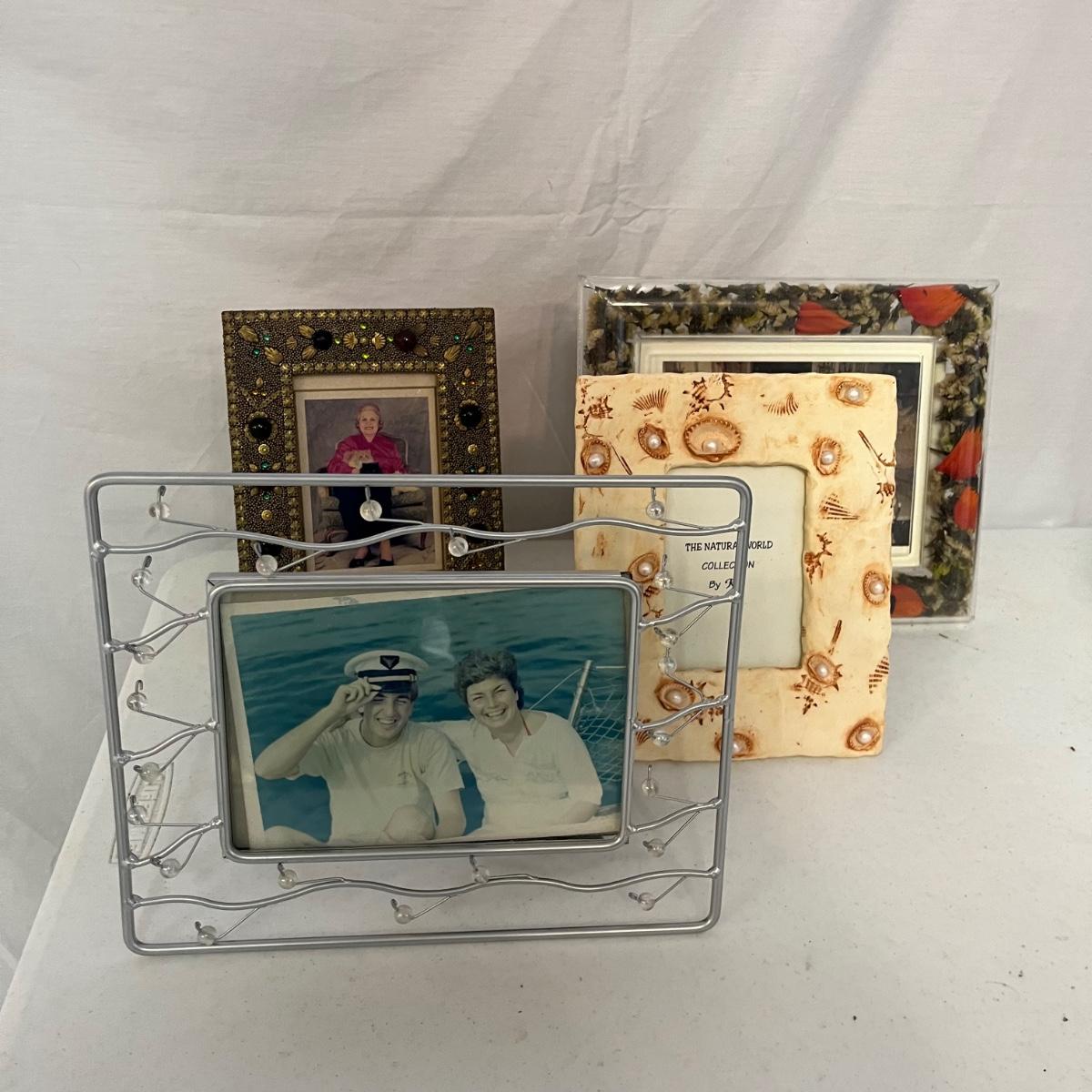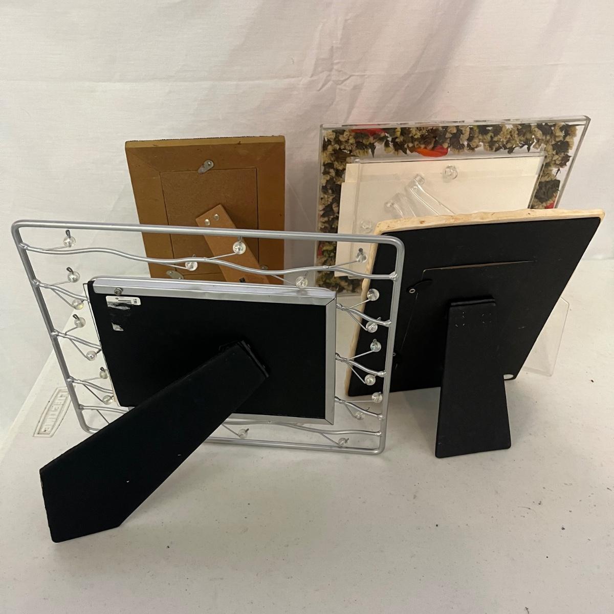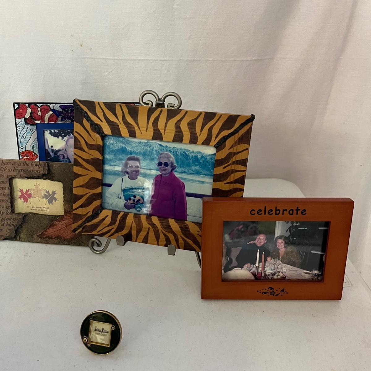 Lot includes over 20 pictures games in a variety of shapes sizes and materials. Frames are made from wood, plastic, metal and ceramic. Largest frame measures 9.5” x 11”H.