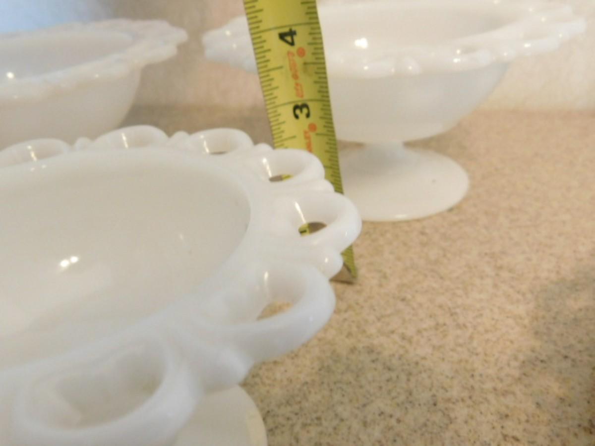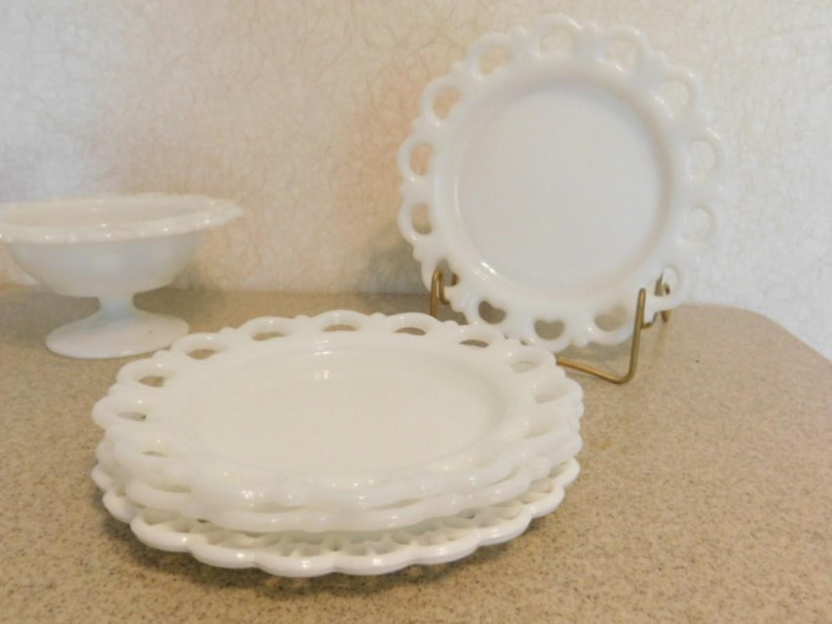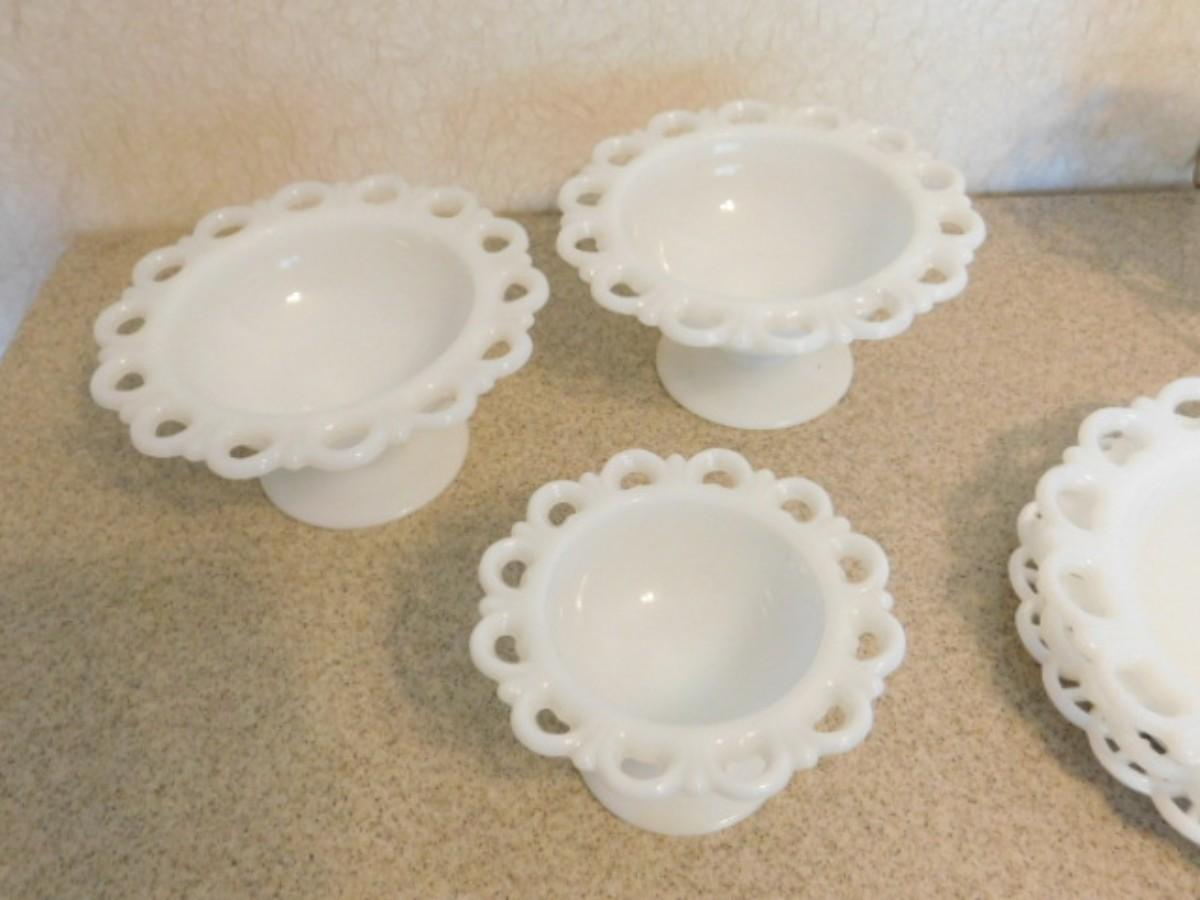 Assortment of Pierce Edge Milk Glass Plates and Footed Bowls