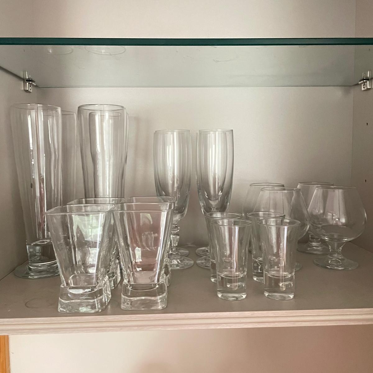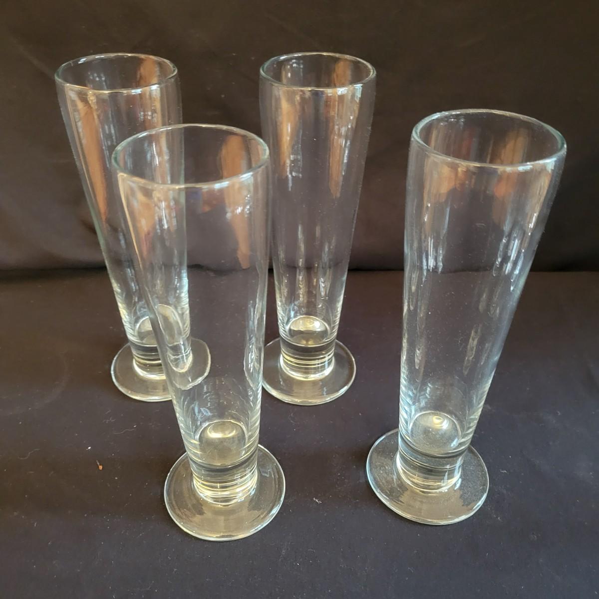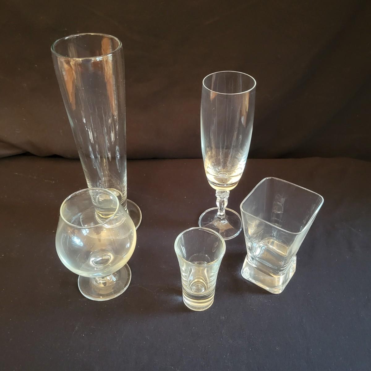 An assortment of 20 glasses in quantities of four in each style. Included are shot glasses, brandy glasses, flutes, pilsner glasses and square cocktail glasses. The pilsner glasses are approximately 10" tall. Local pick up only.