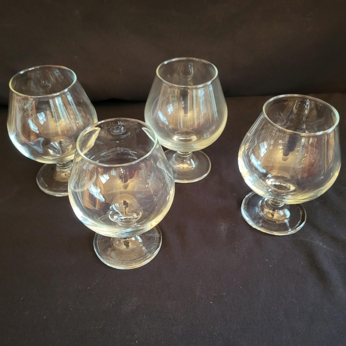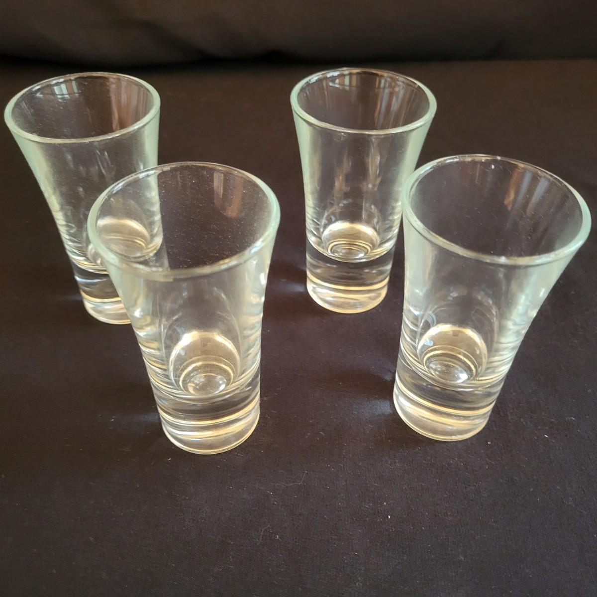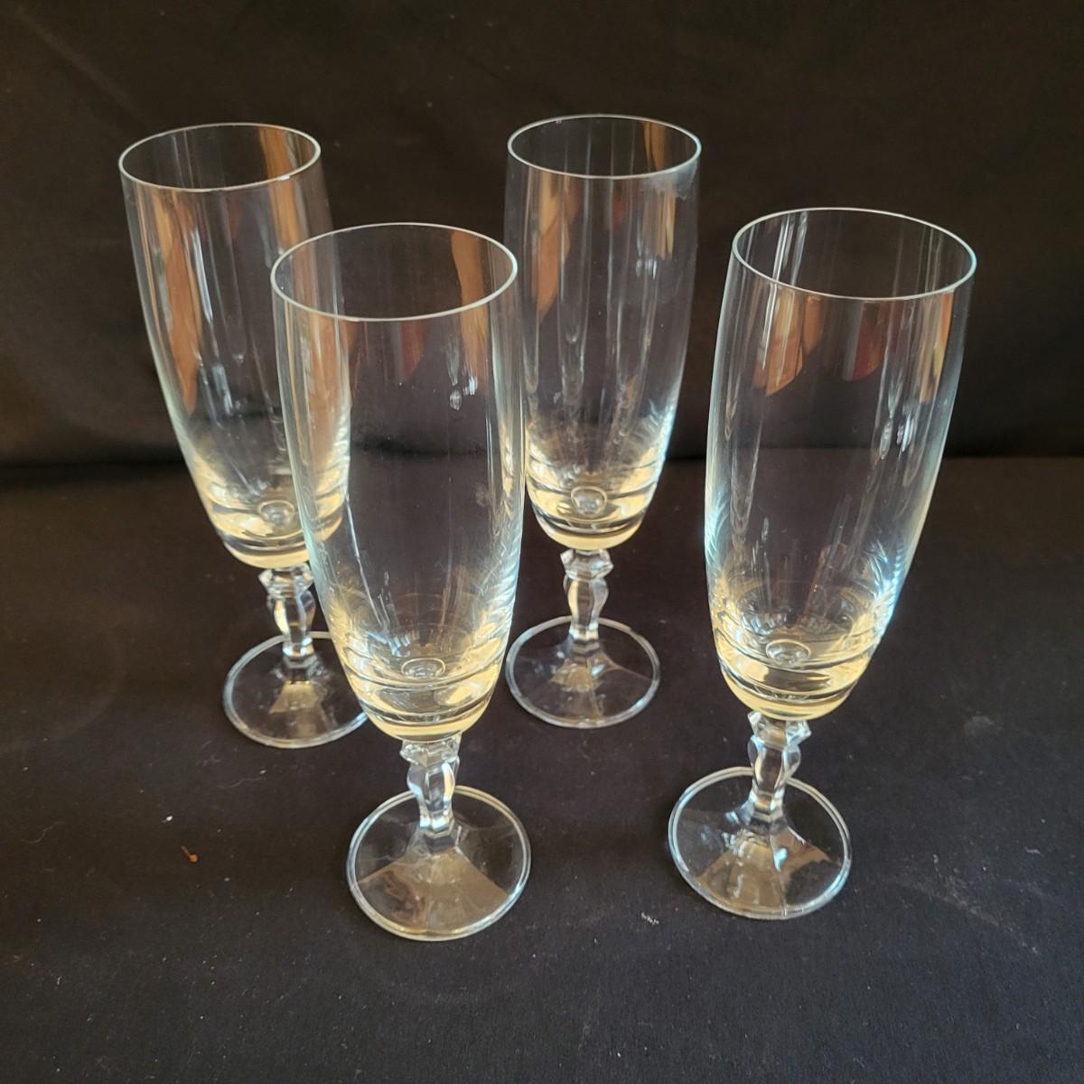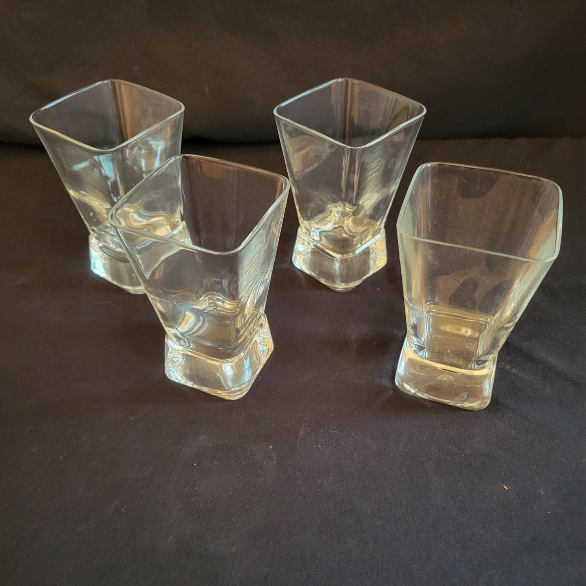An assortment of 20 glasses in quantities of four in each style. Included are shot glasses, brandy glasses, flutes, pilsner glasses and square cocktail glasses. The pilsner glasses are approximately 10" tall. Local pick up only.