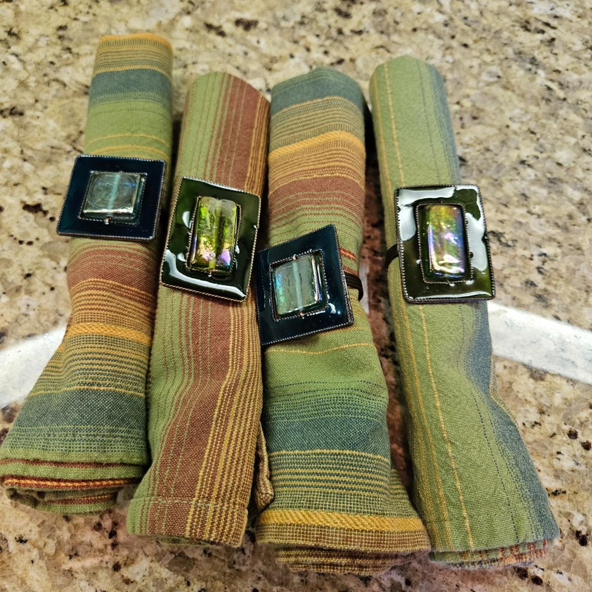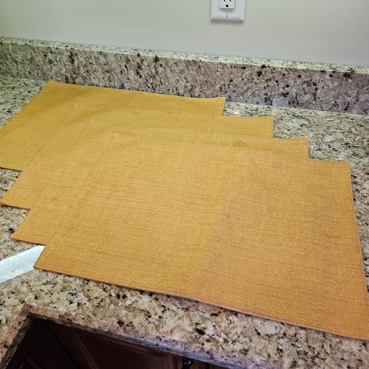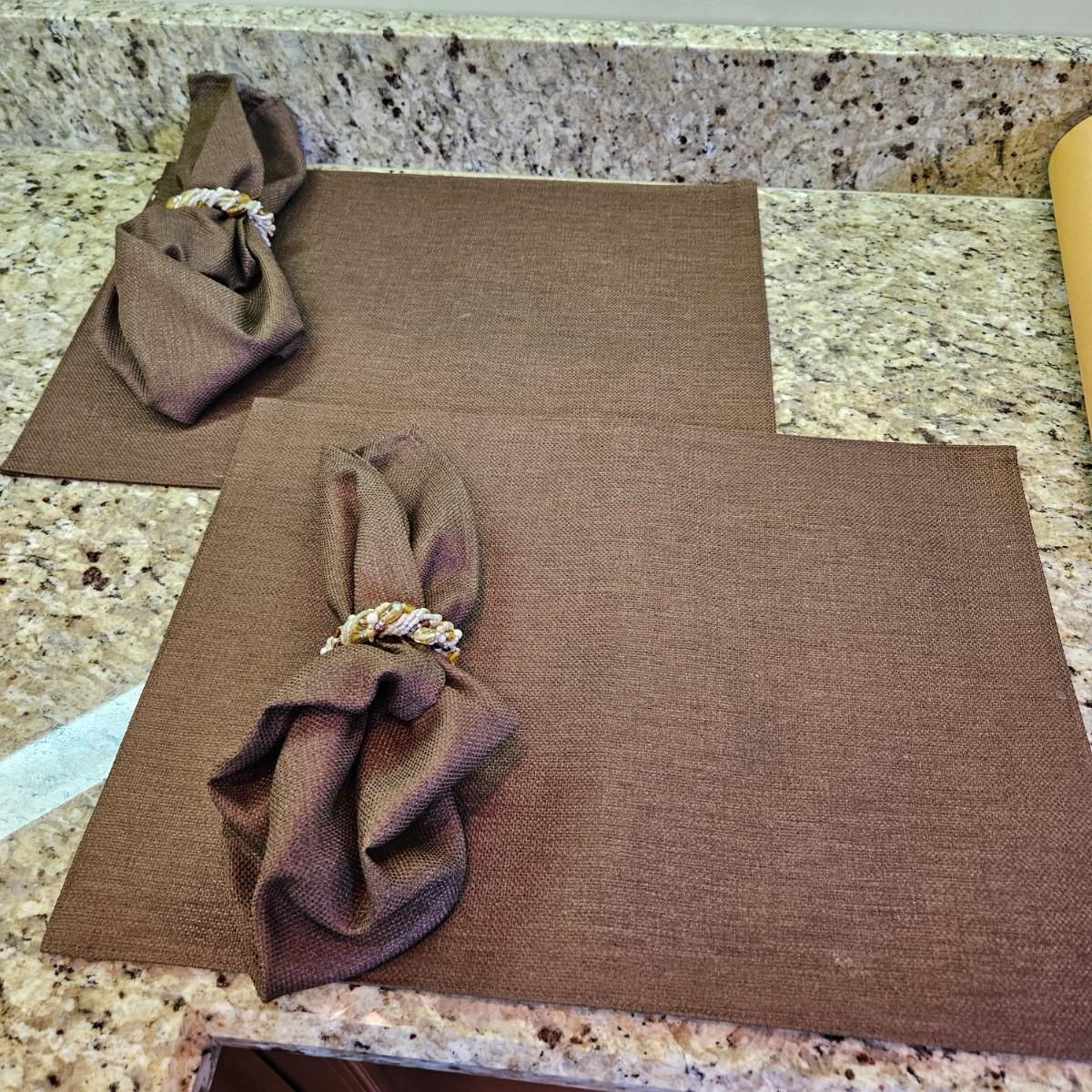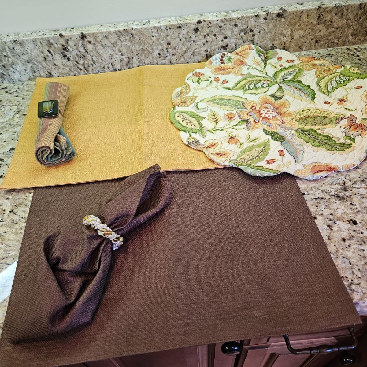 An assortment of table decor that includes 10 placemats, six napkins and six napkin rings. Four rings are made of glass and metal, two are beaded rings. The golden placemats measure approximately 20" x 14". Shipping available