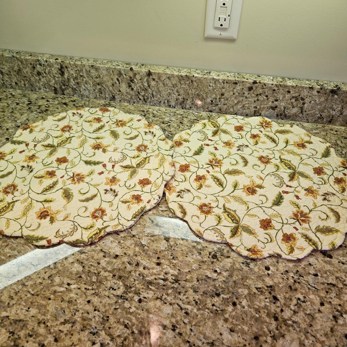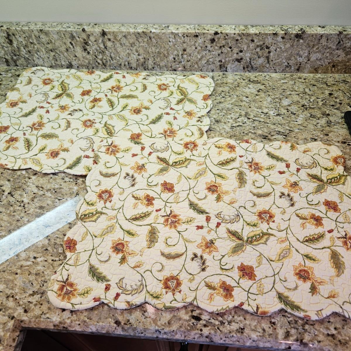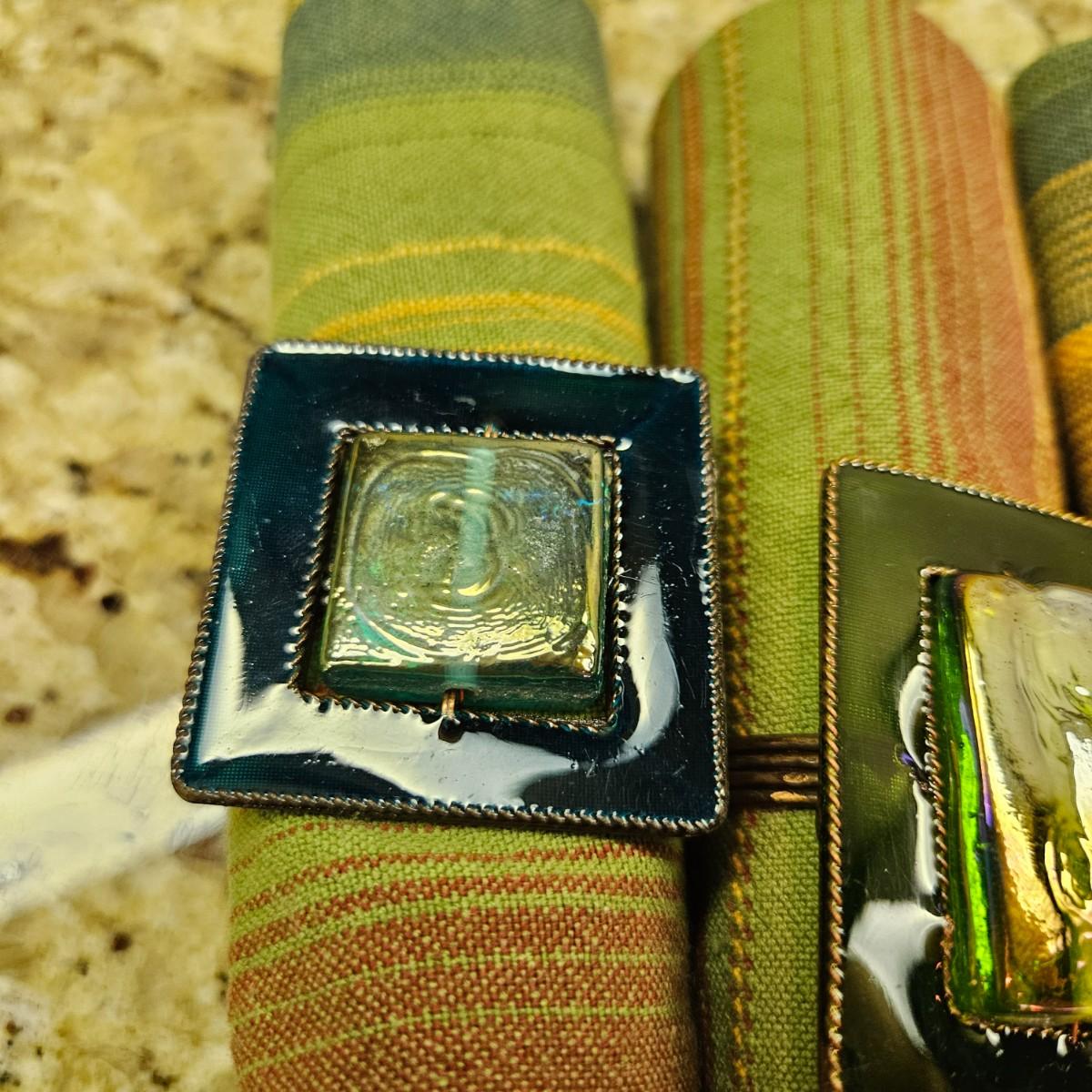 An assortment of table decor that includes 10 placemats, six napkins and six napkin rings. Four rings are made of glass and metal, two are beaded rings. The golden placemats measure approximately 20" x 14". Shipping available