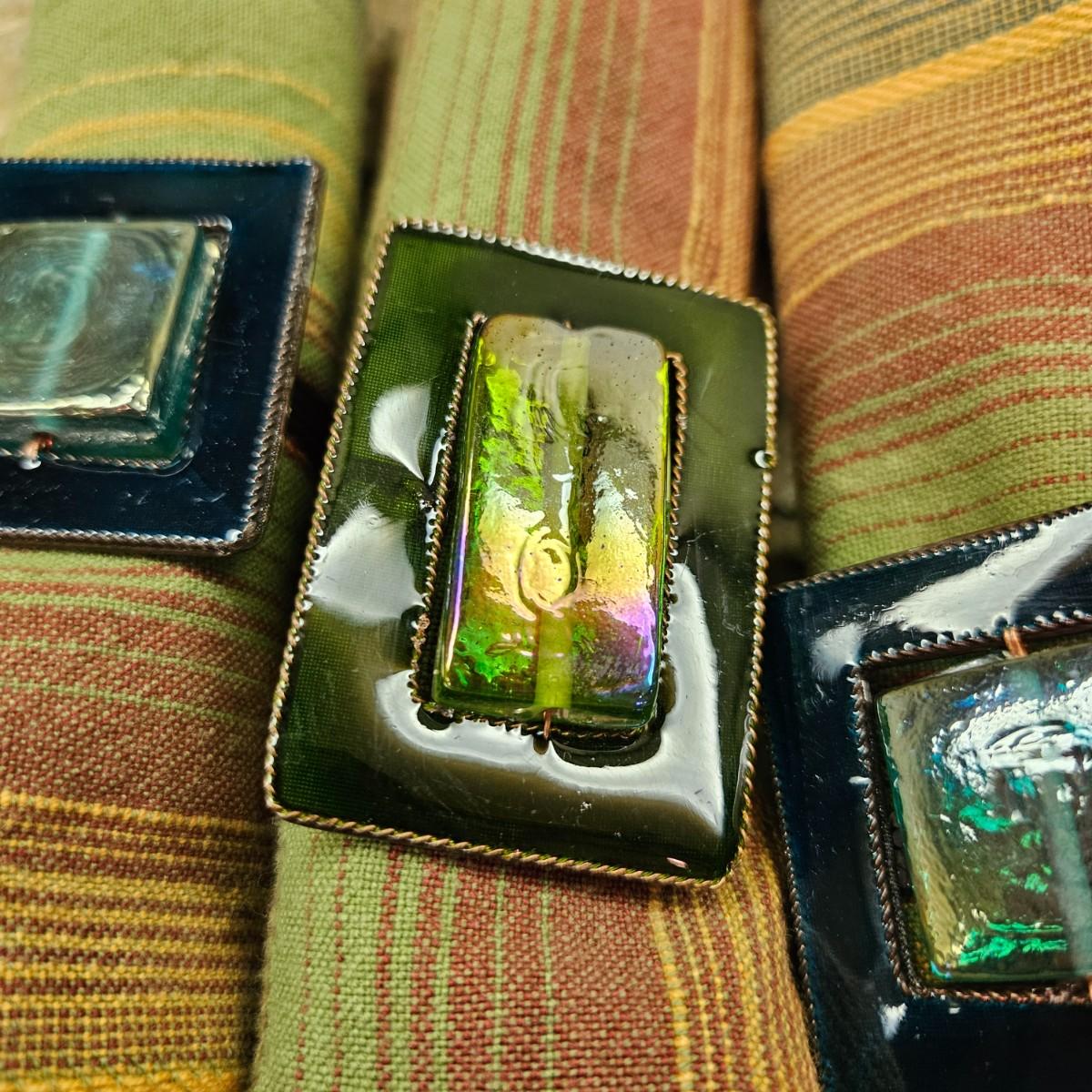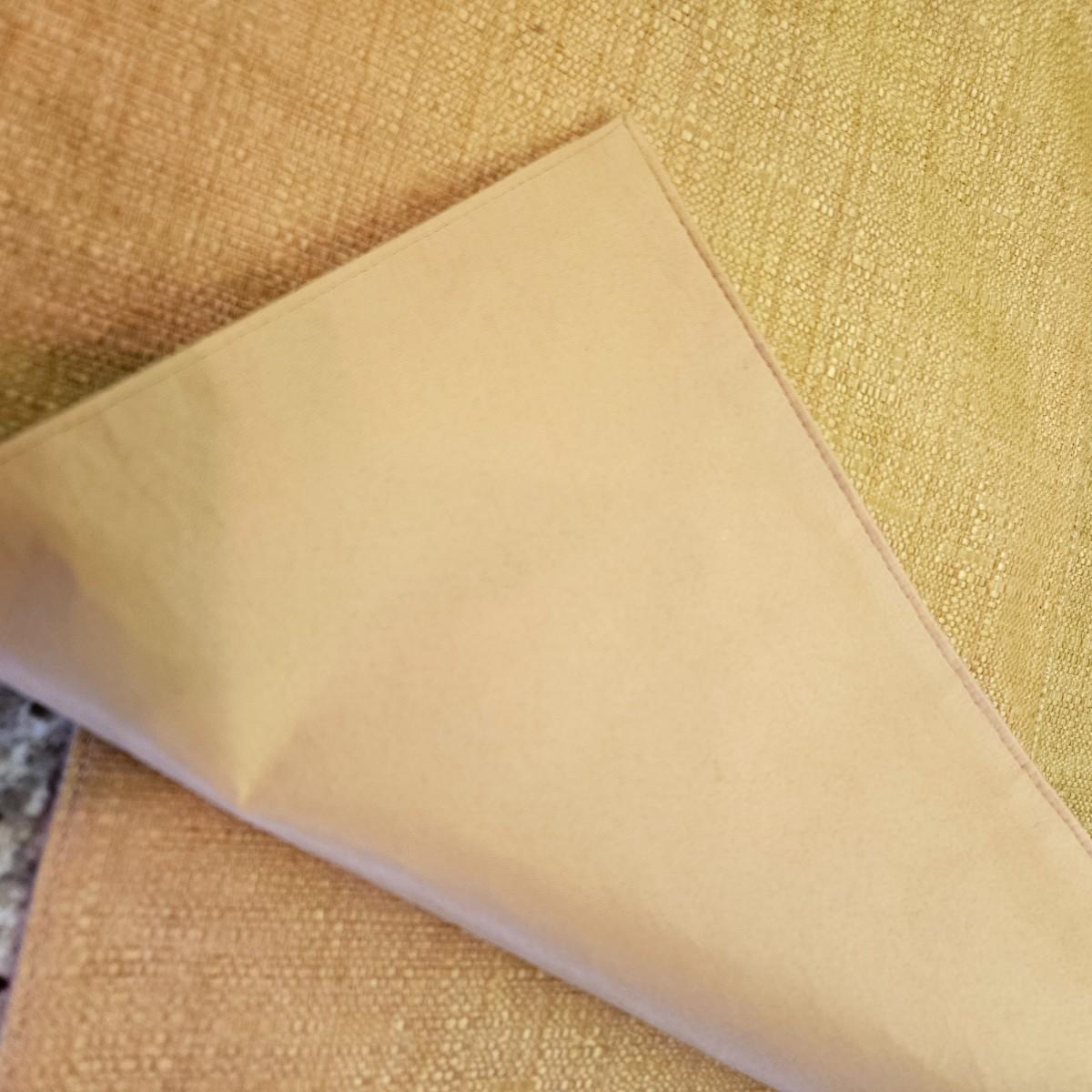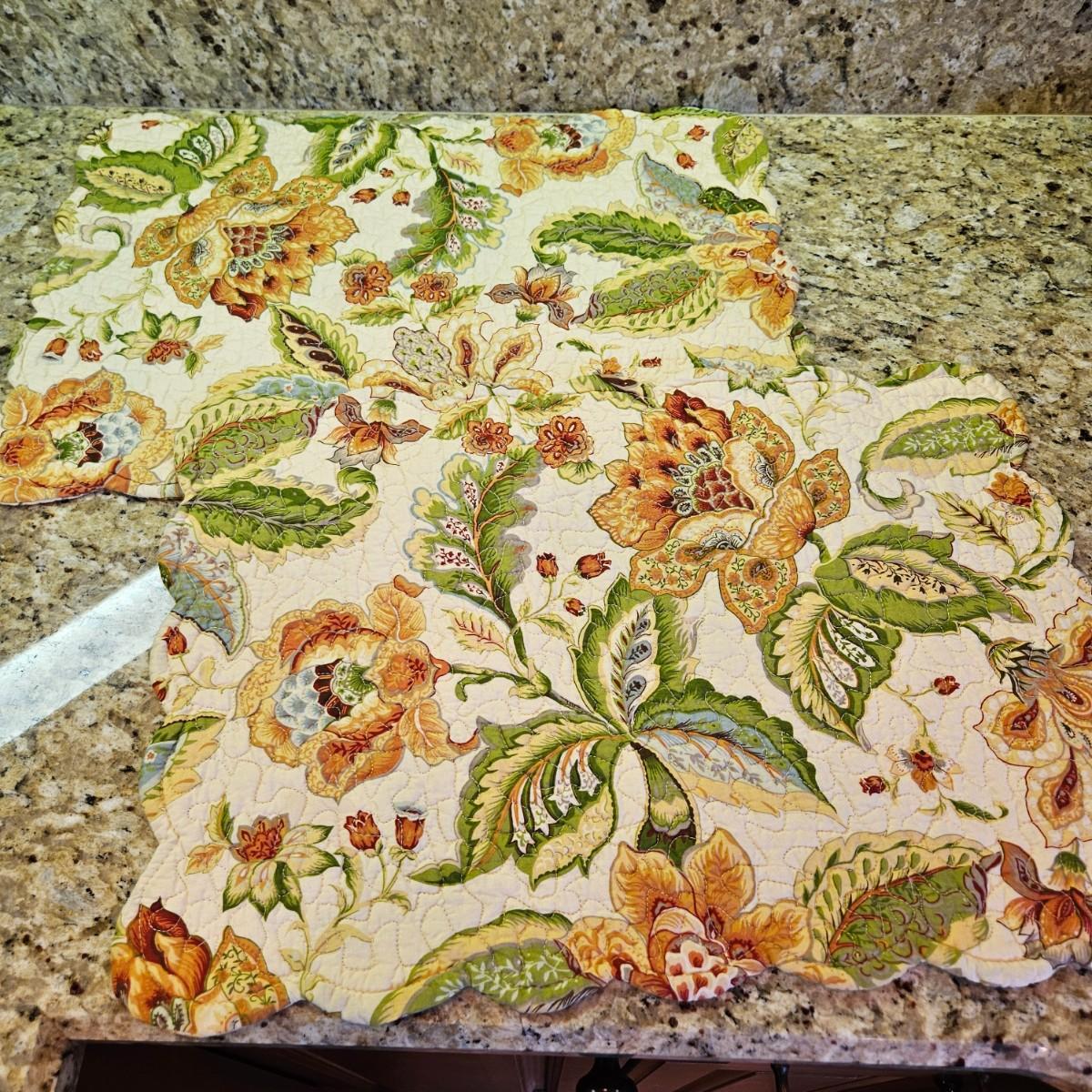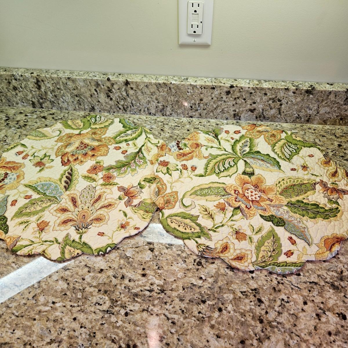 An assortment of table decor that includes 10 placemats, six napkins and six napkin rings. Four rings are made of glass and metal, two are beaded rings. The golden placemats measure approximately 20" x 14". Shipping available