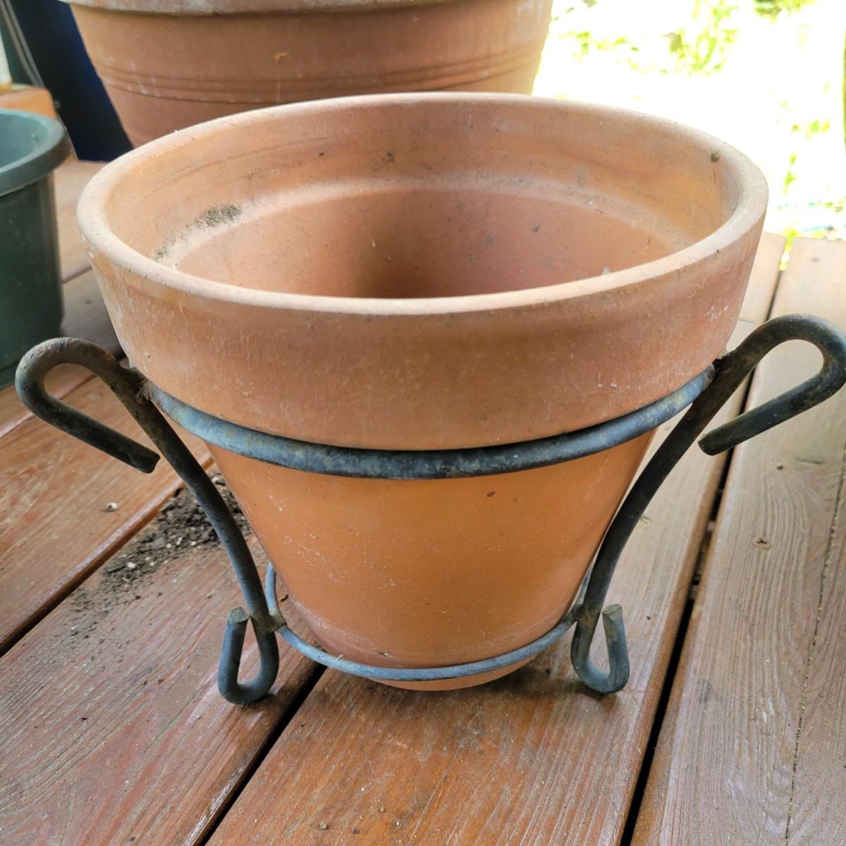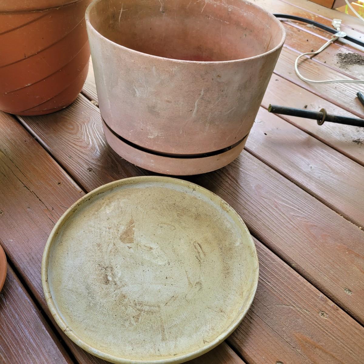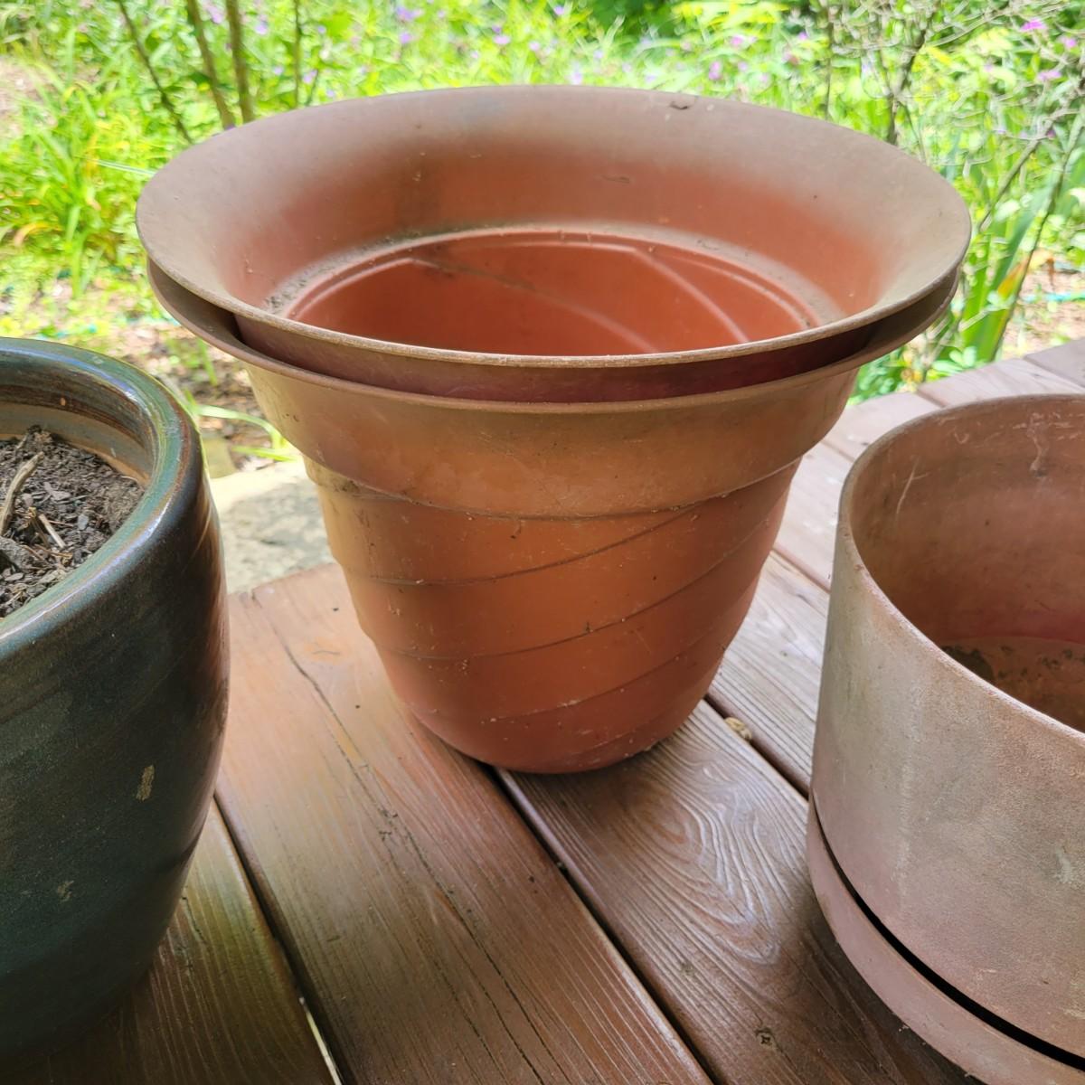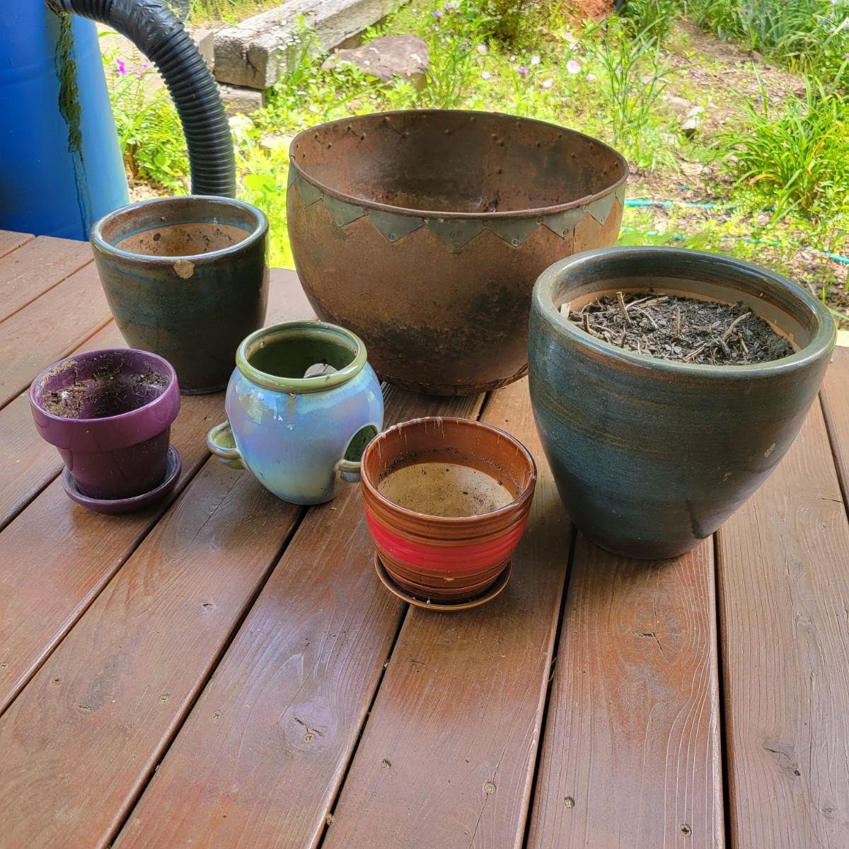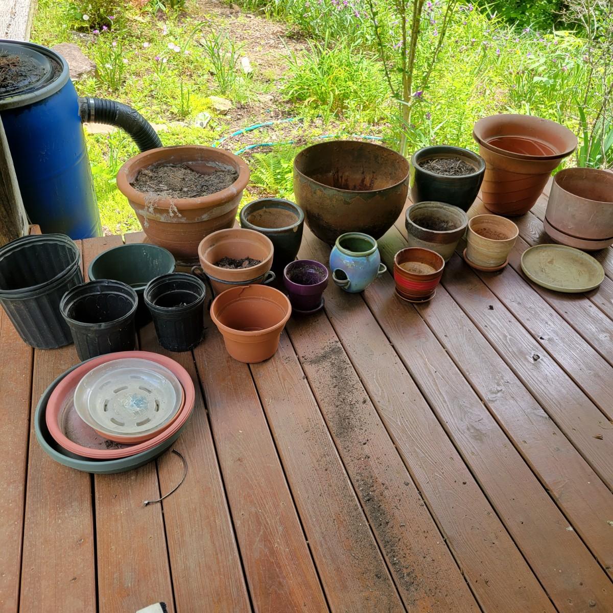 An assortment of over 20 pots and bases in a variety of sizes and materials. About half of them are plastic, but there is also ceramic, terracotta and one metal pot. The large metal pot pictured last measures approximately 16"D x 12"H. Local pickup only