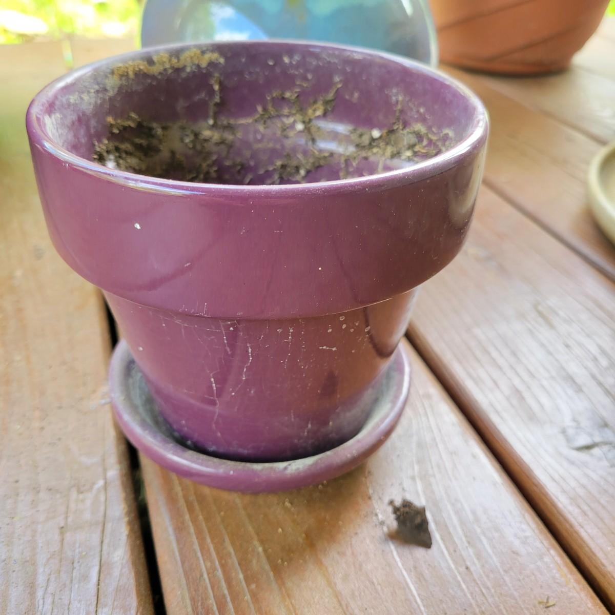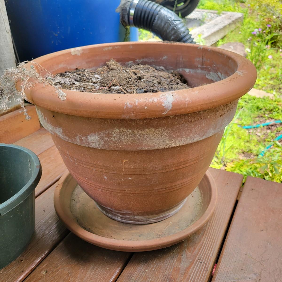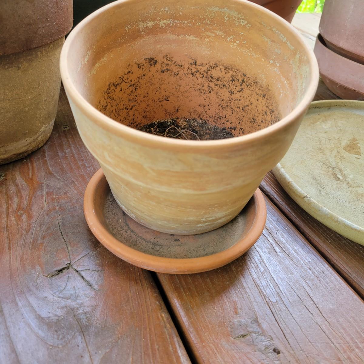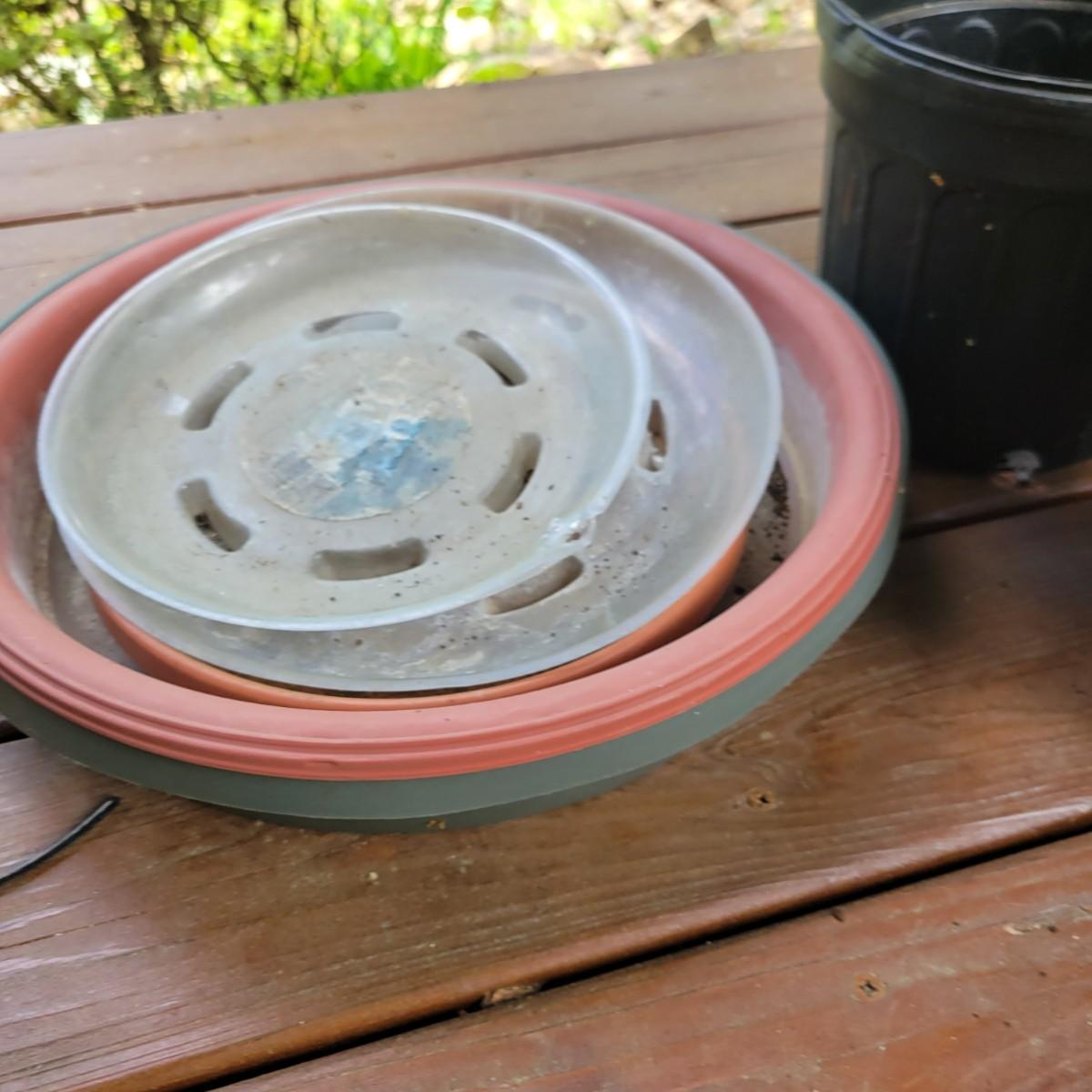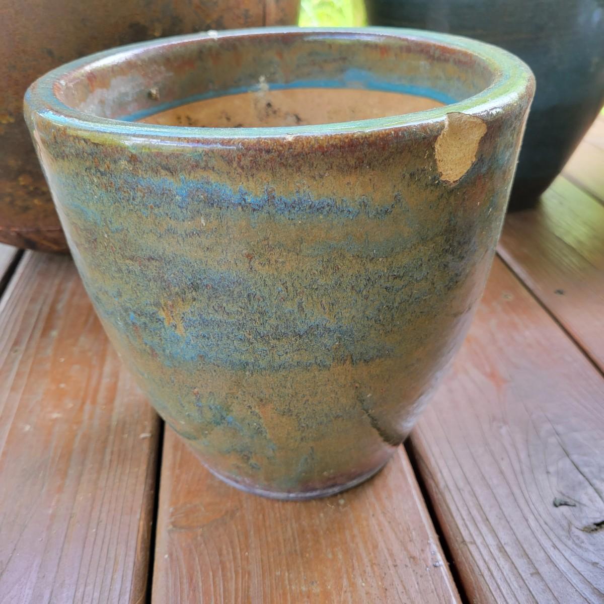 An assortment of over 20 pots and bases in a variety of sizes and materials. About half of them are plastic, but there is also ceramic, terracotta and one metal pot. The large metal pot pictured last measures approximately 16"D x 12"H. Local pickup only