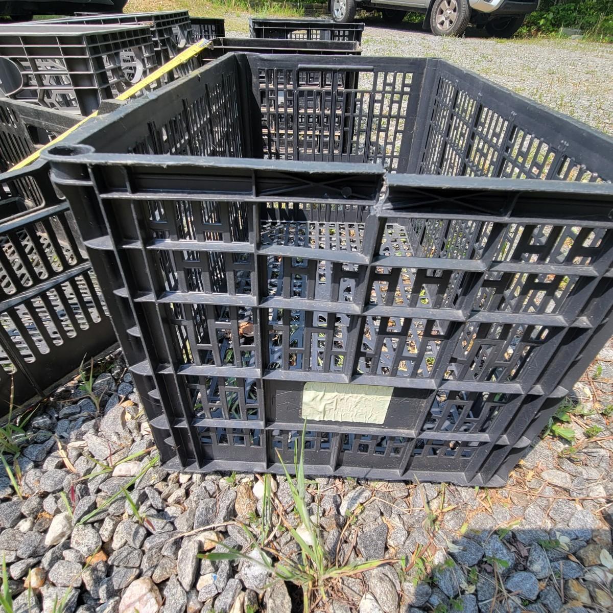 An assortment of 7 plastic crates of varying sizes. One crate has a crack at the handle. The largest crate is 24" x 16" x 10"
