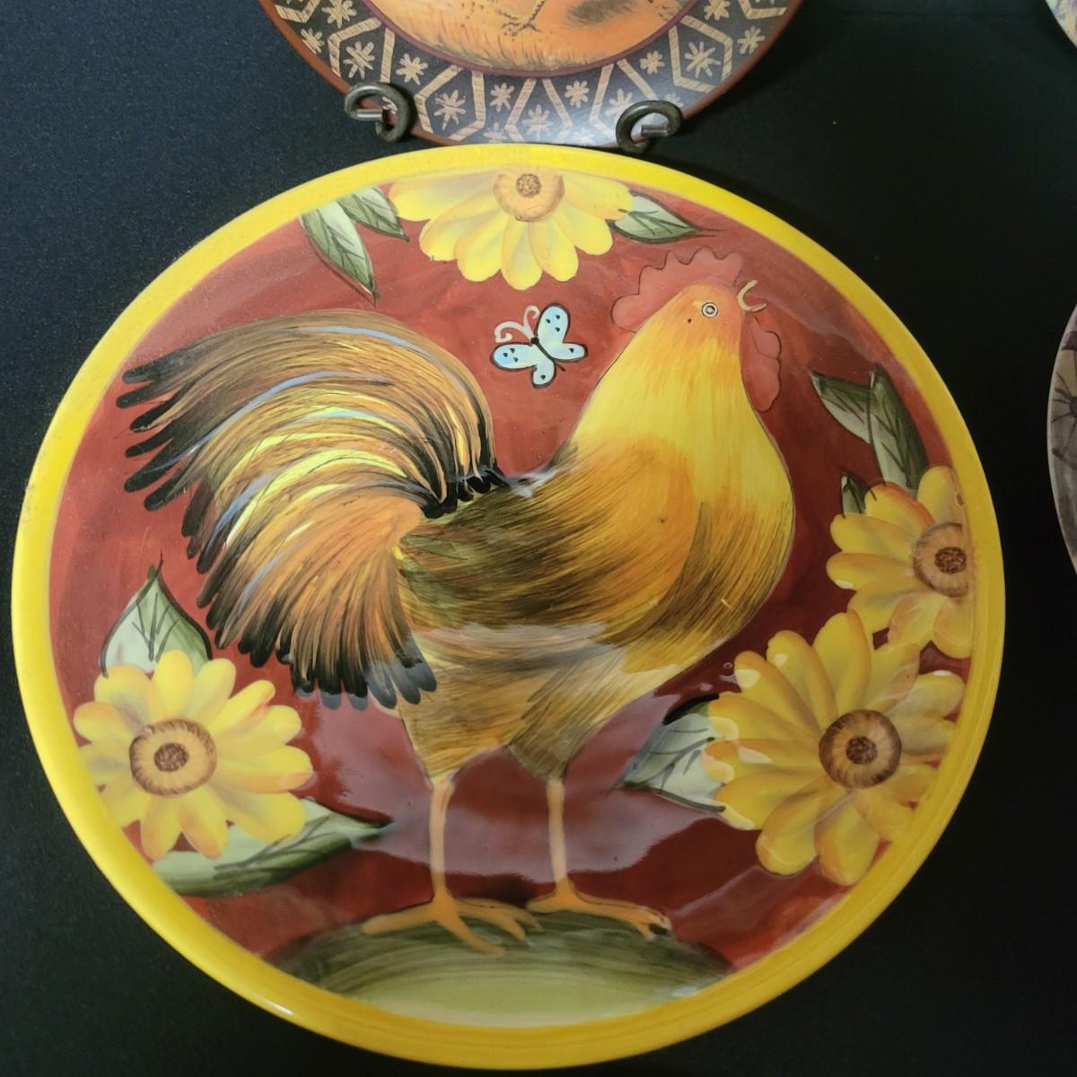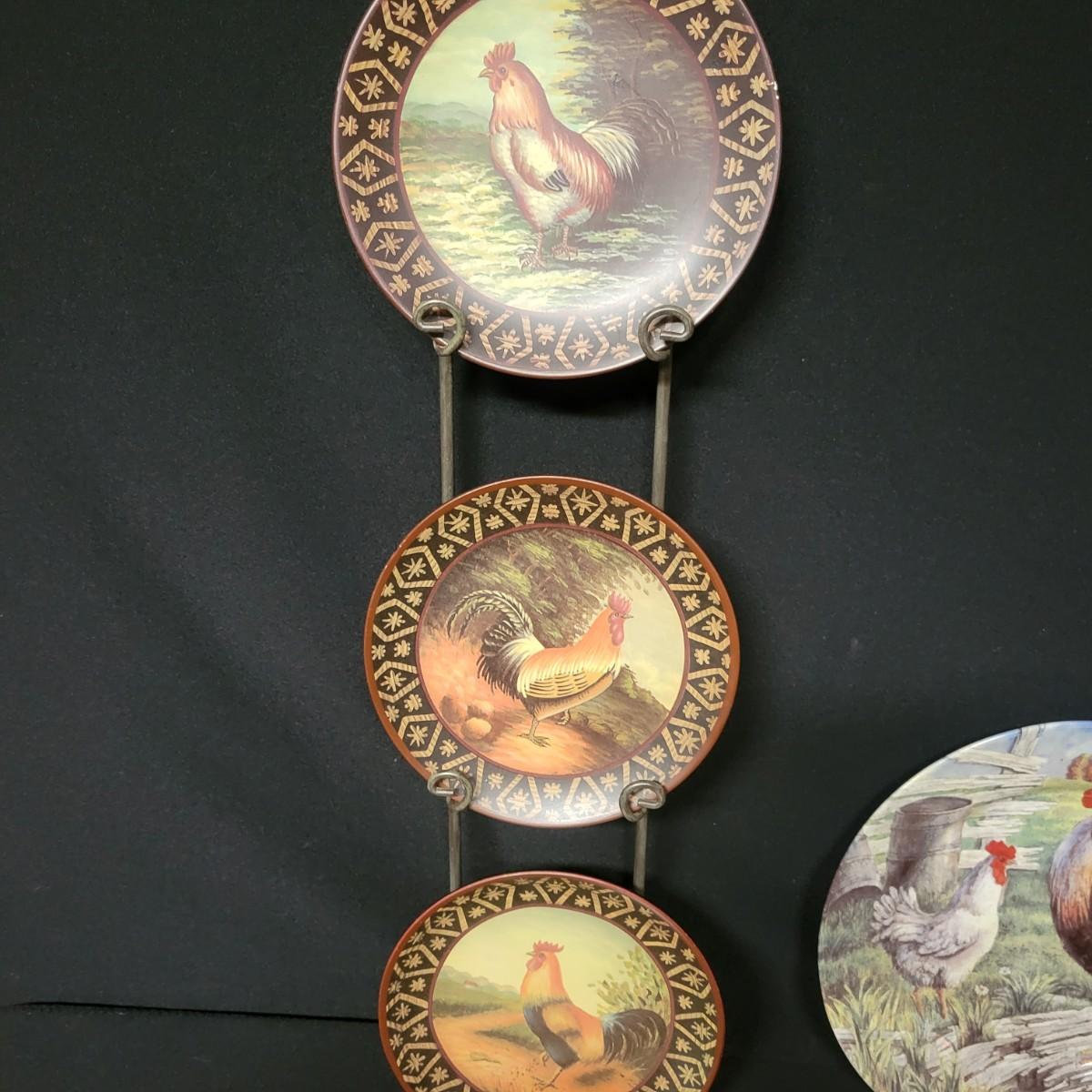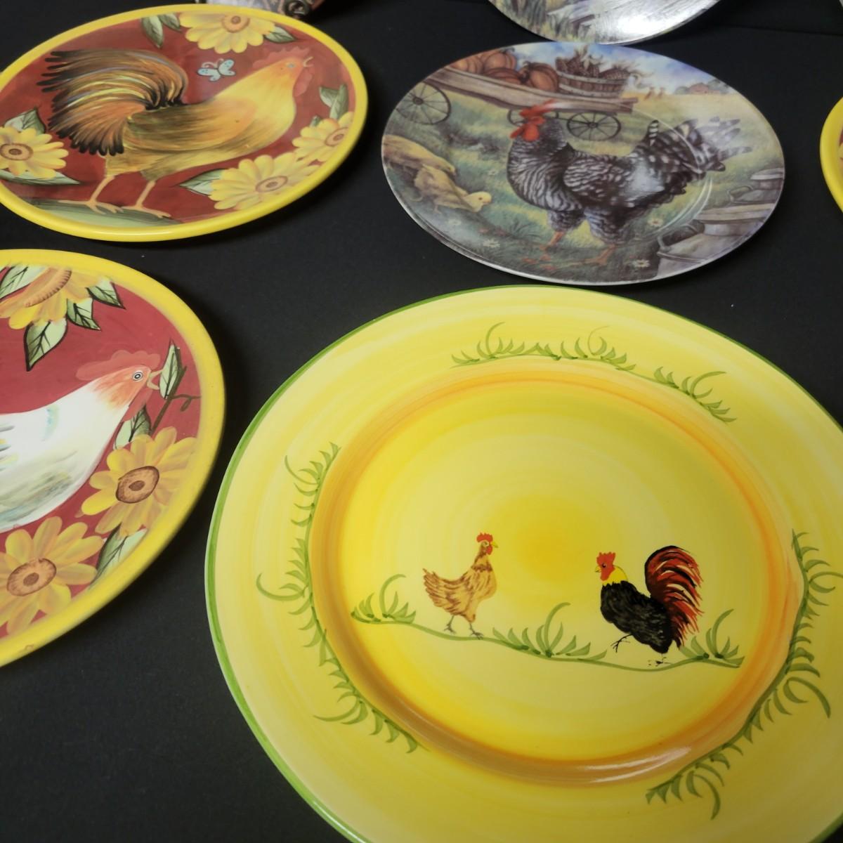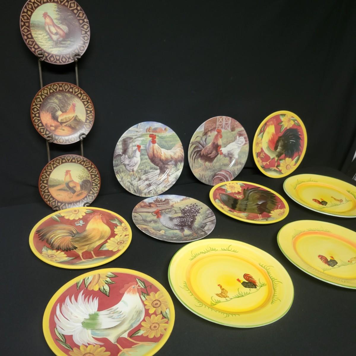An assortment of 1r different plates with a chicken motif in excellent condition. The lot includes 3 small plates with a wrought-iron wall display, 3 printed plates, 4 plates from Cracker Barrel that mimic hand painting and 3 hand painted plate that were made in Portugal. Plates average measurements are 9.5" Shipping available. Shipping can be costly please call UPS store at 828-252-6930 for quote