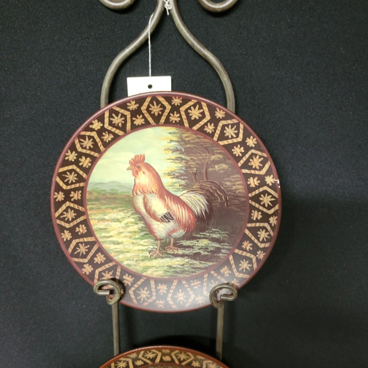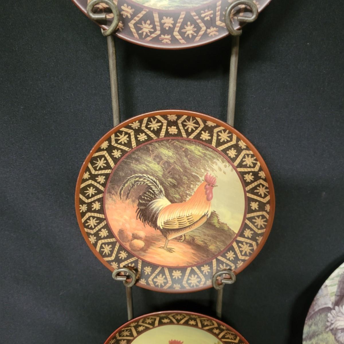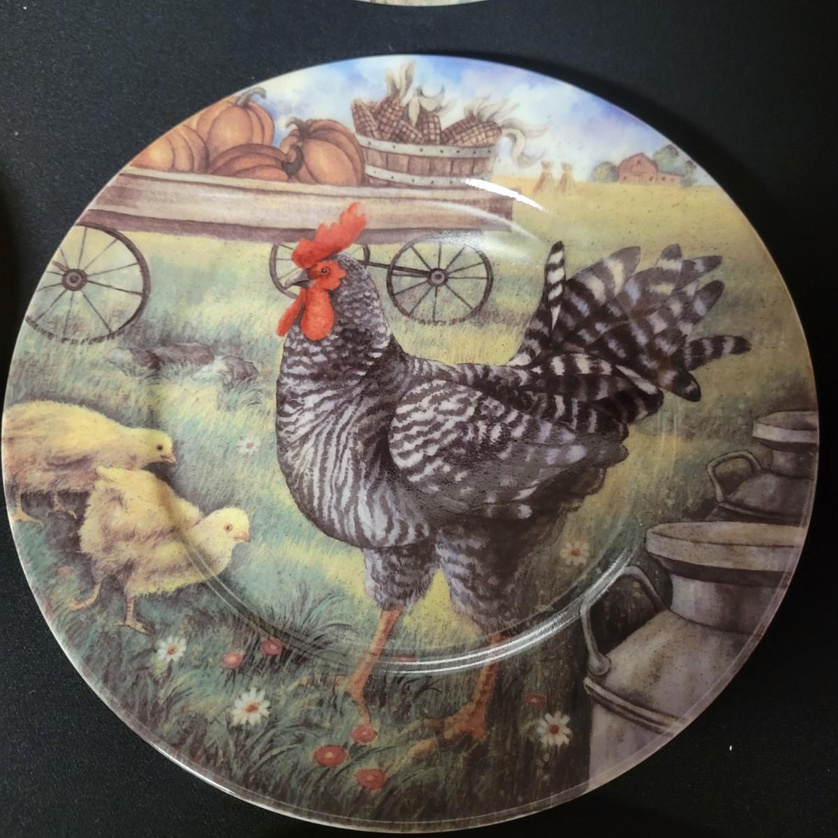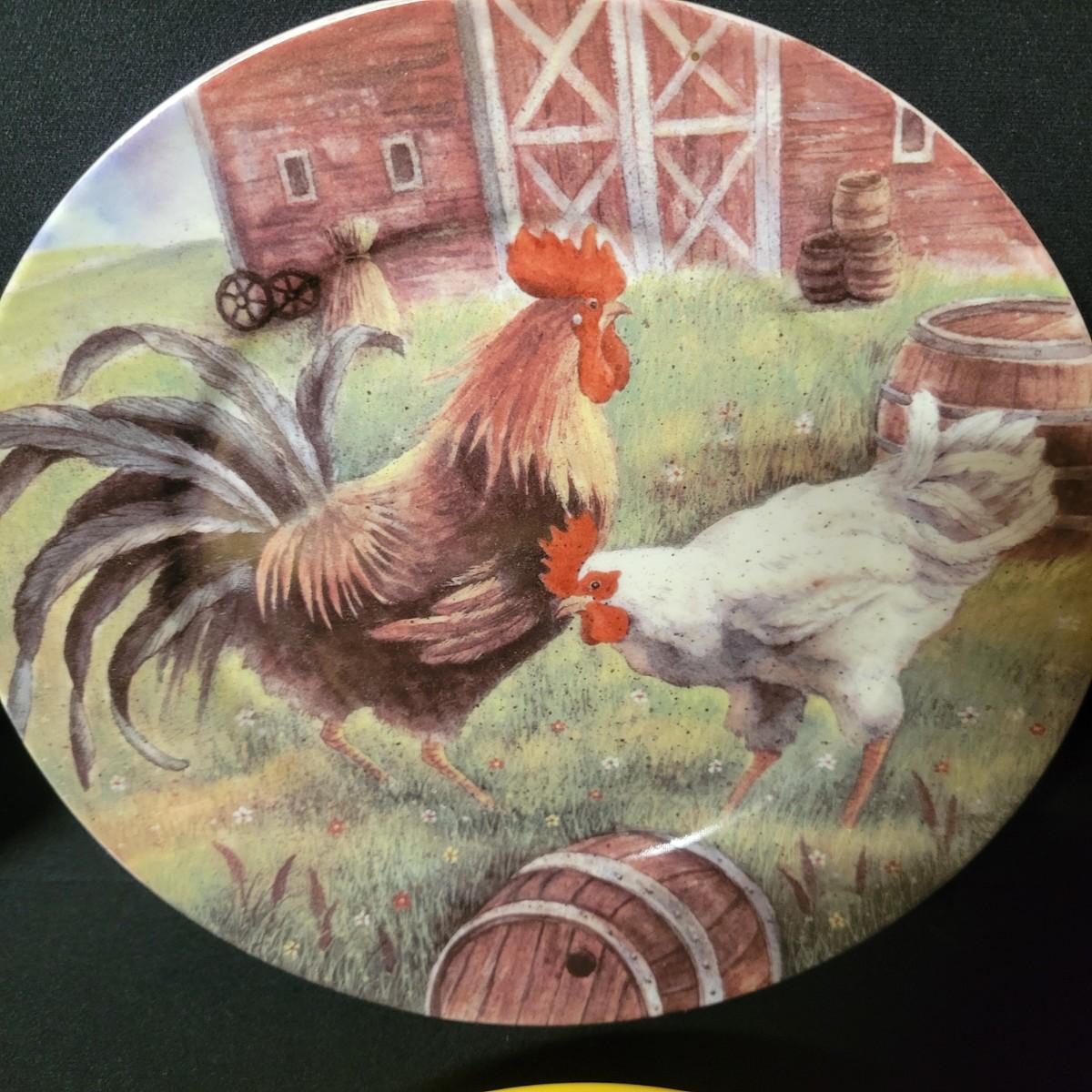 An assortment of 1r different plates with a chicken motif in excellent condition. The lot includes 3 small plates with a wrought-iron wall display, 3 printed plates, 4 plates from Cracker Barrel that mimic hand painting and 3 hand painted plate that were made in Portugal. Plates average measurements are 9.5" Shipping available. Shipping can be costly please call UPS store at 828-252-6930 for quote