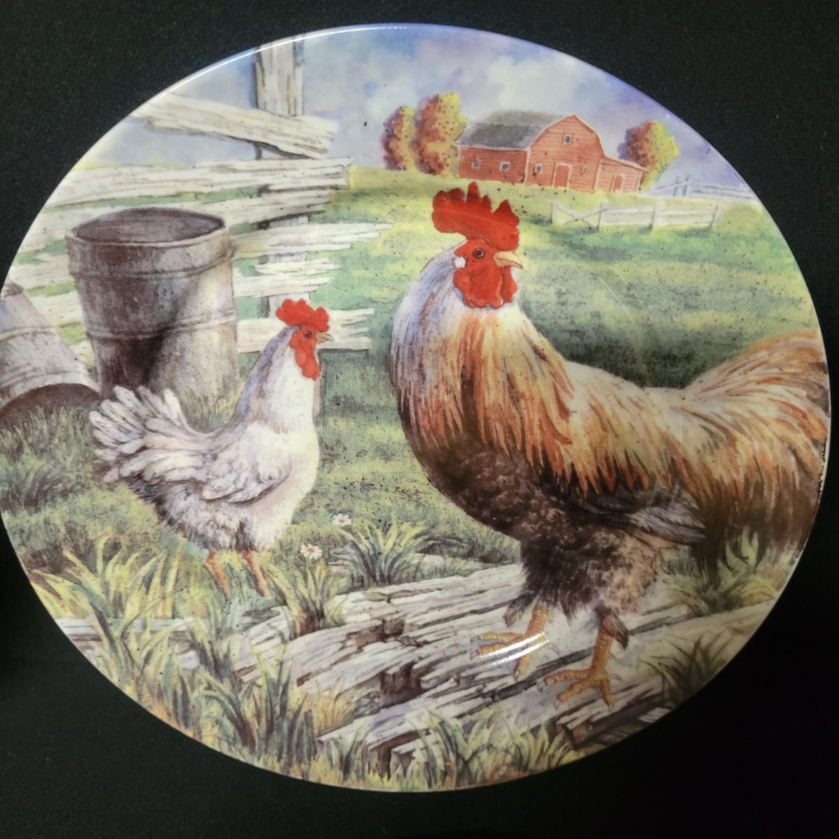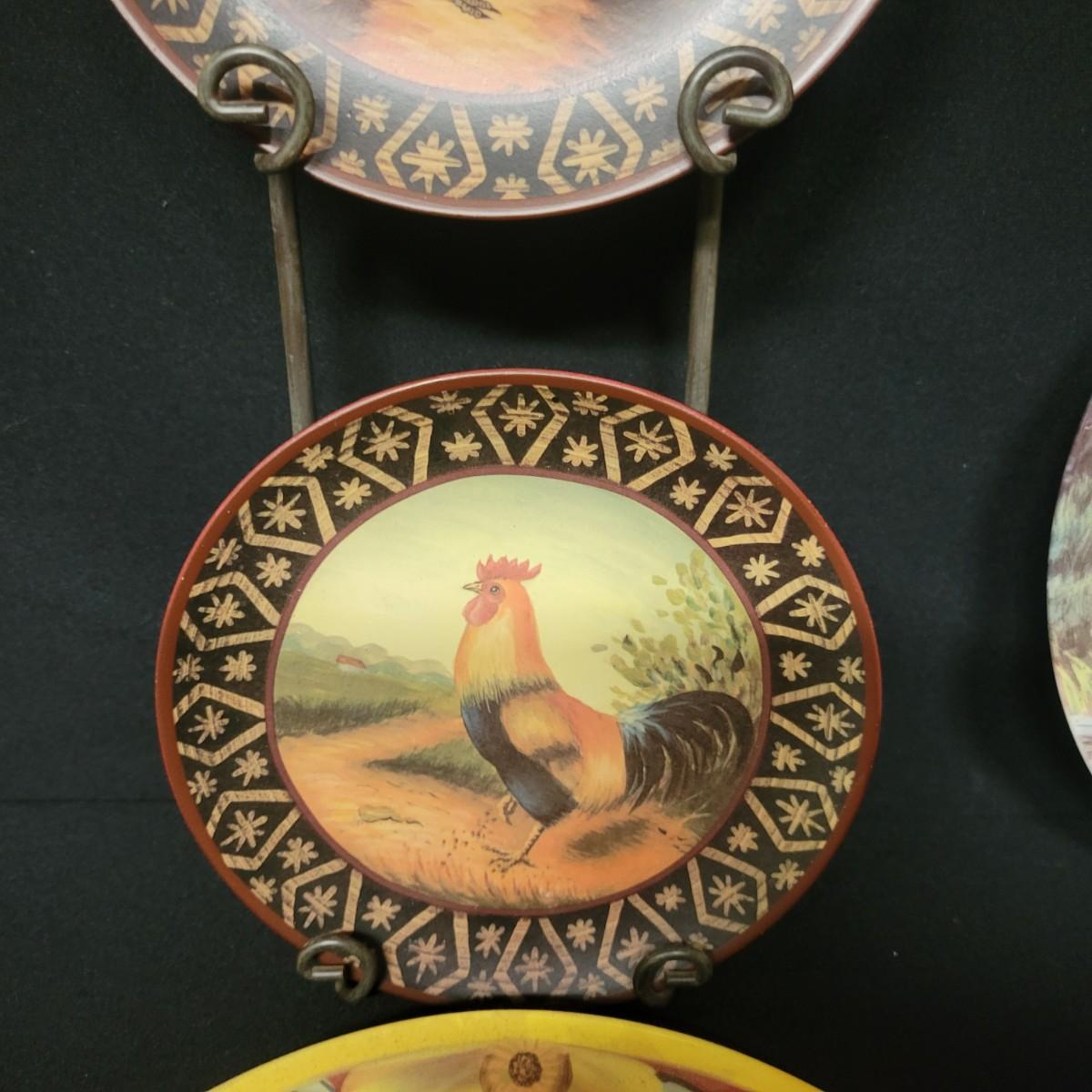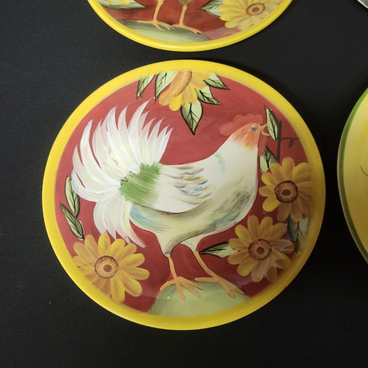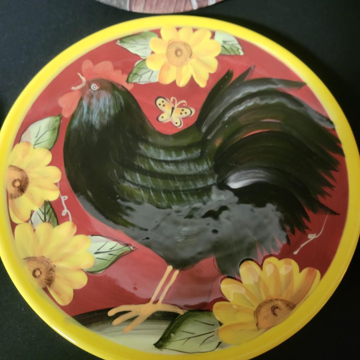 An assortment of 1r different plates with a chicken motif in excellent condition. The lot includes 3 small plates with a wrought-iron wall display, 3 printed plates, 4 plates from Cracker Barrel that mimic hand painting and 3 hand painted plate that were made in Portugal. Plates average measurements are 9.5" Shipping available. Shipping can be costly please call UPS store at 828-252-6930 for quote