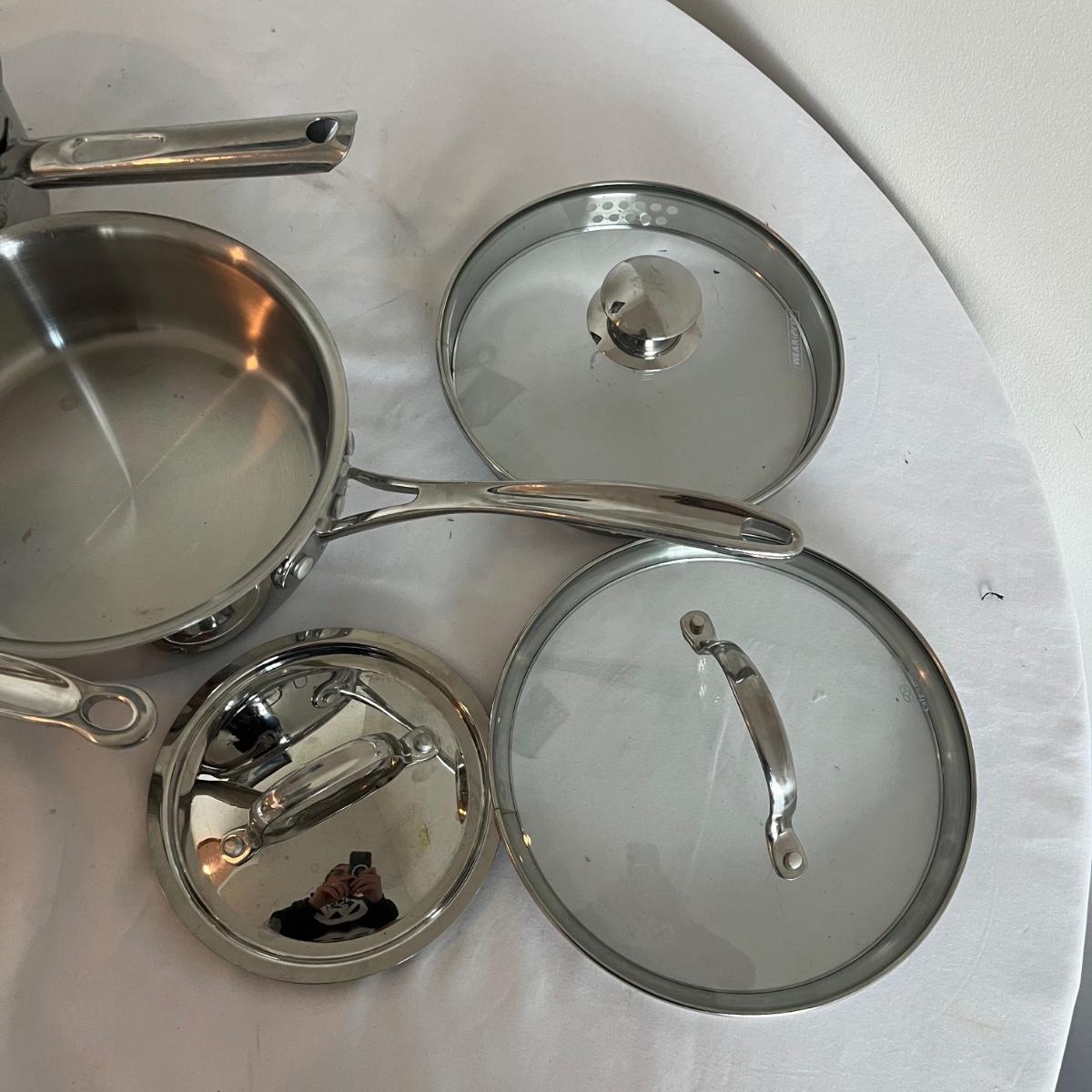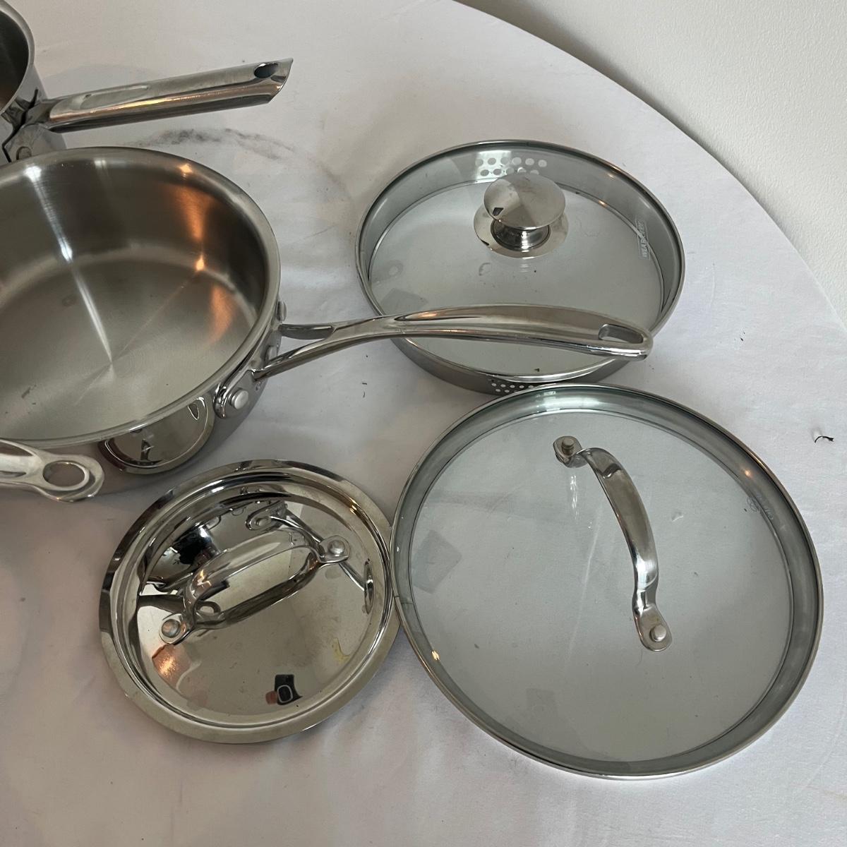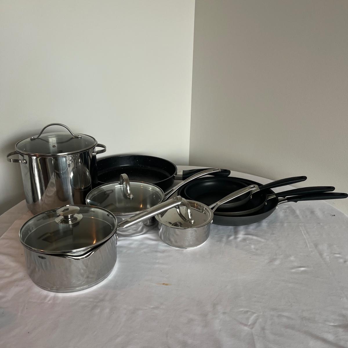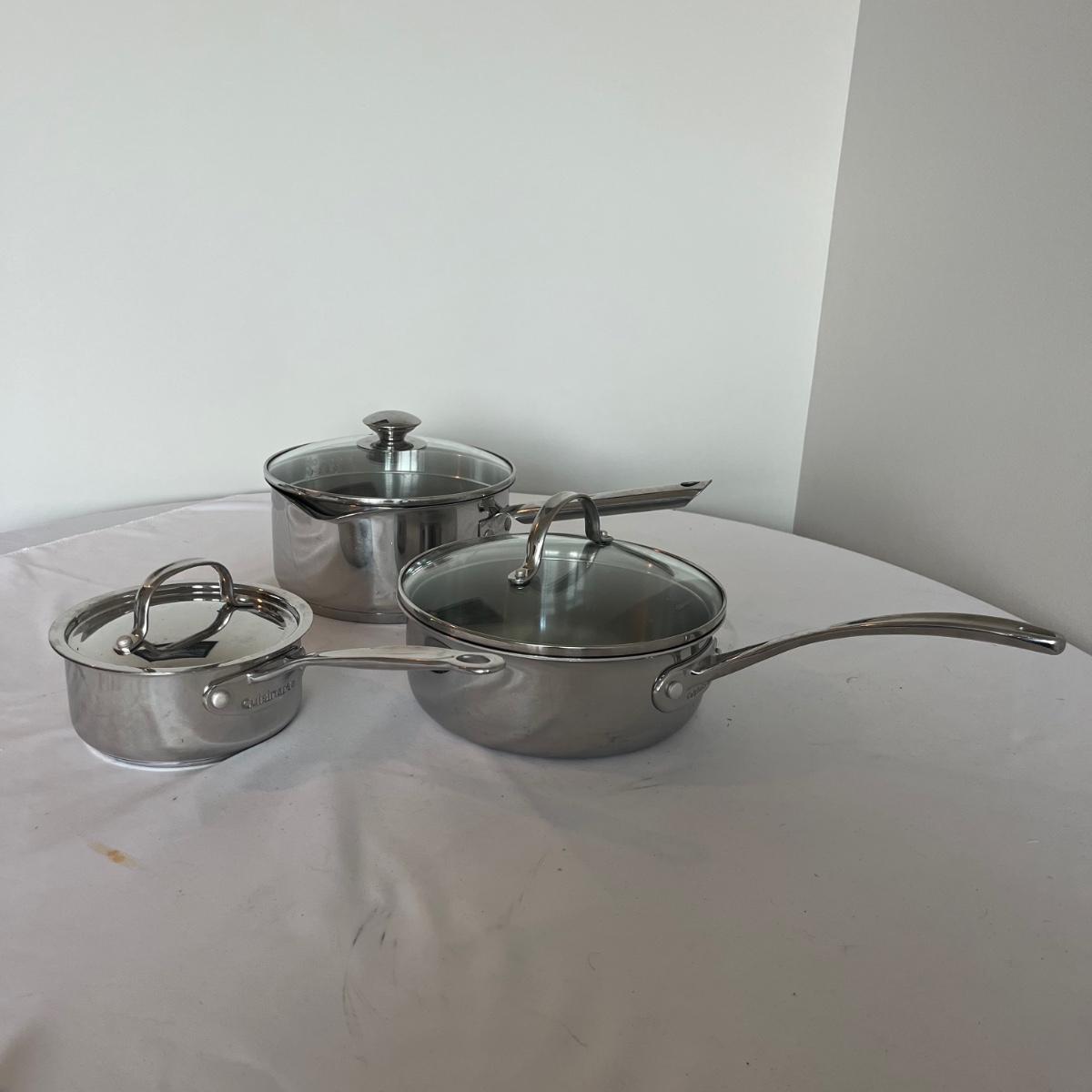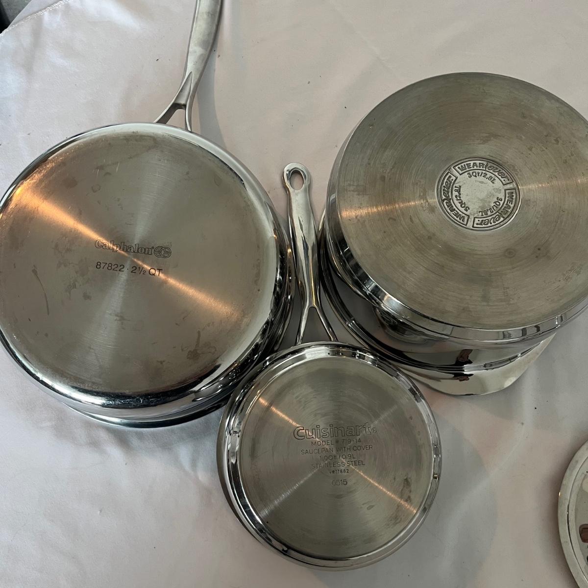 Lot includes three OXO frying pans, Ernesto 13” frying pan, Calphalon, Cuisinart and Wear-Ever pots with lids and a large Chefmate pot with lid.