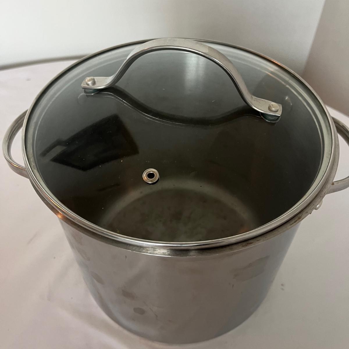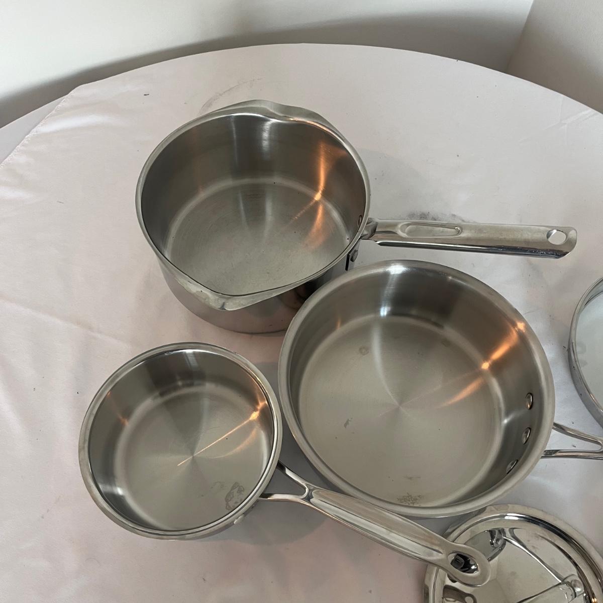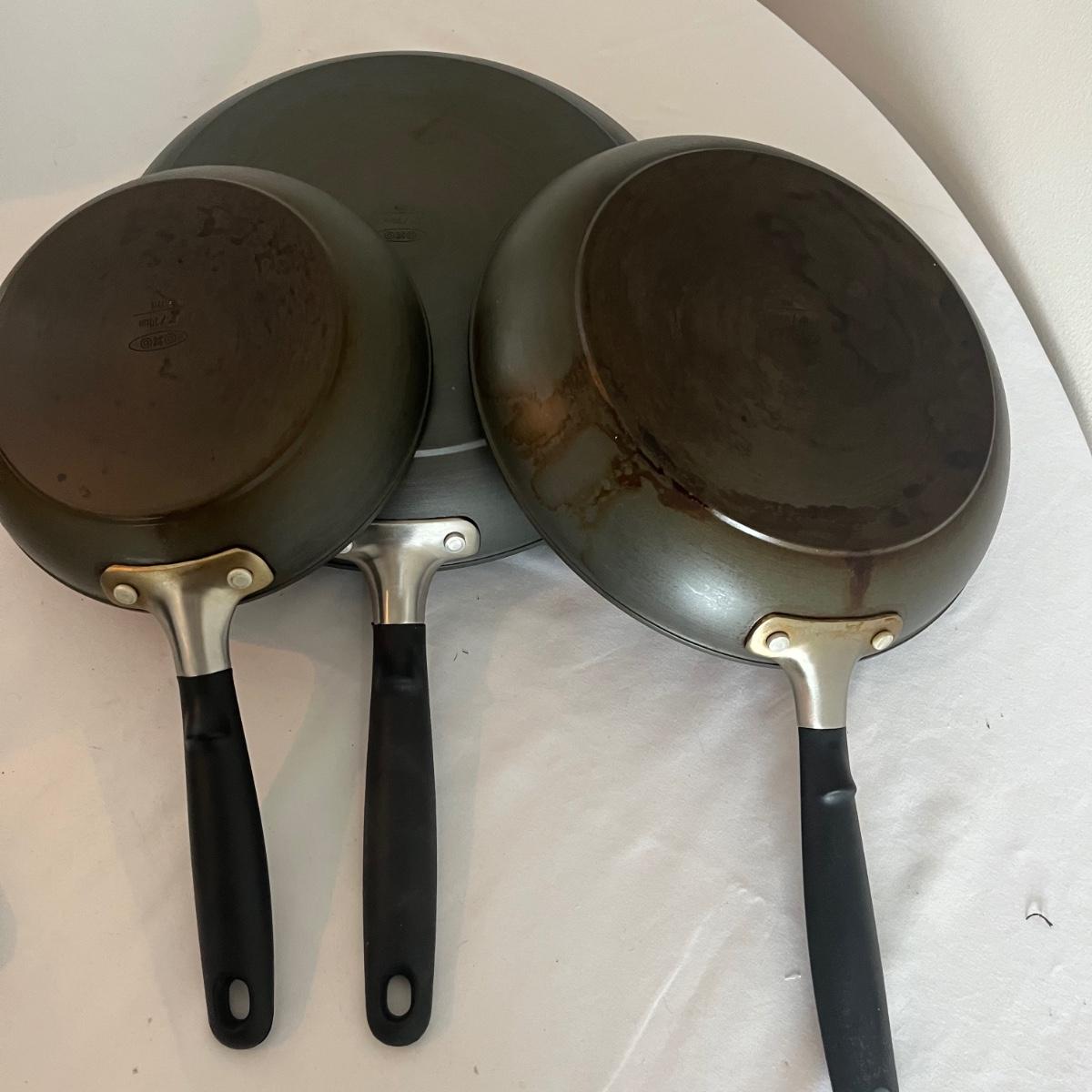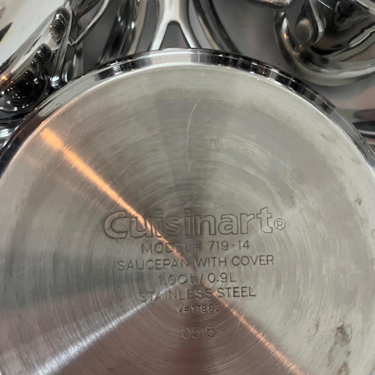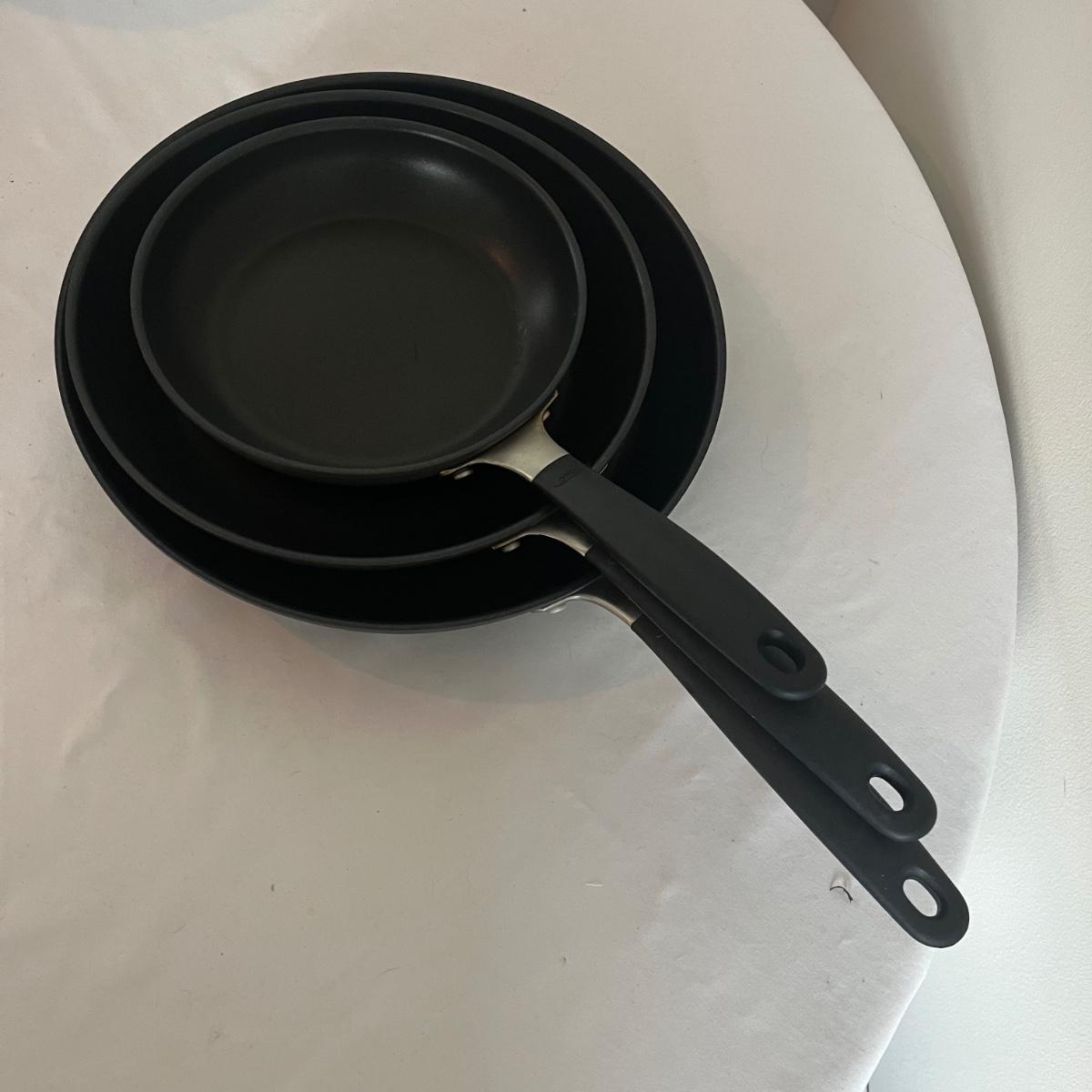 Lot includes three OXO frying pans, Ernesto 13” frying pan, Calphalon, Cuisinart and Wear-Ever pots with lids and a large Chefmate pot with lid.