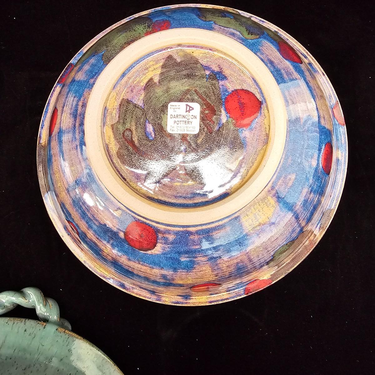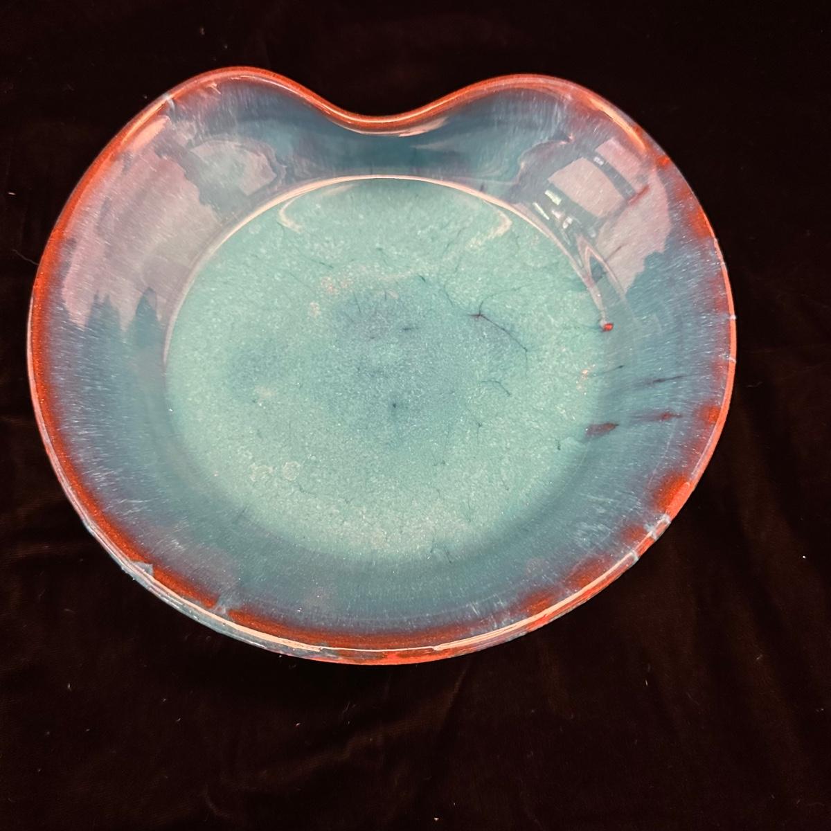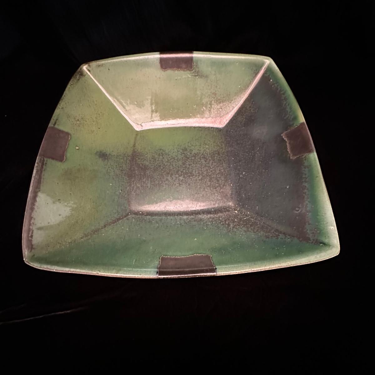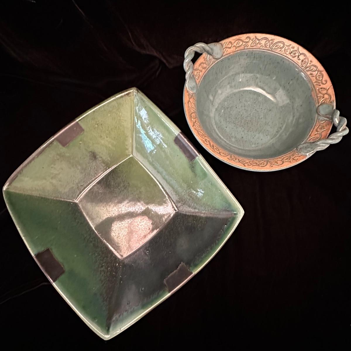Variety of pottery bowls in different colors and sizes from 9” to 14”. Square green plate measures 14” X 13”. Aqua, red and brown bowl measures 9”. Shipping available.