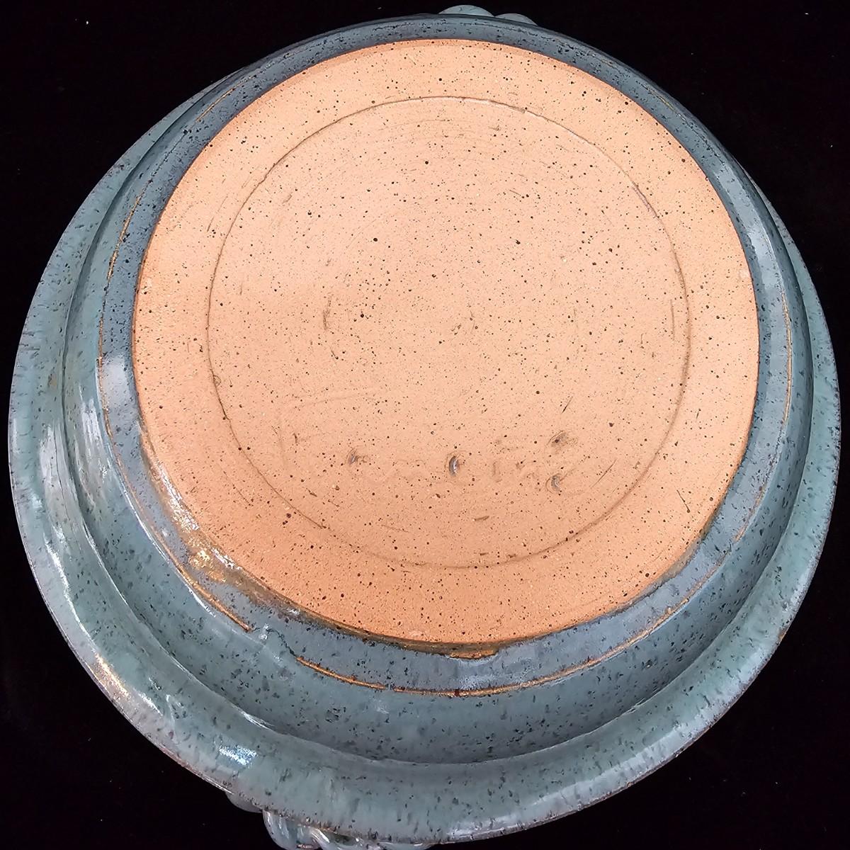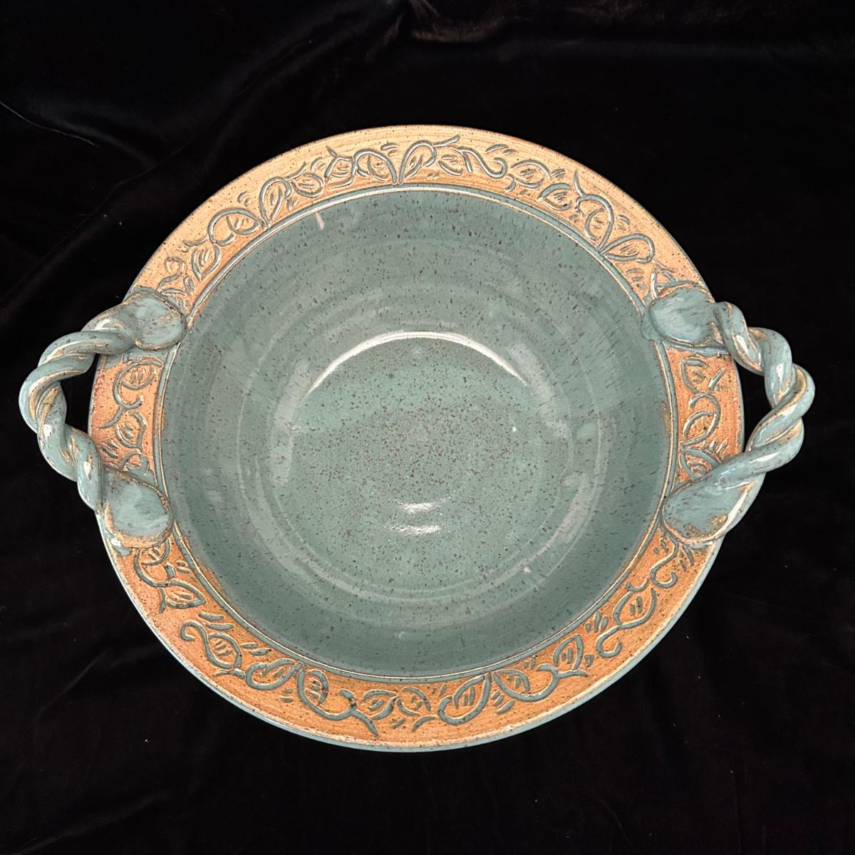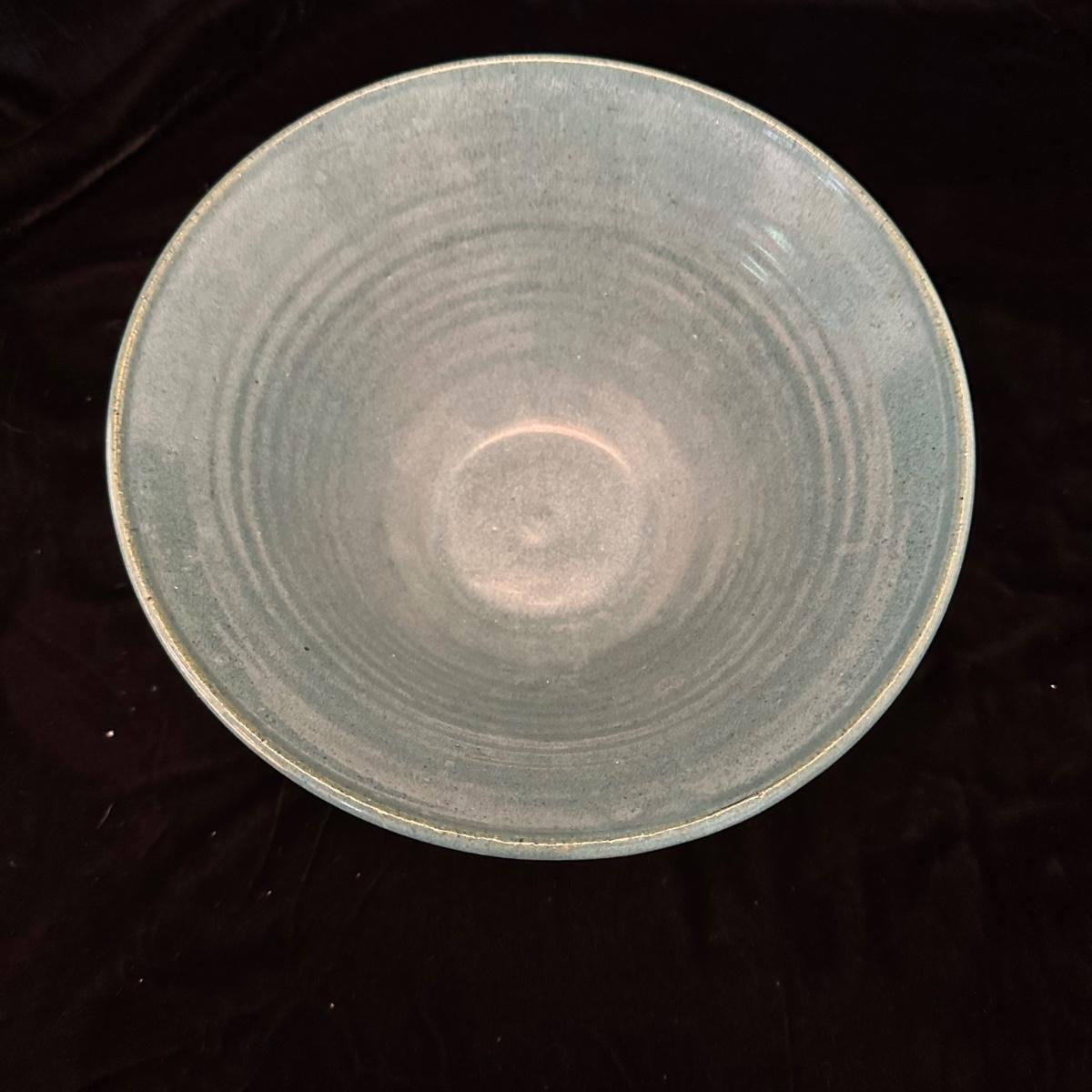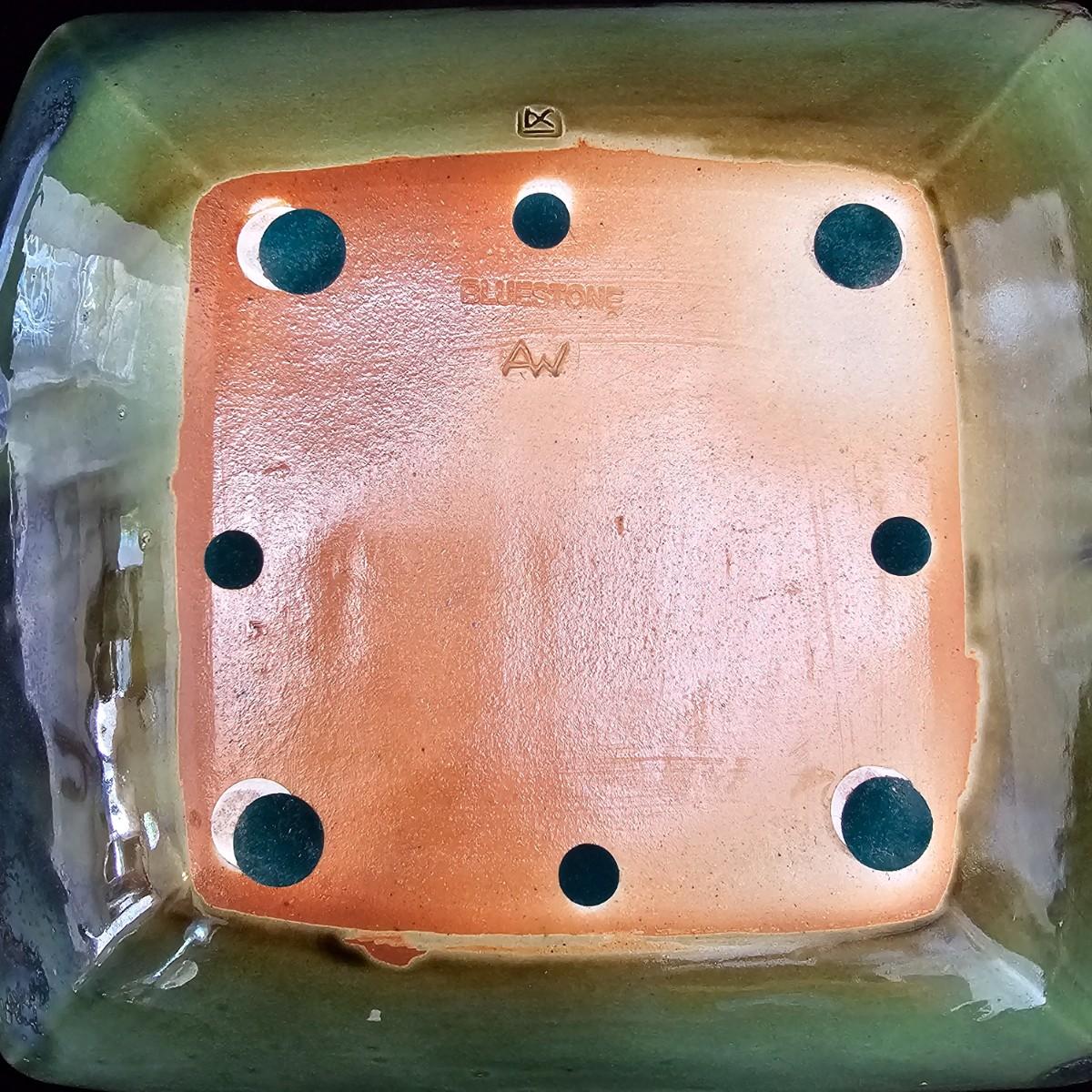 Variety of pottery bowls in different colors and sizes from 9” to 14”. Square green plate measures 14” X 13”. Aqua, red and brown bowl measures 9”. Shipping available.