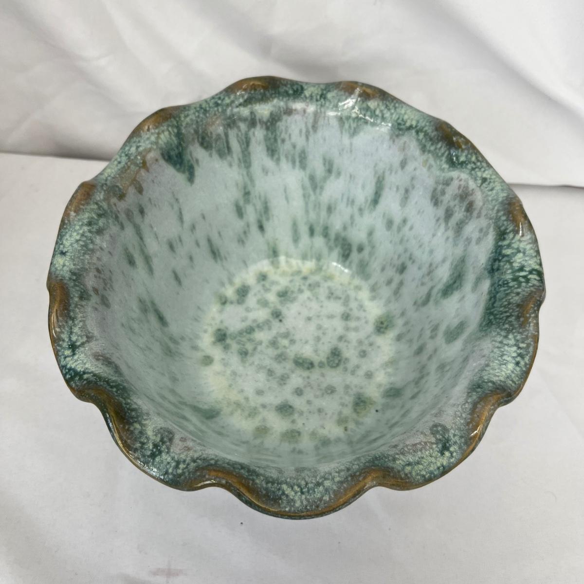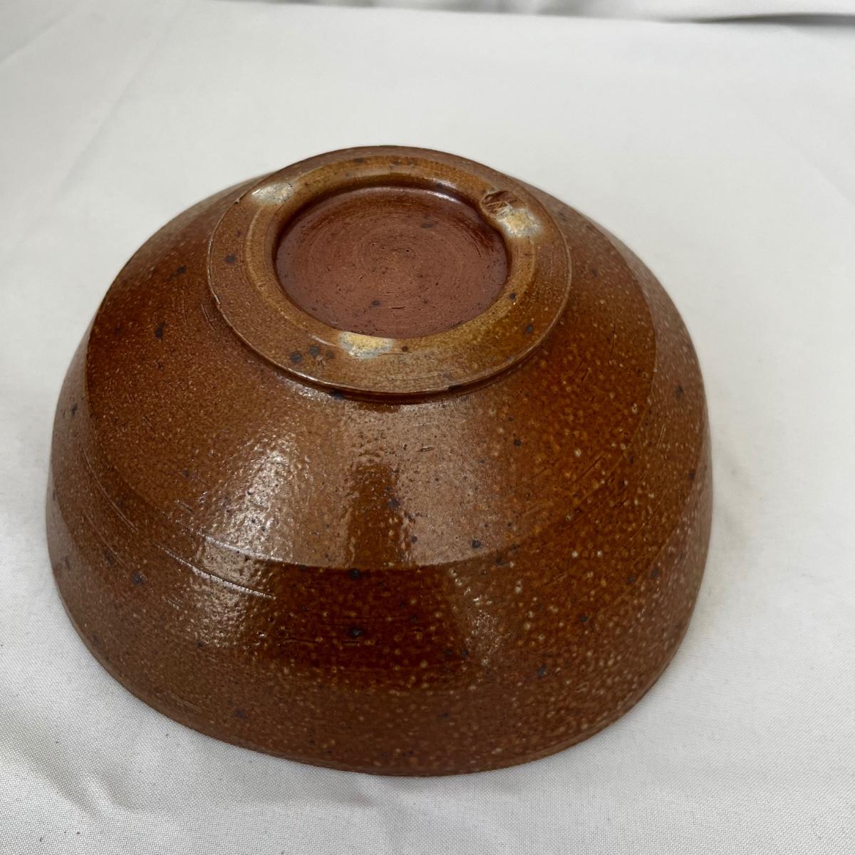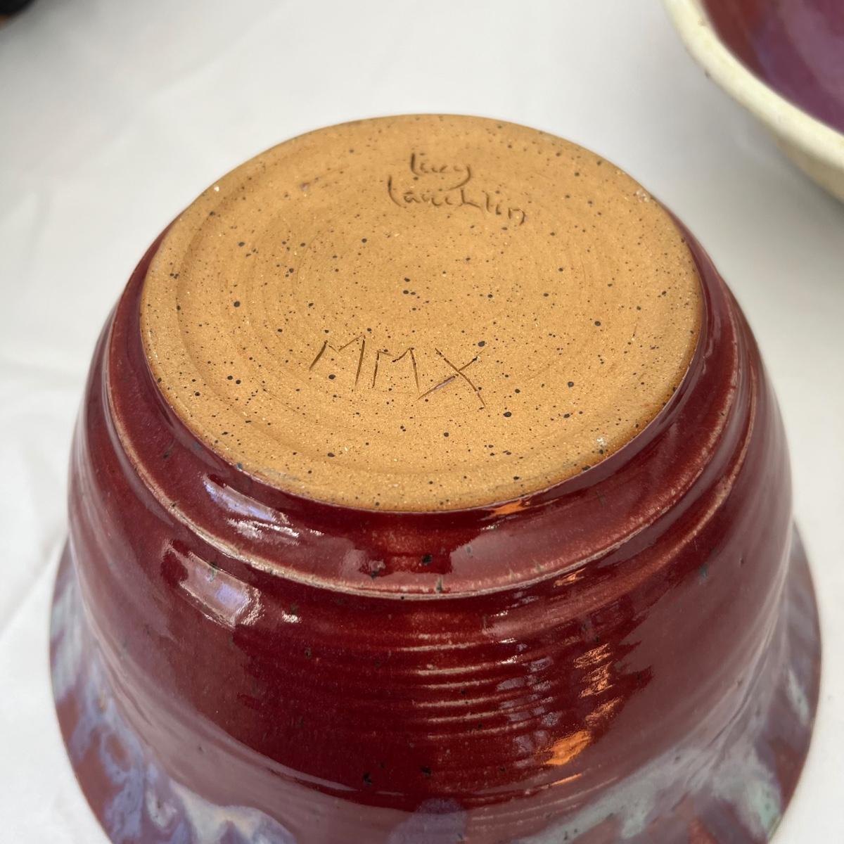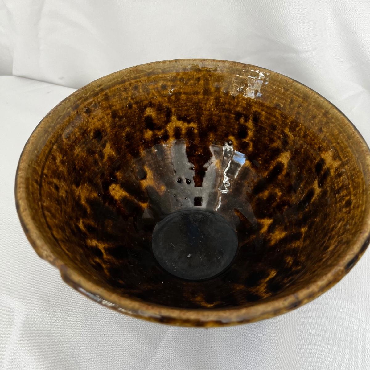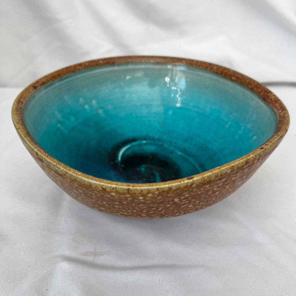Five large pottery bowls each with unique and attractive glazes. Largest bowl is the pink and oatmeal bowl which measures 12”D x 4”H. Three small bowls and a miniature coffee pot which measures 3.5”H round out the lot. See photos for signatures where present and note the brown bowl was chipped during production but the maker glazed over the chip.