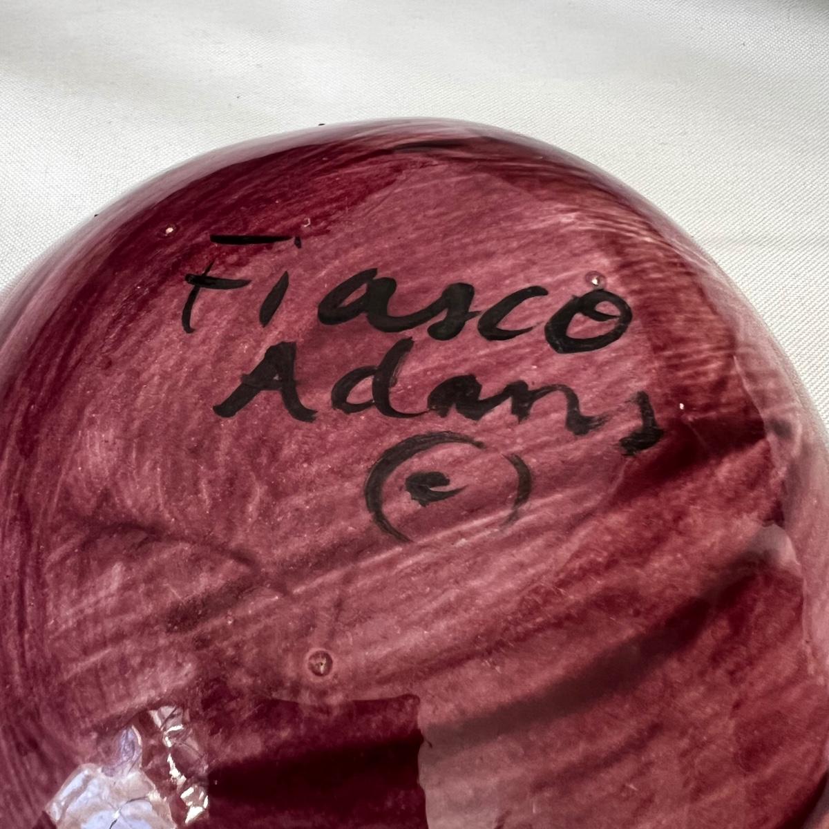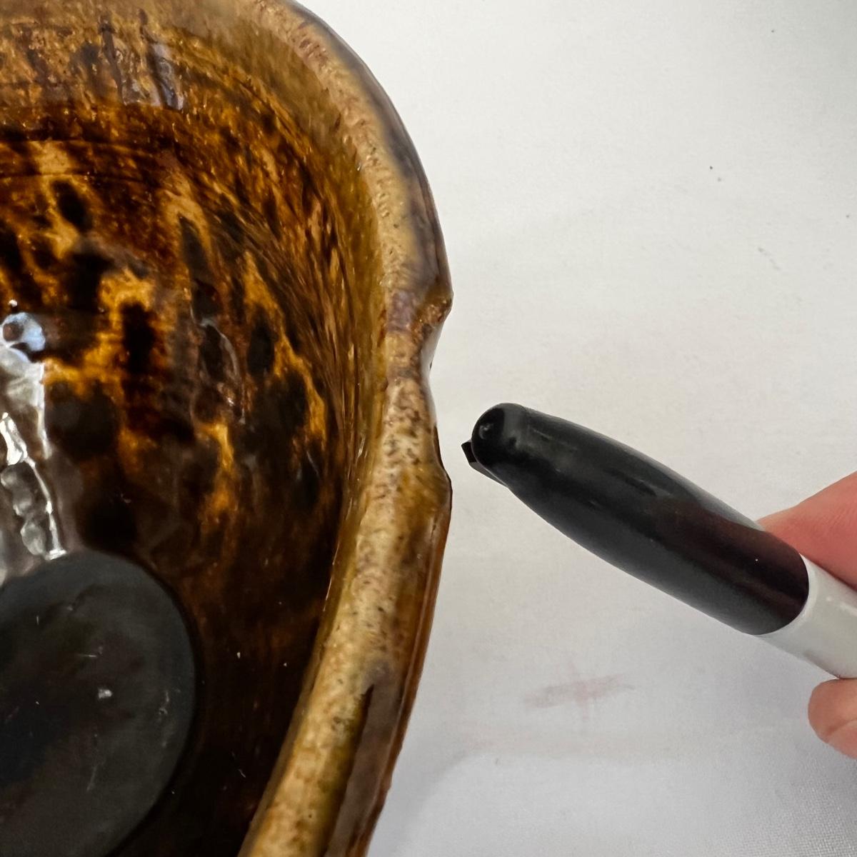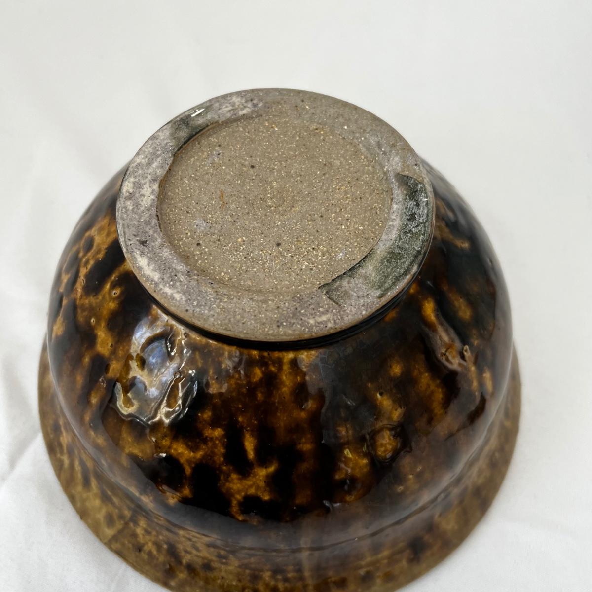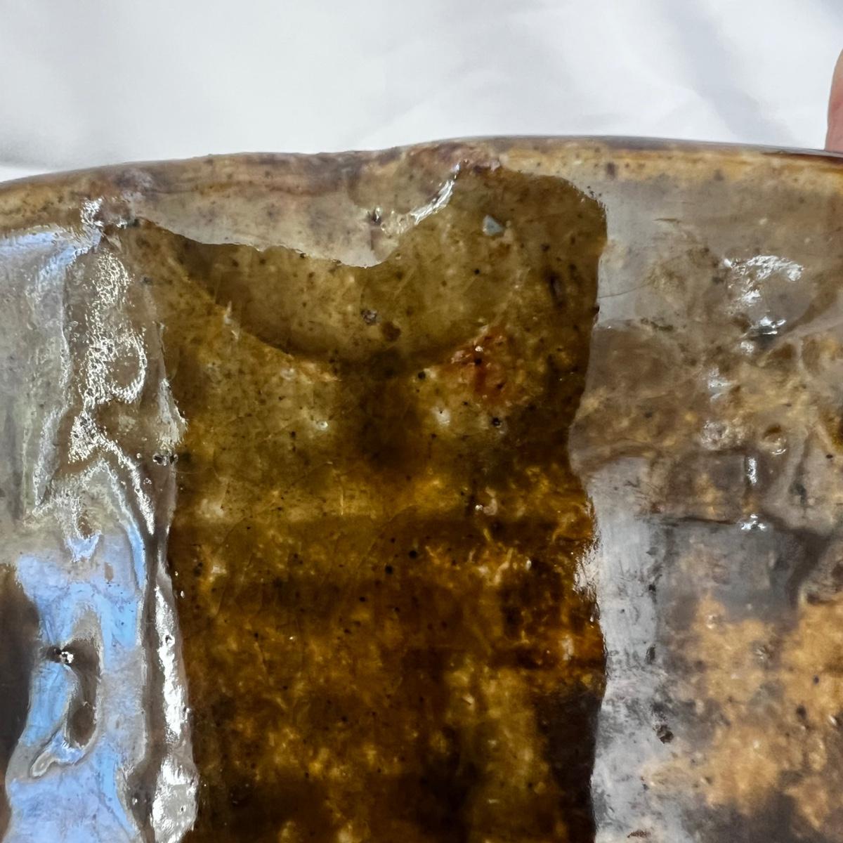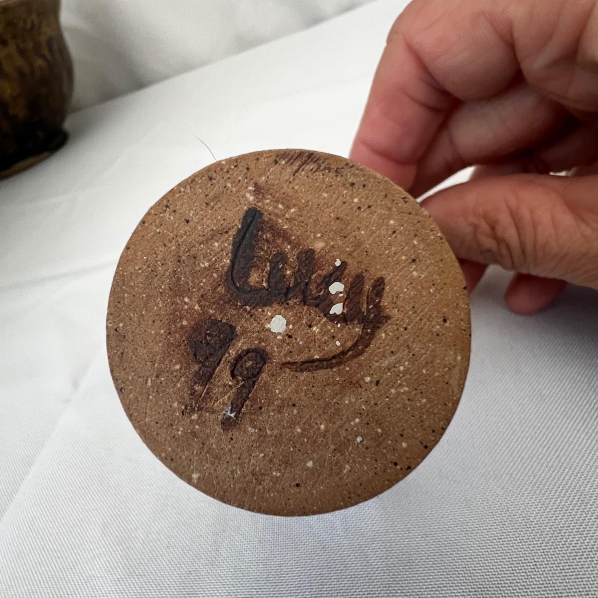 Five large pottery bowls each with unique and attractive glazes. Largest bowl is the pink and oatmeal bowl which measures 12”D x 4”H. Three small bowls and a miniature coffee pot which measures 3.5”H round out the lot. See photos for signatures where present and note the brown bowl was chipped during production but the maker glazed over the chip.