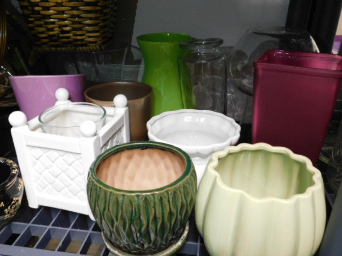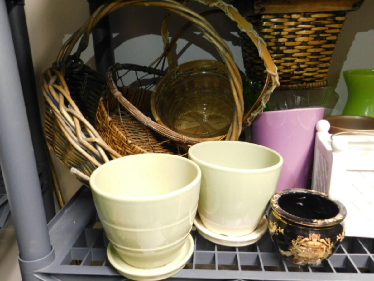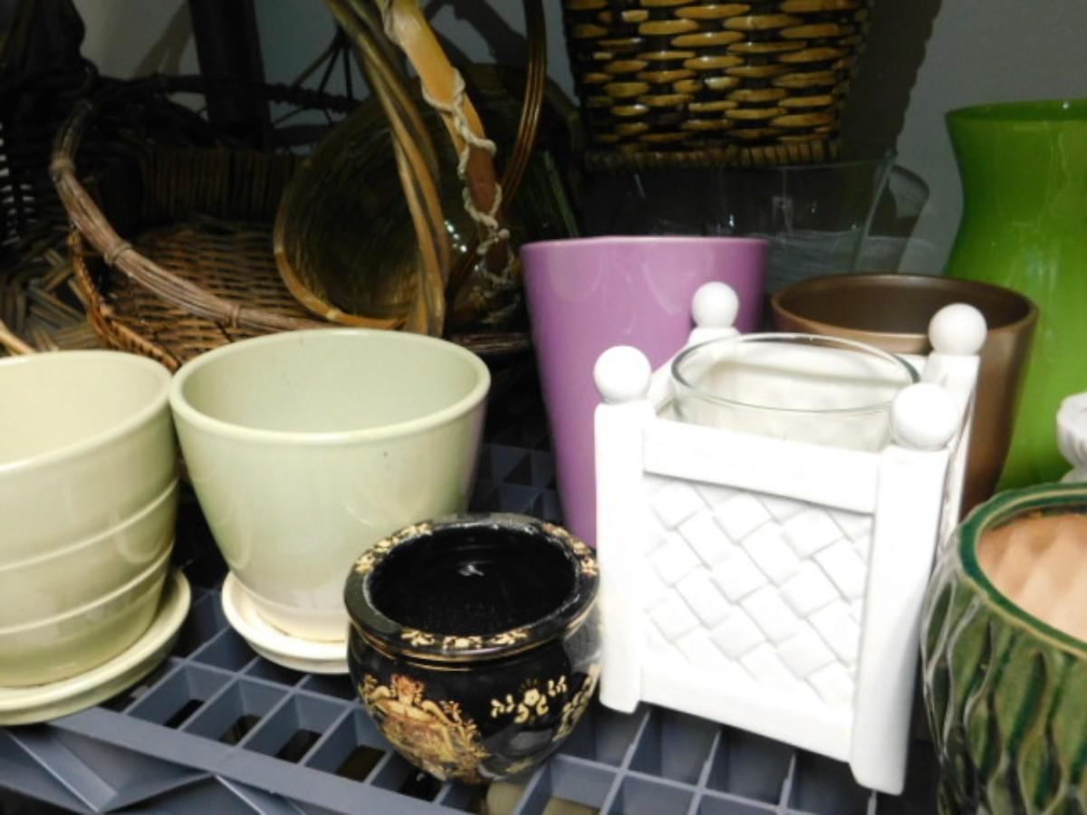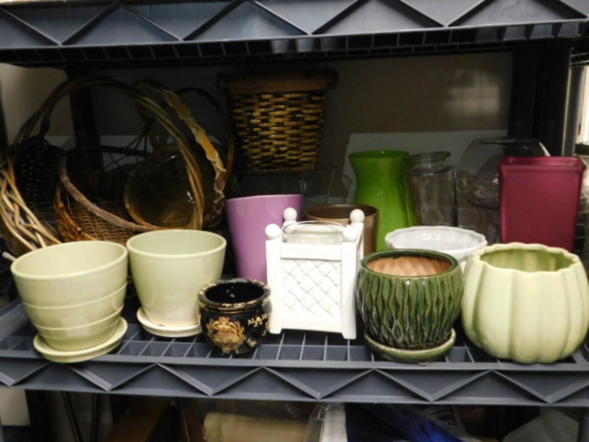 Assortment of Pottery, Glass, and Splint Wood Garden Planters
