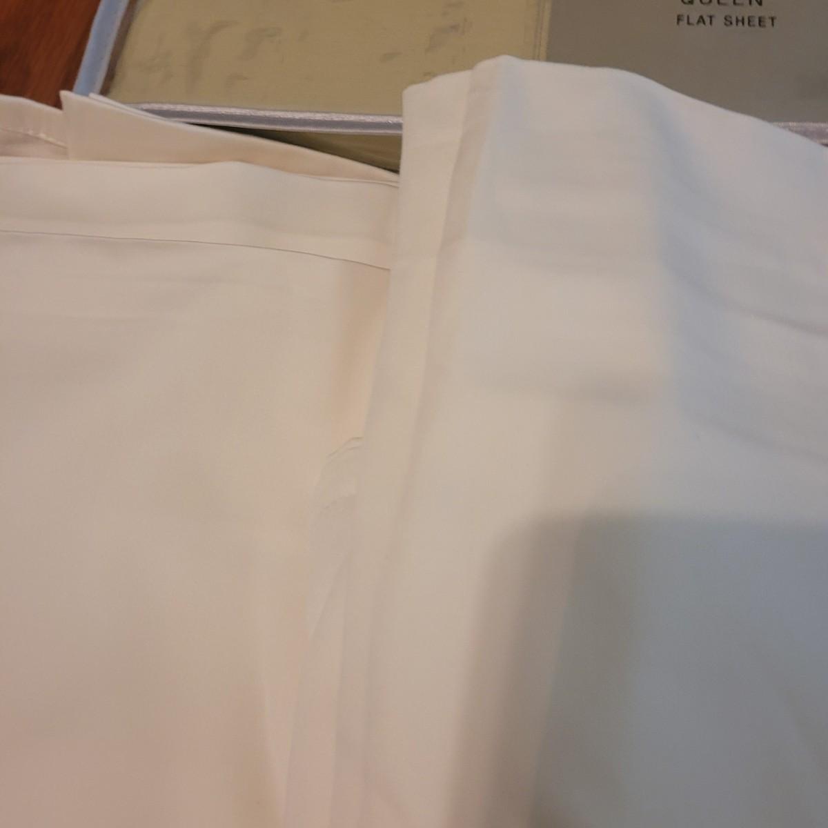 Three queen size flat sheets, two cream colored, one sage green (new in package). Shipping available.