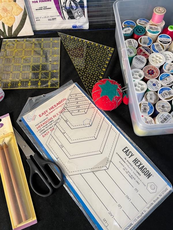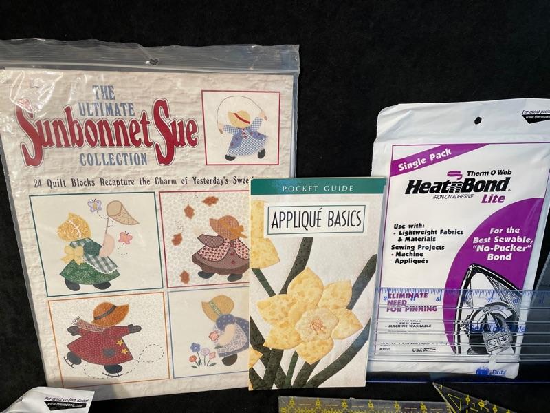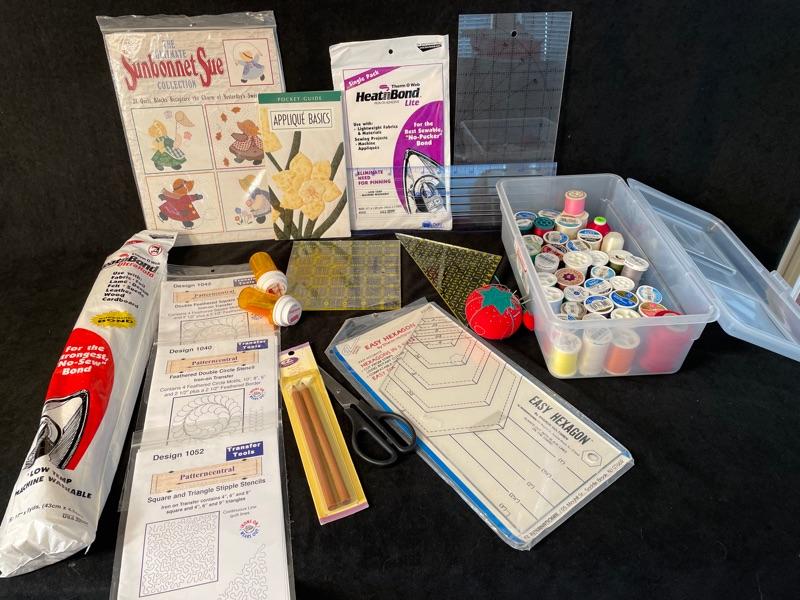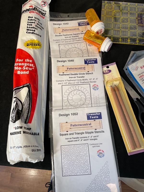 Fabric, various special rulers, scissors, rotary cutters, patterns and fusible interfacing.