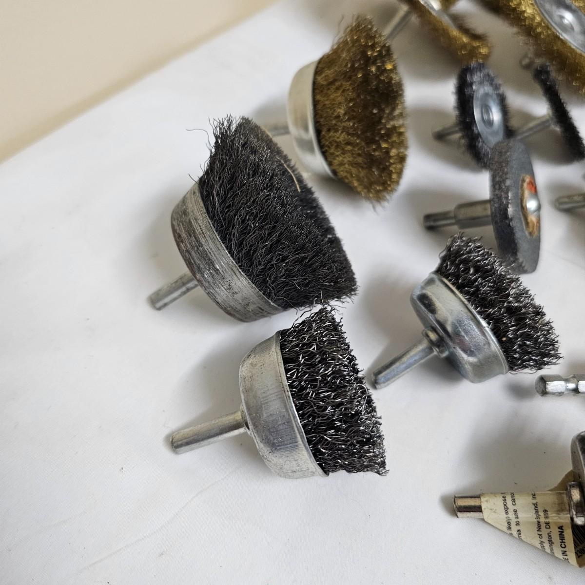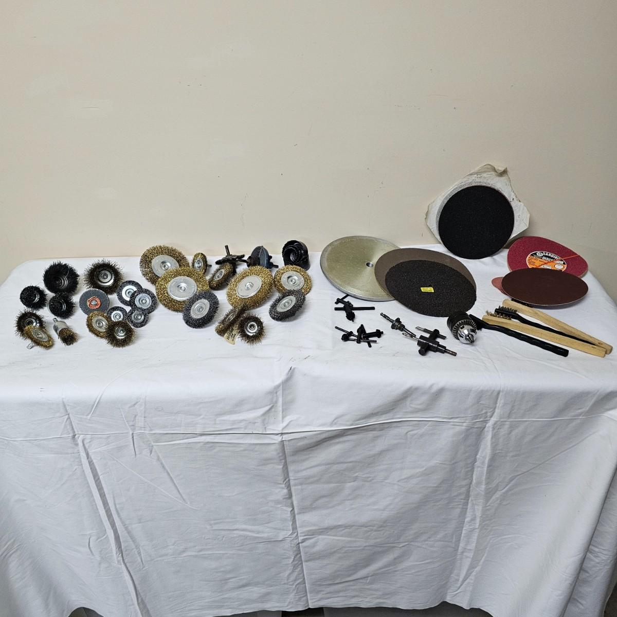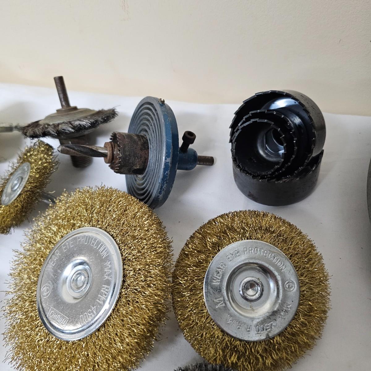 Round wire brushes for use in drills or other, mostly all new, range from 1.5"D to 4"D. One set of round holes saws with mandrel. A single Jacob's chuck with several chuck keys. One 8" aluminum backing disc and some adhesive sanding pads. See photos for details. Shipping available.