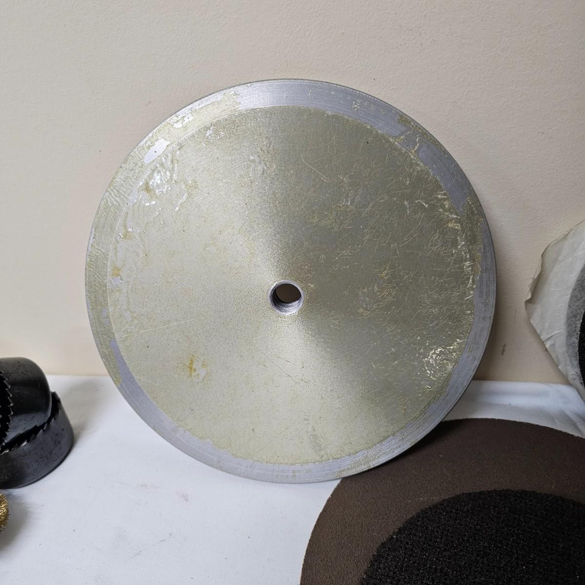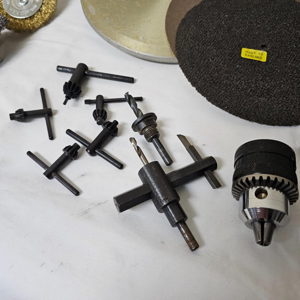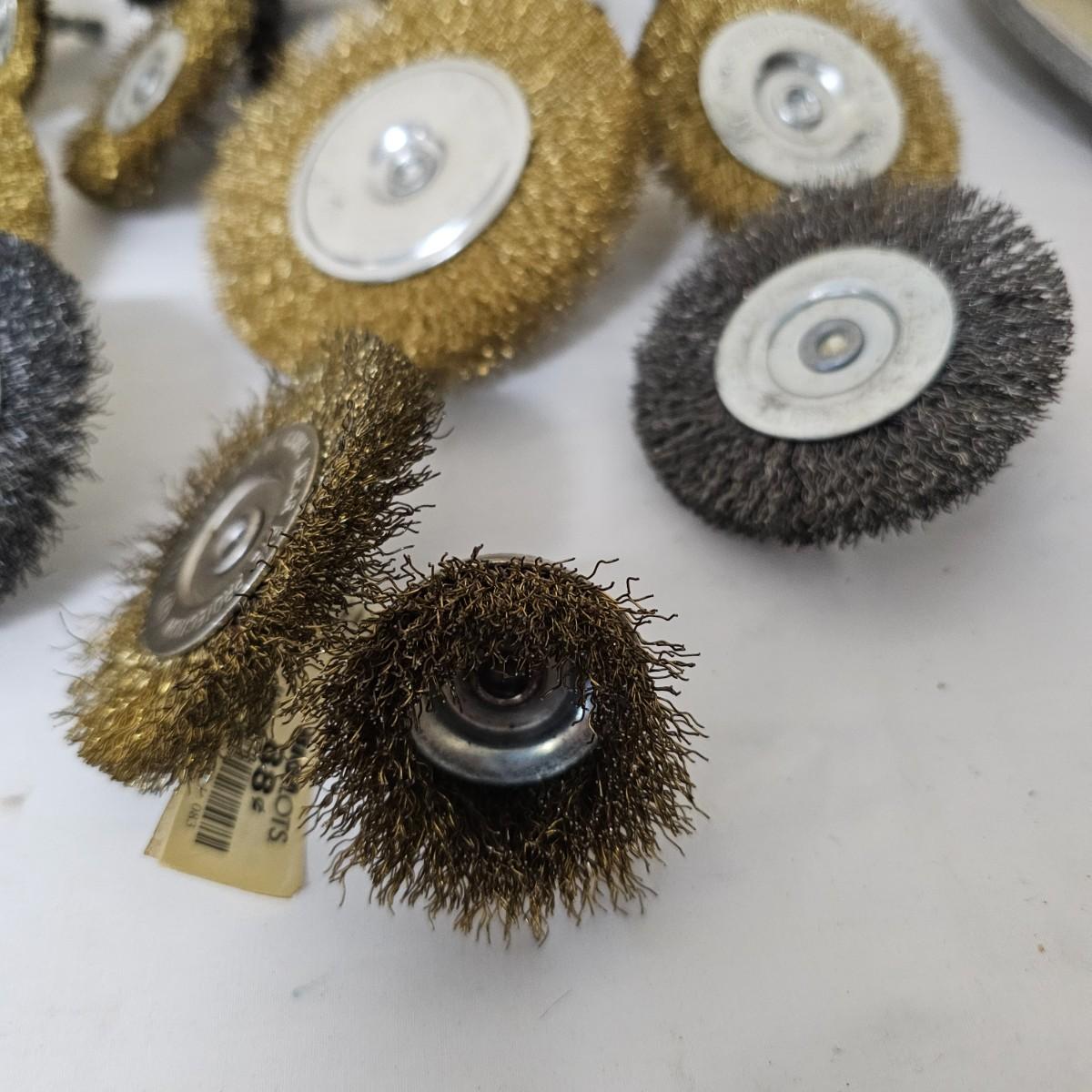 Round wire brushes for use in drills or other, mostly all new, range from 1.5"D to 4"D. One set of round holes saws with mandrel. A single Jacob's chuck with several chuck keys. One 8" aluminum backing disc and some adhesive sanding pads. See photos for details. Shipping available.