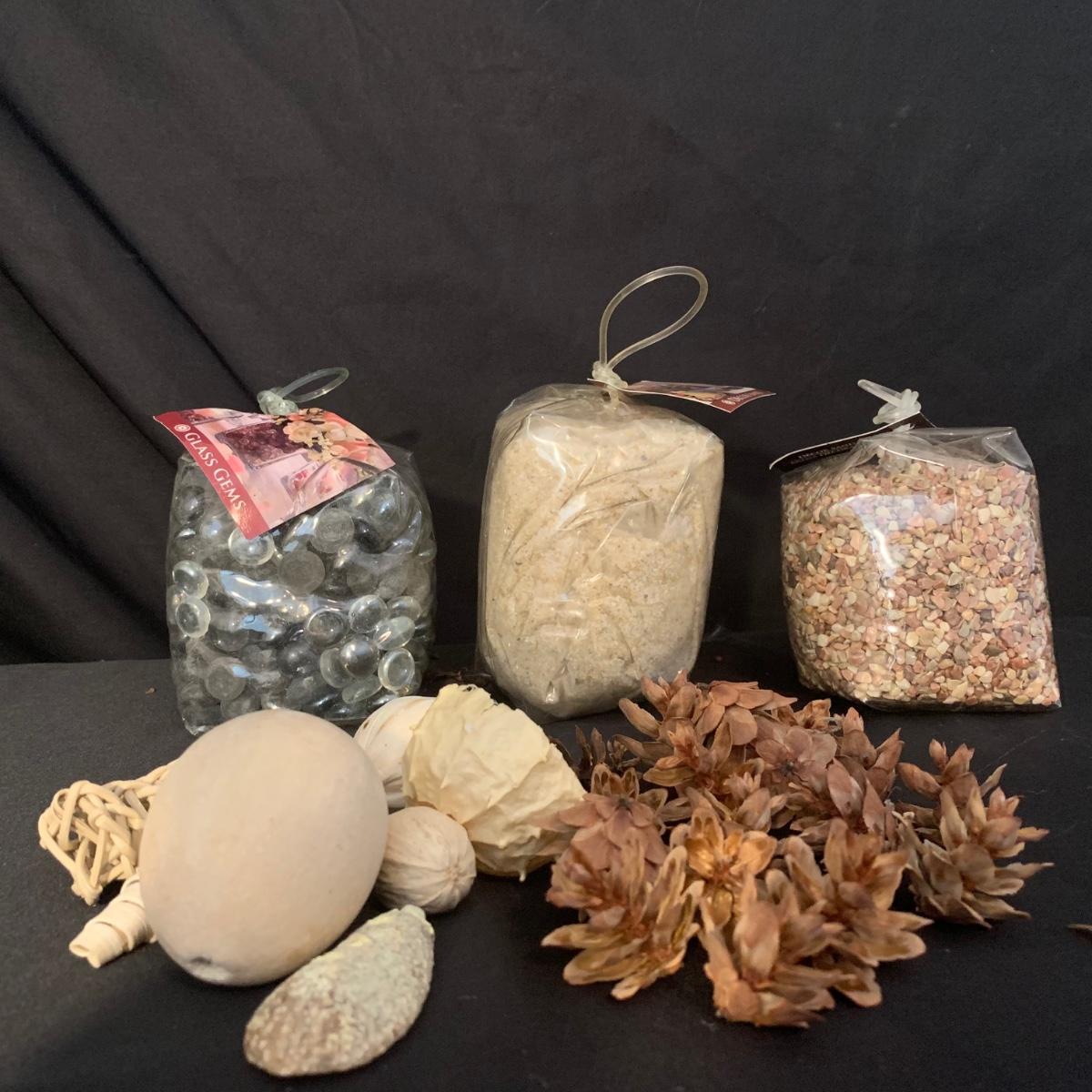 Assortment of Sand, Glass Gems, Pinecones, and Other Vase Fillers (AR-KW)