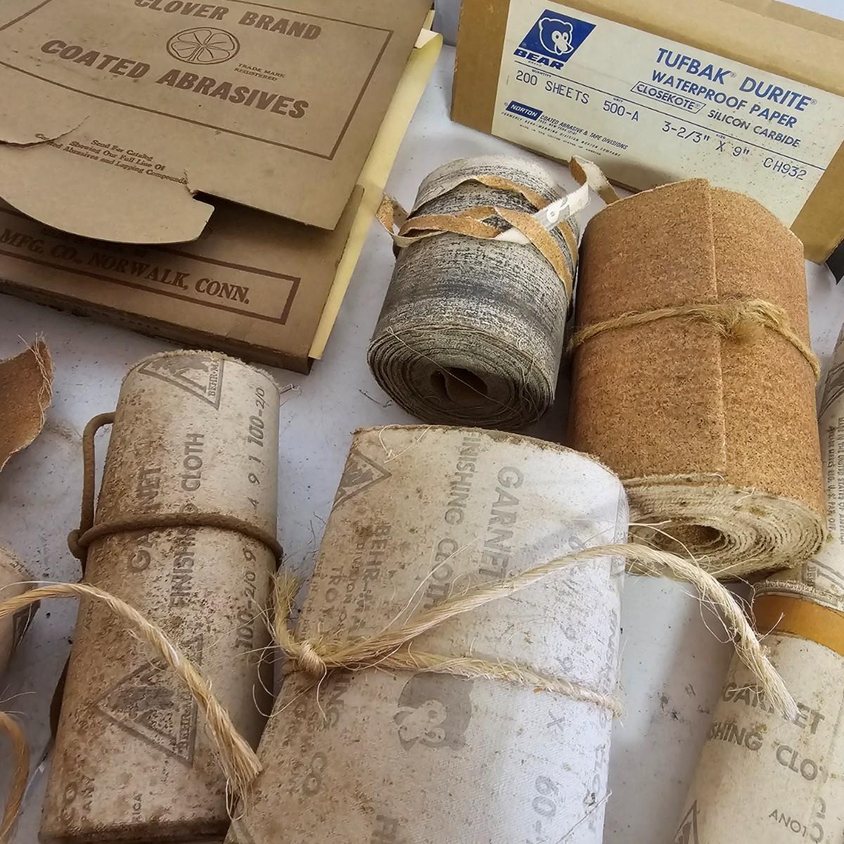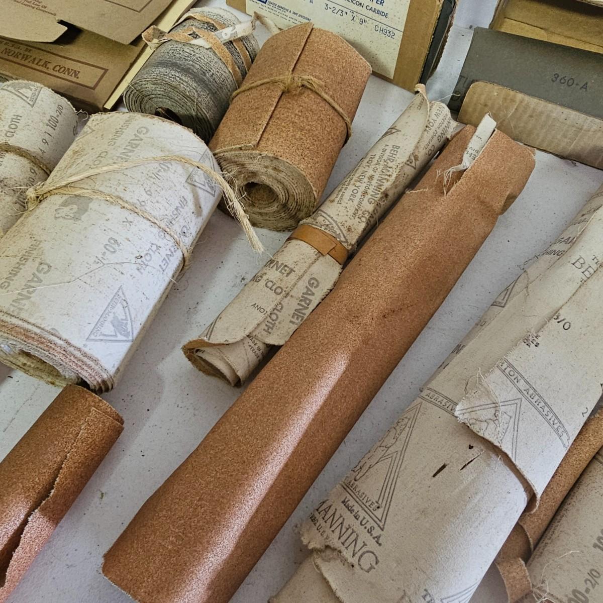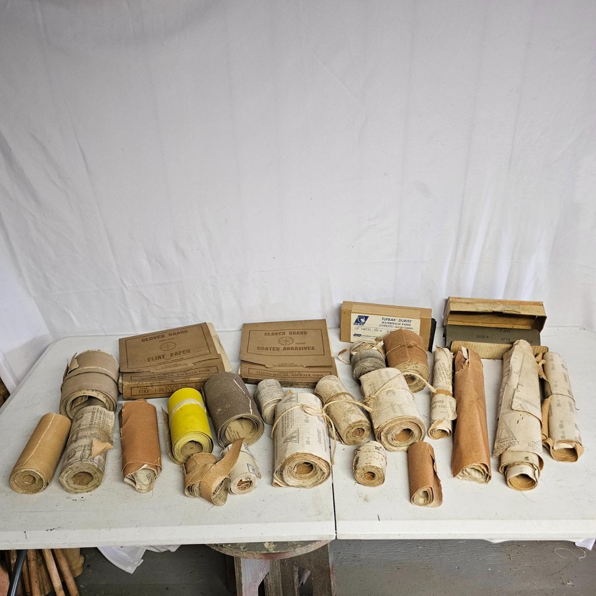 Several different grits, types of sanding paper, cloth & rolls. Grits range from 60 to 500, lots of finish items here. Roll size is 2.5" to 15" in width, no determination on length of items. Over 15 pieces plus boxes. See photos for details. Shipping available.