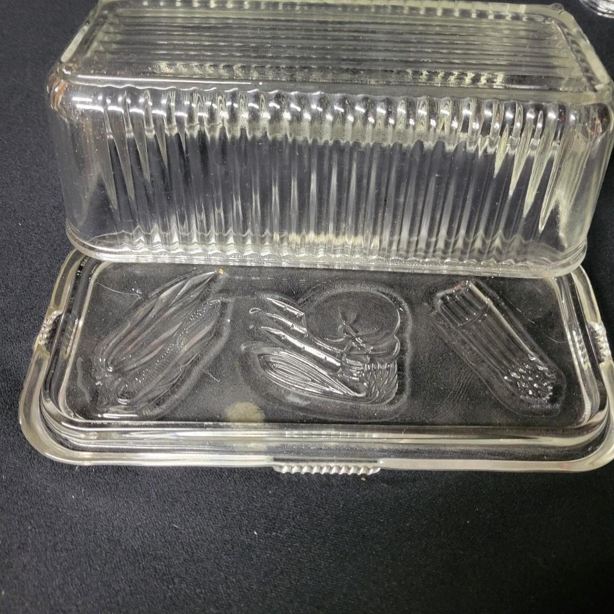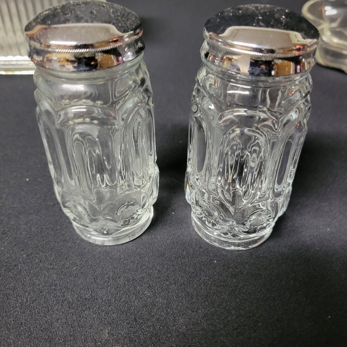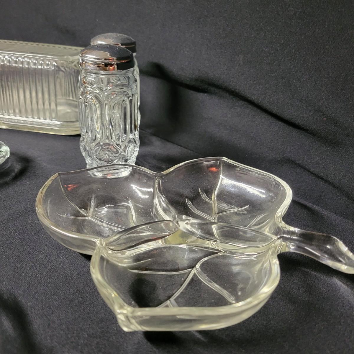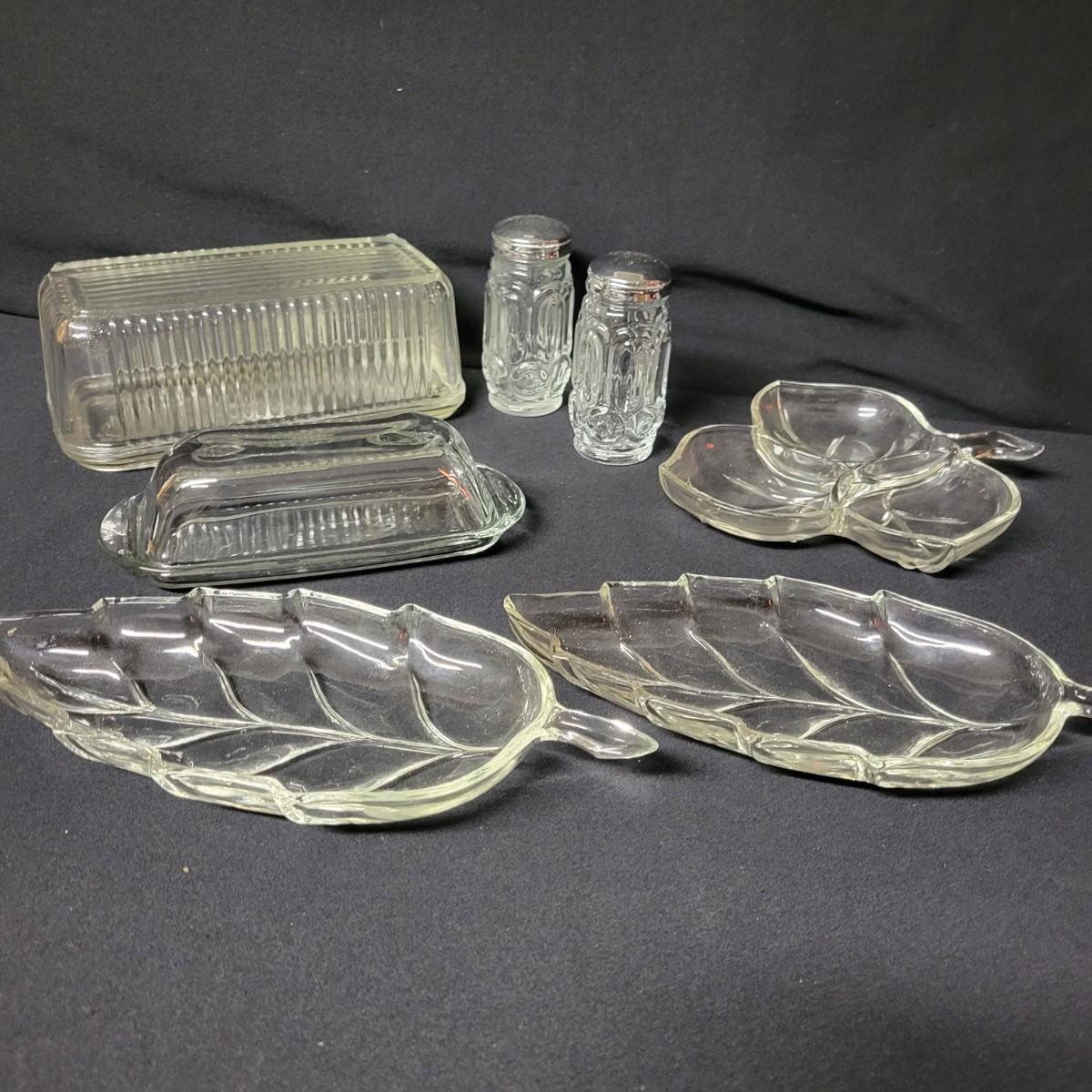 This lot consists of seven pieces of glass in excellent condition. Two butter dishes, salt and pepper shaker, and three candy dishes. Largest butter dish measures approximately 8" x 3.5" x 3" Shipping available